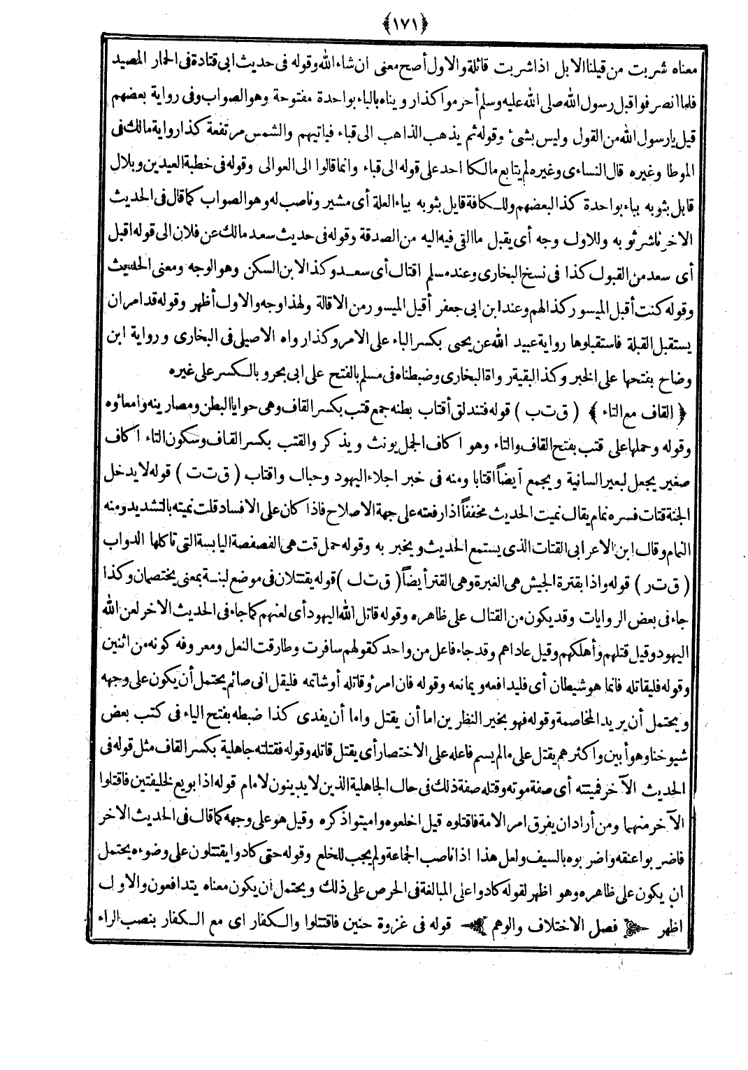 (ق ت ل) قَوْله يقتتلان فِي مَوضِع لبنة بِمَعْنى يختصمان وَكَذَا جَاءَ فِي بعض الرِّوَايَات وَقد يكون من الْقِتَال على ظَاهره وَقَوله قَاتل الله الْيَهُود أَي لعنهم كَمَا جَاءَ فِي الحَدِيث الآخر لعن الله الْيَهُود وَقيل قَتلهمْ وأهلكهم وَقيل عاداهم وَقد جَاءَ فَاعل من وَاحِد كَقَوْلِهِم سَافَرت وطارقت النَّعْل ومعروفه كَونه من اثْنَيْنِ وَقَوله فليقاتله فَإِنَّمَا هُوَ شَيْطَان أَي فليدافعه ويمانعه وَقَوله فَإِن امْرُؤ قَاتله أَو شاتمه فَلْيقل إِنِّي صَائِم يحْتَمل أَن يكون على وَجهه وَيحْتَمل أَن يُرِيد الْمُخَاصمَة وَقَوله فَهُوَ بِخَير النظرين أما ان يقتل وَأما أَن يفْدي كَذَا ضَبطه بِفَتْح الْيَاء فِي كتب بعض شُيُوخنَا وَهُوَ أبين وَأَكْثَرهم يقتل على مَا لم يسم فَاعله على الِاخْتِصَار أَي يقتل قَاتله وَقَوله فَقتلته جَاهِلِيَّة بِكَسْر الْقَاف مثل قَوْله فِي الحَدِيث الآخر فميتته أَي صفة مَوته وَقَتله صفة ذَلِك فِي حَال الْجَاهِلِيَّة الَّذين لَا يدينون لإِمَام قَوْله إِذا بُويِعَ لخليفتين فَاقْتُلُوا الآخر مِنْهُمَا وَمن أَرَادَ أَن يفرق أَمر الْأمة فَاقْتُلُوهُ قيل اخلعوه وأميتوا ذكره وَقيل هُوَ على وَجهه كَمَا قَالَ فِي الحَدِيث الآخر فاضربوا عُنُقه واضربوه بِالسَّيْفِ وَلَعَلَّ هَذَا إِذا ناصب الْجَمَاعَة وَلم يجب لِلْخلعِ وَقَوله حَتَّى كَادُوا يقتتلون على وضوءه يحْتَمل أَن يكون على ظَاهره وَهُوَ أظهر لقَوْله كَادُوا على الْمُبَالغَة فِي الْحِرْص على ذَلِك وَيحْتَمل أَن يكون مَعْنَاهُ يتدافعون وَالْأول أظهر.
