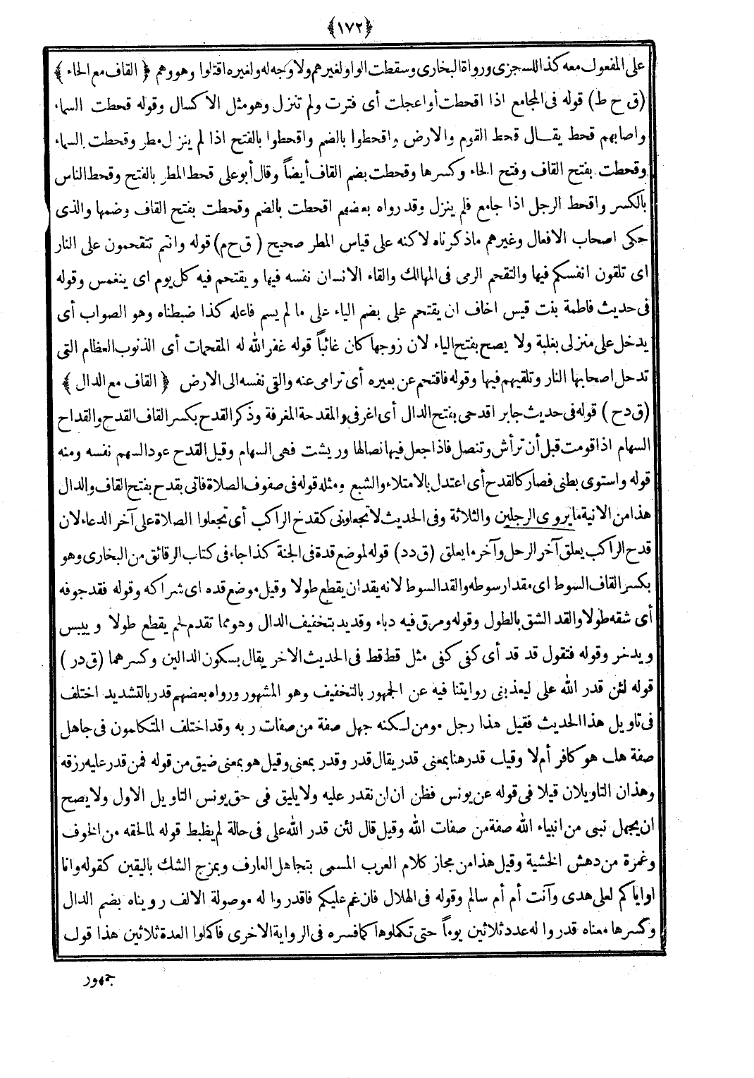 (ق د ر) قَوْله لَئِن قدر الله على ليعذبني روايتنا فِيهِ عَن الْجُمْهُور بِالتَّخْفِيفِ وَهُوَ الْمَشْهُور وَرَوَاهُ بَعضهم قدر بِالتَّشْدِيدِ اخْتلف فِي تَأْوِيل هَذَا الحَدِيث فَقيل هَذَا رجل مُؤمن لكنه جهل صفة من صِفَات ربه وَقد اخْتلف المتكلمون فِي جَاهِل صفة هَل هُوَ كَافِر أم لَا وَقيل قدر هُنَا بِمَعْنى قدر يُقَال قدر وَقدر بِمَعْنى وَقيل هُوَ بِمَعْنى ضيق من قَوْله فَمن قدر عَلَيْهِ رزقه وَهَذَانِ التأويلان قيلا فِي قَوْله عَن يُونُس فَظن أَن لن نقدر عَلَيْهِ وَلَا يَلِيق فِي حق يُونُس التَّأْوِيل الأول وَلَا يَصح أَن يجهل نَبِي من أَنْبيَاء الله صفة من صِفَات الله وَقيل قَالَ لَئِن قدر الله عَليّ فِي حَالَة لم يظبط قَوْله لما لحقه من الْخَوْف وغمرة من دهش الخشية وَقيل هَذَا من مجَاز كَلَام الْعَرَب الْمُسَمّى بتجاهل الْعَارِف وبمزج الشَّك بِالْيَقِينِ كَقَوْلِه وَإِنَّا أَو إيَّاكُمْ لعلى هدى وآنت أم أم سَالم وَقَوله فِي الْهلَال فَإِن غم عَلَيْكُم فاقدروا لَهُ مَوْصُولَة الْألف روينَاهُ بِضَم الدَّال وَكسرهَا مَعْنَاهُ قدرُوا لَهُ عدد ثَلَاثِينَ يَوْمًا حَتَّى تكملوها كَمَا فسره فِي الرِّوَايَة الْأُخْرَى فاكملوا الْعدة ثَلَاثِينَ هَذَا قَول