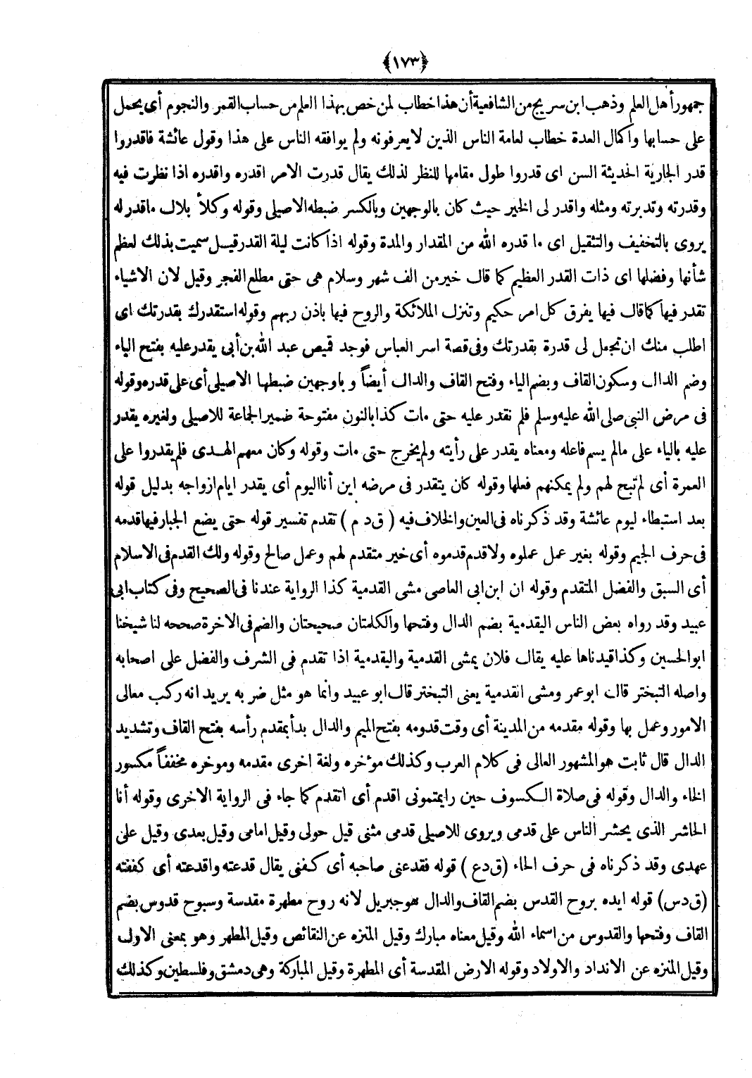 جُمْهُور أهل الْعلم وَذهب ابْن سُرَيج من الشَّافِعِيَّة أَن هَذَا خطاب لمن خص بِهَذَا الْعلم من حِسَاب الْقَمَر والنجوم أَي يحمل على حِسَابهَا وإكمال الْعدة خطاب لعامة النَّاس الَّذين لَا يعرفونه وَلم يُوَافقهُ النَّاس على هَذَا وَقَول عَائِشَة فاقدروا قدر الْجَارِيَة الحديثة السن أَي قدرُوا طول مقَامهَا للنَّظَر لذَلِك يُقَال قدرت الْأَمر أقدره وأقدره إِذا نظرت فِيهِ وَقدرته وتدبرته وَمثله وأقدر لي الْخَيْر حَيْثُ كَانَ بِالْوَجْهَيْنِ وبالكسر ضَبطه الْأصيلِيّ وَقَوله وكلأ بِلَال مَا قدر لَهُ يرْوى بِالتَّخْفِيفِ والتثقيل أَي مَا قدره الله من الْمِقْدَار والمدة وَقَوله إِذا كَانَت لَيْلَة الْقدر قيل سميت بذلك لعظم شَأْنهَا وفضلها أَي ذَات الْقدر الْعَظِيم كَمَا قَالَ خير من ألف شهر وَسَلام هِيَ حَتَّى مطلع الْفجْر وَقيل لِأَن الْأَشْيَاء تقدر فِيهَا كَمَا قَالَ فِيهَا يفرق كل أَمر حَكِيم وتنزل الْمَلَائِكَة وَالروح فِيهَا بِإِذن رَبهم وَقَوله استقدرك بقدرتك أَي اطلب مِنْك أَن تجْعَل لي قدرَة بقدرتك وَفِي قصَّة أسر الْعَبَّاس فَوجدَ قَمِيص عبد الله بن أبي يقدر عَلَيْهِ بِفَتْح الْيَاء وَضم الدَّال وَسُكُون الْقَاف وبضم الْيَاء وَفتح الْقَاف وَالدَّال أَيْضا وبأوجهين ضَبطهَا الْأصيلِيّ أَي على قدره وَقَوله فِي مرض النَّبِي (صلى الله عَلَيْهِ وَسلم) فَلم نقدر عَلَيْهِ حَتَّى مَاتَ كَذَا بالنُّون مَفْتُوحَة ضمير الْجَمَاعَة للأصيلي وَلغيره يقدر عَلَيْهِ بِالْيَاءِ على مَا لم يسم فَاعله وَمَعْنَاهُ يقدر على رَأَيْته وَلم يخرج حى مَاتَ وَقَوله وَكَانَ مَعَهم الْهدى فَلم يقدروا على الْعمرَة أَي لم تبح لَهُم وَلم يُمكنهُم فعلهَا وَقَوله كَانَ يتَقَدَّر فِي مَرضه أَي أَنا الْيَوْم أَي يقدر أَيَّام أَزوَاجه بِدَلِيل قَوْله بعد استبطاء ليَوْم عَائِشَة وَقد ذَكرْنَاهُ فِي الْعين وَالْخلاف فِيهِ