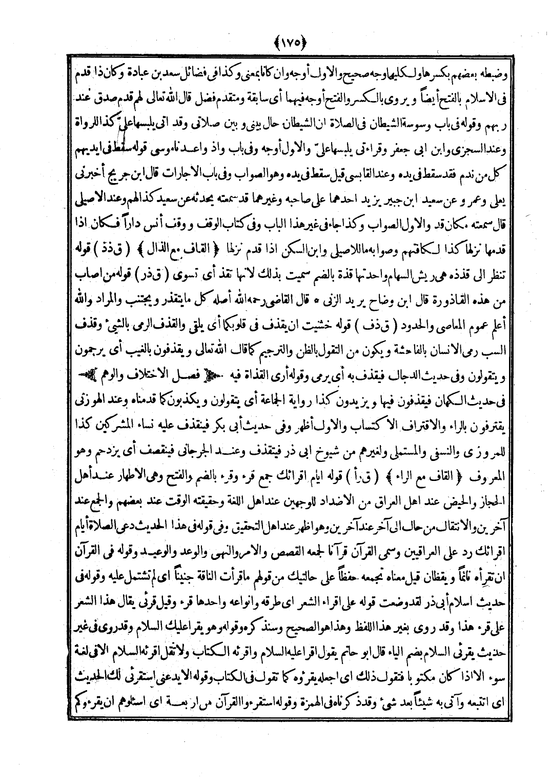 (ق ر أ) قَوْله أَيَّام إقرائك جمع قرء وقرء بِالضَّمِّ وَالْفَتْح وَهِي الإطهار عِنْد أهل الْحجاز وَالْحيض عِنْد أهل الْعرَاق من الأضداد للوجهين عِنْد أهل اللُّغَة وَحَقِيقَته الْوَقْت عِنْد بَعضهم وَالْجمع عِنْد آخَرين والانتقال من حَال إِلَى آخر عِنْد آخَرين وَهُوَ أظهر عِنْد أهل التَّحْقِيق وَفِي قَوْله فِي هَذَا الحَدِيث دعى الصَّلَاة أَيَّام إقرائك رد على الْعِرَاقِيّين وَسمي الْقُرْآن قُرْآنًا لجمعه الْقَصَص وَالْأَمر وَالنَّهْي والوعد والوعيد وَقَوله فِي الْقُرْآن أَن تَقْرَأهُ نَائِما ويقظان قيل مَعْنَاهُ تجمعه حفظا على حالتيك من قَوْلهم مَا قَرَأت النَّاقة جَنِينا أَي لم تشْتَمل عَلَيْهِ وَقَوله فِي حَدِيث إِسْلَام أبي ذَر لقد وضعت قَوْله على إقراء الشّعْر أَي طرقه وأنواعه وأحدها قرء وَقيل قرئَ يُقَال هَذَا الشّعْر على قرء هَذَا وَقد روى بِغَيْر هَذَا اللَّفْظ وَهَذَا هُوَ الصَّحِيح وسنذكره وَقَوله وَهُوَ يقْرَأ عَلَيْك السَّلَام وَقد روى فِي غير حَدِيث يقرئي السَّلَام بِضَم الْيَاء قَالَ أَبُو حَاتِم يَقُول اقْرَأ عَلَيْهِ السَّلَام واقرئه الْكتاب وَلَا تقل أقرئه السَّلَام إِلَّا فِي لُغَة سوء إِلَّا إِذا كَانَ مَكْتُوبًا فَتَقول ذَلِك أَي أجعله يَقْرَؤُهُ كَمَا تَقول فِي الْكتاب وَقَوله إِلَّا يدعني استقرئي لَك الحَدِيث أَي أتتبعه وَآتِي بِهِ شَيْئا بعد شَيْء وَقد ذَكرْنَاهُ فِي الْهمزَة وَقَوله استقرءوا الْقُرْآن من أَرْبَعَة أَي اسئلوهم أَن يقرءوكم