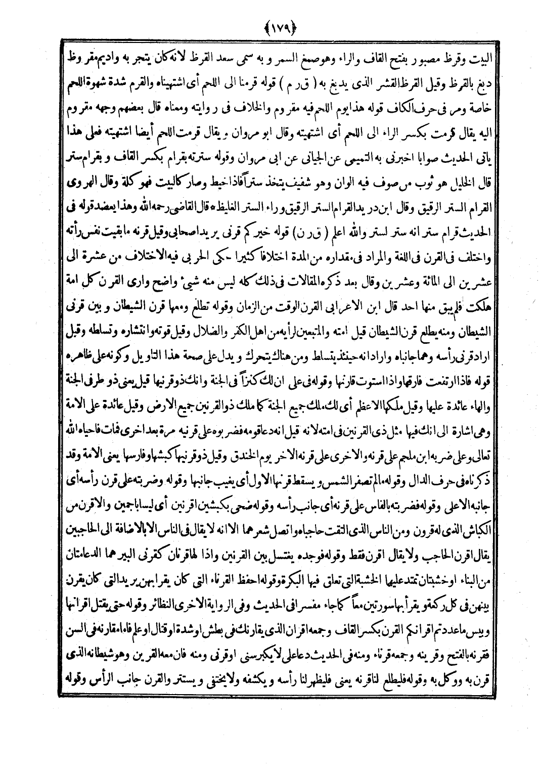 (ق ر ن) قَوْله خَيركُمْ قَرْني يُرِيد أَصْحَابِي وَقيل قرنه مَا بقيت نفس رَأَتْهُ وَاخْتلف فِي الْقرن فِي اللُّغَة وَالْمرَاد فِي مِقْدَاره من الْمدَّة اخْتِلَافا كثيرا حكى الْحَرْبِيّ فِيهِ الِاخْتِلَاف من عشرَة إِلَى عشْرين إِلَى الْمِائَة وَعشْرين وَقَالَ بعد ذكره المقالات فِي ذَلِك كُله لَيْسَ مِنْهُ شَيْء وَاضح وَأرى الْقرن كل أمة هَلَكت فَلم يبْق مِنْهَا أحد قَالَ ابْن الْأَعرَابِي الْقرن الْوَقْت من الزَّمَان وَقَوله تطلع وَمَعَهَا قرن الشَّيْطَان وَبَين قَرْني الشَّيْطَان وَمِنْه يطلع قرن الشَّيْطَان قيل أمته والمتبعين لرأيه من أهل الْكفْر والضلال وَقيل قوته وانتشاره وتسلطه وَقبل أَرَادَ قَرْني رَأسه وهما جانباه وإراد انه حِينَئِذٍ يتسلط وَمن هُنَاكَ يَتَحَرَّك وَيدل على صِحَة هَذَا التَّأْوِيل وَكَونه على ظَاهره قَوْله فَإِذا ارْتَفَعت فَارقهَا وَإِذا اسْتَوَت قارنها وَقَوله فِي على أَن لَك كنزا فِي الْجنَّة وَإنَّك ذُو قرنيها قيل يَعْنِي ذُو طرفِي الْجنَّة وَالْهَاء عَائِدَة عَلَيْهَا وَقيل ملكهَا الْأَعْظَم أَي لَك ملك جَمِيع الْجنَّة كَمَا ملك ذُو القرنين جَمِيع الأَرْض وَقيل عَائِدَة على الْأمة وَهِي إِشَارَة إِلَى أَنَّك فِيهَا مثل ذِي القرنين فِي أمته لِأَنَّهُ قيل أَنه دَعَا قومه فضربوه على قرنيه مرّة بعد أُخْرَى فَمَاتَ فأحياه الله تَعَالَى وعَلى ضربه ابْن ملجم على قرنه وَالْأُخْرَى على قرنه الآخر يَوْم الخَنْدَق وَقيل ذُو قرنيها كبشها وفارسها يَعْنِي الْأمة وَقد ذَكرْنَاهُ فِي حرف الدَّال وَقَوله مَا لم تصفر الشَّمْس وَيسْقط قرنها الأول أَي يغيب جَانبهَا وَقَوله وضربته على قرن رَأسه أَي جَانِبه الْأَعْلَى وَقَوله فضربته بالفاس على قرنه أَي جَانب رَأسه وَقَوله ضحى بكبشين أقرنين أَي ليسَا باجمين والأقرن من الكباش الَّذِي لَهُ قُرُون وَمن النَّاس الَّذِي ألتقت حاجباه واتصل شعرهما إِلَّا أَنه لَا يُقَال فِي النَّاس إِلَّا بِالْإِضَافَة إِلَى الحاجبين يُقَال أقرن الْحَاجِب وَلَا يُقَال أقرن فَقَط وَقَوله فَوَجَدَهُ يغْتَسل بَين القرنين وَإِذا لَهَا قرنان كقرني البير هما الدعامتان من الْبناء أَو خشبتان تمتد عَلَيْهِمَا الْخَشَبَة الَّتِي تعلق فِيهَا البكرة وَقَوله احفظ القرناء الَّتِي كَانَ يقْرَأ بِهن يُرِيد الَّتِي كَانَ يقرن بَينهُنَّ فِي كل رَكْعَة ويقرا بهَا سورتين مَعًا كَمَا جَاءَ مُفَسرًا فِي الحَدِيث وَفِي الرِّوَايَة الْأُخْرَى النَّظَائِر وَقَوله حَتَّى يقتل أقرانها وبيس مَا عددتم أَقْرَانكُم الْقرن بِكَسْر الْقَاف وَجمعه أَقْرَان الَّذِي يقارنك فِي بَطش أَو شدَّة أَو قتال أَو علم فَأَما مقارنه فِي السن فقرنه بِالْفَتْح وقرينه وَجمعه قرناء وَمِنْه فِي الحَدِيث دَعَا عَليّ لَا يكبر سني أَو قَرْني وَمِنْه فَإِن مَعَه القرين وَهُوَ شَيْطَانه الَّذِي قرن بِهِ ووكل بِهِ وَقَوله فليطلع لنا قرنه يَعْنِي فليظهر لنا رَأسه ويكشفه وَلَا يختفي ويستتر والقرن جَانب الرَّأْس وَقَوله