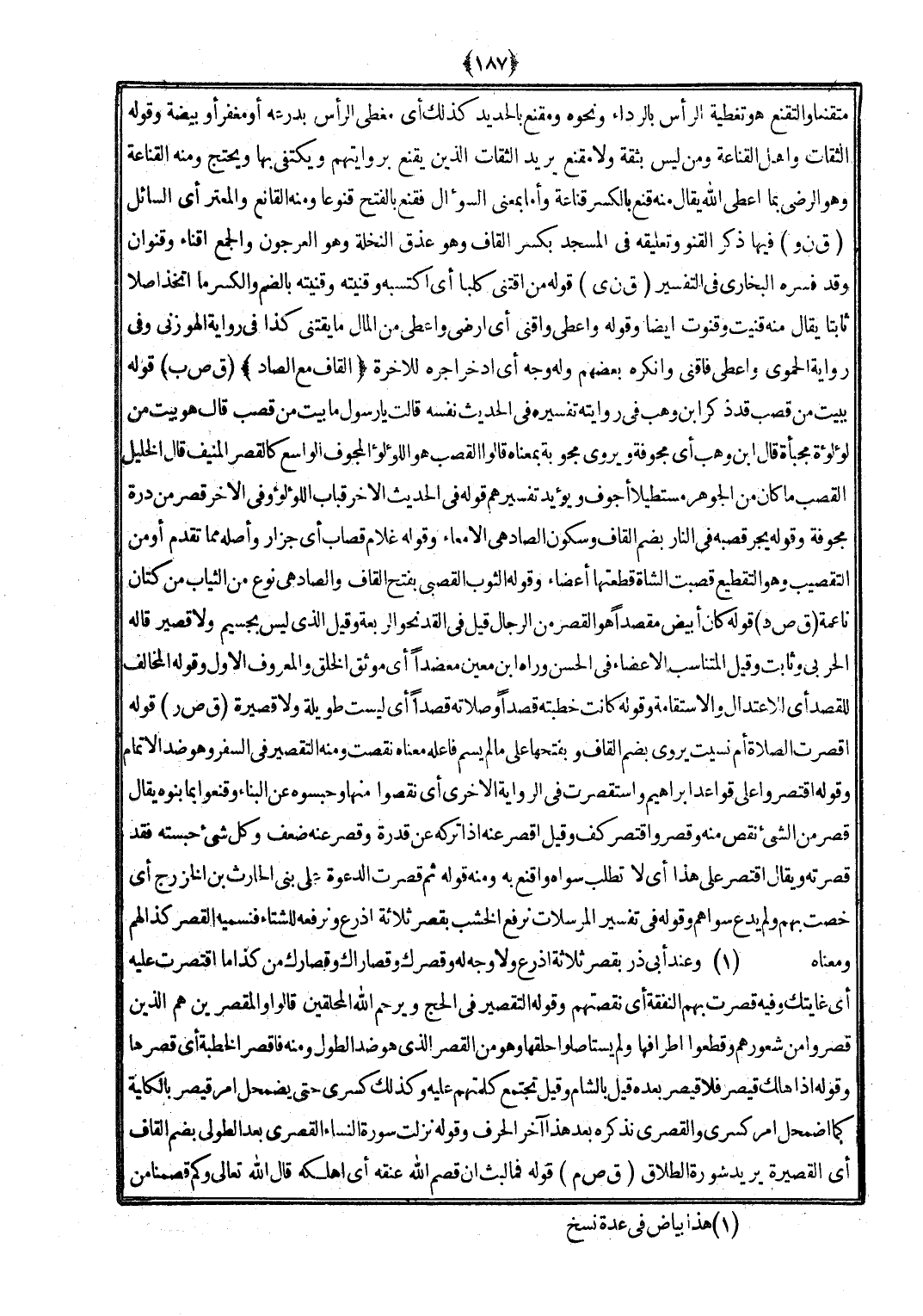 وَعند أبي ذَر بقصر ثَلَاثَة أَذْرع وَلَا وَجه لَهُ وقصرك وقصاراك وقصارك من كَذَا مَا اقتصرت عَلَيْهِ أَي غايتك وَفِيه قصرت بهم النَّفَقَة أَي نقصتهم وَقَوله التَّقْصِير فِي الْحَج وَيرْحَم الله المحلقين قَالُوا والمقصرين هم الَّذين قصروا من شُعُورهمْ وَقَطعُوا أطرافها وَلم يستأصلوا حلقها وَهُوَ من الْقصر الَّذِي هُوَ ضد الطول وَمِنْه فأقصر الْخطْبَة أَي قصرهَا وَقَوله إِذا هلك قَيْصر فَلَا قَيْصر بعده قيل بِالشَّام وَقيل تَجْتَمِع كلمتهم عَلَيْهِ وَكَذَلِكَ كسْرَى حَتَّى يضمحل أَمر قَيْصر بِالْكُلِّيَّةِ كَمَا اضمحل أَمر كسْرَى والقصرى نذكرهُ بعد هَذَا آخر الْحَرْف وَقَوله نزلت سُورَة النِّسَاء الْقصرى بعد الطولي بِضَم الْقَاف أَي القصيرة يُرِيد سُورَة الطَّلَاق