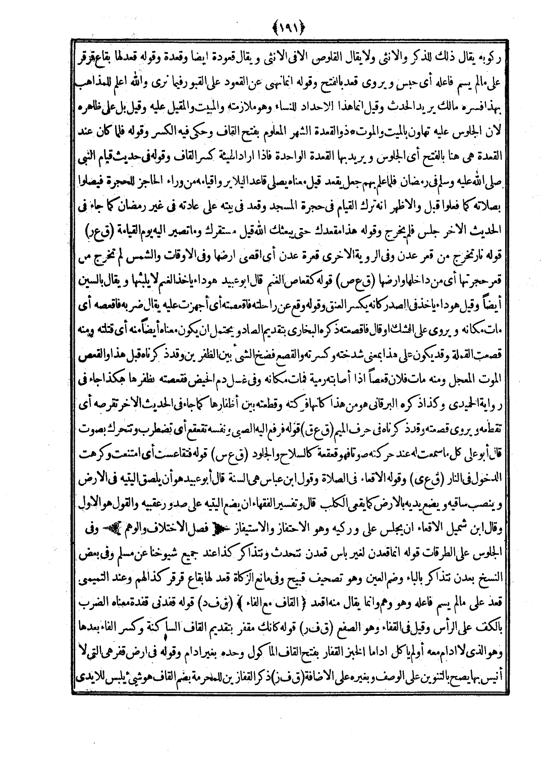 ذُو الْقعدَة الشَّهْر الْمَعْلُوم بِفَتْح الْقَاف وَحكى فِيهِ الْكسر وَقَوله فَلَمَّا كَانَ عِنْد الْقعدَة هِيَ هُنَا بِالْفَتْح أَي الْجُلُوس وَيُرِيد بهَا الْقعدَة الْوَاحِدَة فَإِذا أَرَادَ الْهَيْئَة كسر الْقَاف وَقَوله فِي حَدِيث قيام النَّبِي (صلى الله عَلَيْهِ وَسلم) فِي رَمَضَان فَلَمَّا علم بهم جعل يقْعد قيل مَعْنَاهُ يُصَلِّي قَاعِدا لَيْلًا يرَوا قِيَامه من وَرَاء الحاجز للحجرة فيصلوا بِصَلَاتِهِ كَمَا فعلوا قبل وَالْأَظْهَر أَنه ترك الْقيام فِي حجرَة الْمَسْجِد وَقعد فِي بَيته على عَادَته فِي غير رَمَضَان كَمَا جَاءَ فِي الحَدِيث الآخر جلس فَلم يخرج وَقَوله هَذَا مَقْعَدك حَتَّى يَبْعَثك الله قيل مستقرك وَمَا تصير إِلَيْهِ يَوْم الْقِيَامَة