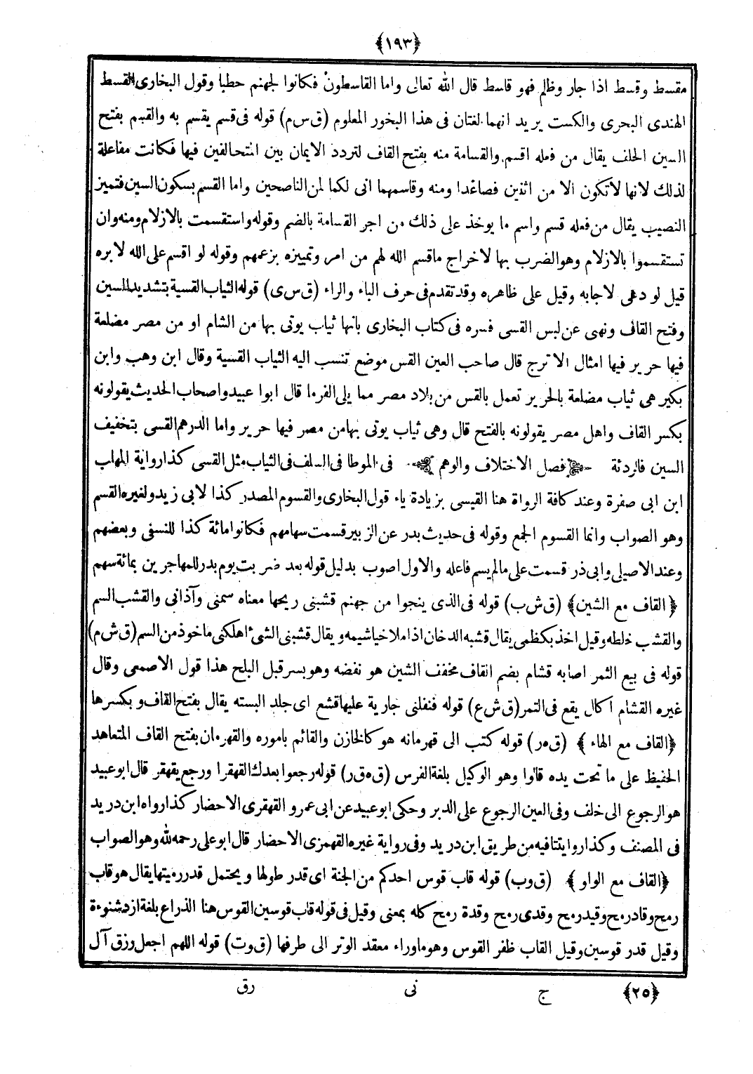 فِي الْمُوَطَّأ فِي السّلف فِي الثِّيَاب مثل القسي كَذَا رِوَايَة الْمُهلب ابْن أبي صفرَة وَعند كَافَّة الروَاة هُنَا الْقَيْسِي بِزِيَادَة يَاء قَول البُخَارِيّ والقسوم الْمصدر كَذَا لأبي زيد وَلغيره الْقسم وَهُوَ الصَّوَاب وَإِنَّمَا القسوم الْجمع وَقَوله فِي حَدِيث بدر عَن الزبير قسمت سِهَامهمْ فَكَانُوا مائَة كَذَا للنسفي وَبَعْضهمْ وَعند الْأصيلِيّ وَأبي ذَر قسمت على مَا لم يسم فَاعله وَالْأول أصوب بِدَلِيل قَوْله بعد ضربت يَوْم بدر للمهاجرين بِمِائَة سهم