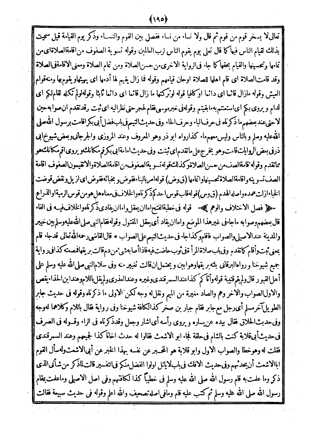 (وَقَوله تَسْوِيَة الصُّفُوف من إِقَامَة الصَّلَاة أَي من تَمامهَا وتحسينها وَالْقِيَام بِحَقِّهَا كَمَا جَاءَ فِي الرِّوَايَة الْأُخْرَى من حسن الصَّلَاة وَمن تَمام الصَّلَاة وَمعنى الْإِقَامَة فِي الصَّلَاة وَقد قَامَت الصَّلَاة أَي قَامَ أَهلهَا للصَّلَاة أَو حَان قيامهم وَقَوله فَمَا زَالَ يُقيم لَهَا ادمها أَي يهيئها وَيقوم بهَا وَمِنْه قوام الْعَيْش وَقَوله مازال قَائِما أَي دَائِما أَو كَافِيا قَوْله لَو تركتهَا مازال قَائِما أَي دَائِما ثَابتا وَقَوله لَو لم تكله لقام لكم أَي لدام ويروى بكم أَي استعنتم بِهِ مَا بَقِيتُمْ وَقَوله فِي خبر مُوسَى فَقَامَ لحجر حَتَّى نظر إِلَيْهِ أَي ثَبت وَقد تقدم أَن صَوَابه حِين لَا حَتَّى عِنْد بَعضهم مَا ذَكرْنَاهُ فِي حرف الْبَاء وحرف الْحَاء وَفِي حَدِيث التَّيَمُّم فِي بَاب فضل أبي بكر أَقَامَت برَسُول الله (صلى الله عَلَيْهِ وَسلم) وبالناس وَلَيْسَ مَعَهم مَاء كَذَا رَوَاهُ أَبُو ذَر وَهُوَ الْمَعْرُوف وَعند الْمروزِي والجرجاني وَبَعض شُيُوخ أبي ذَر فِي بعض الرِّوَايَات قَامَت وَهُوَ يخرج على مَا تقدم أَي ثبتَتْ وَفِي حَدِيث أُمَامَة أبي بكر قُم مَكَانك ويروى أقِم مَكَانك هُوَ مِمَّا تقدم وَقَوله إِقَامَة الصَّفّ من حسن الصَّلَاة وَكَذَلِكَ قَوْله تَسْوِيَة الصُّفُوف من إِقَامَة الصَّلَاة وَإِلَّا تقيمون الصُّفُوف إِقَامَة الصَّفّ تسويته وَإِقَامَة الصَّلَاة تحسينها وإتمامها