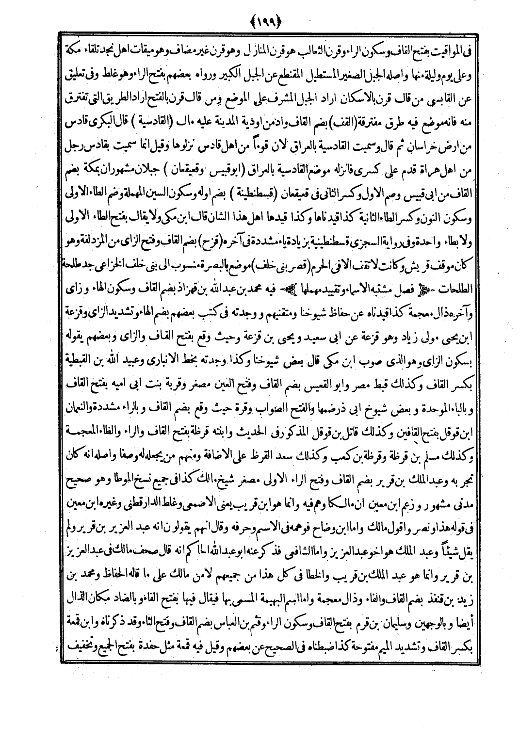 فِيهِ مُحَمَّد بن عبد الله بن قهزاذ بِضَم الْقَاف وَسُكُون الْهَاء وزاي وَآخره ذال مُعْجمَة كَذَا قيدناه عَن حفاظ شُيُوخنَا ومتقنيهم وَوَجَدته فِي كتب بَعضهم بِضَم الْهَاء وَتَشْديد الزَّاي وقزعة ابْن يحيى مولى زِيَاد وَهُوَ قزعة عَن أبي سعيد وَيحيى بن قزعة وَحَيْثُ وَقع بِفَتْح الْقَاف وَالزَّاي وَبَعْضهمْ يَقُوله بِسُكُون الزَّاي وَهُوَ الَّذِي صوب ابْن مكي قَالَ بعض شُيُوخنَا وَكَذَا وجدته بِخَط الْأَنْبَارِي وَعبيد الله بن الْقبْطِيَّة بِكَسْر الْقَاف وَكَذَلِكَ قبط مصر وَأَبُو القعيس بِضَم الْقَاف وَفتح الْعين مصغر وقربة بنت أبي أُميَّة بِفَتْح الْقَاف وبالباء الْمُوَحدَة وَبَعض شُيُوخ أبي ذَر ضمهَا وَالْفَتْح الصَّوَاب وقرة حَيْثُ وَقع بِضَم الْقَاف وبالراء مُشَدّدَة والنعمان ابْن قوقل بِفَتْح القافين وَكَذَلِكَ قَاتل بن قوقل الْمَذْكُور فِي الحَدِيث وَابْنَته قرظة بِفَتْح الْقَاف وَالرَّاء والظاء الْمُعْجَمَة وَكَذَلِكَ مُسلم بن قرظة وقرظة بن كَعْب وَكَذَلِكَ سعد الْقرظ على الْإِضَافَة وَمِنْهُم من يَجعله لَهُ وَصفا وَأَصله أَنه كَانَ تجربة وَعبد الْملك بن قرير بِضَم الْقَاف وَفتح الرَّاء الأولى مصغر شيخ مَالك كَذَا فِي جَمِيع نسخ الْمُوَطَّأ وَهُوَ صَحِيح مدنِي مَشْهُور وَزعم ابْن معِين أَن مَالِكًا وهم فِيهِ وَإِنَّمَا هُوَ ابْن قريب يَعْنِي الْأَصْمَعِي وَغلط الدَّارَقُطْنِيّ وَغَيره ابْن معِين فِي قَوْله هَذَا وَنصر وَأَقُول مَالك وَأما ابْن وضاح فوهمه فِي الِاسْم وحرفه وَقَالَ أَنهم يَقُولُونَ أَنه عبد الْعَزِيز بن قرير وَلم يقل شَيْئا وَعبد الْملك هُوَ أَخُو عبد الْعَزِيز وَأما الشَّافِعِي فَذكر عَنهُ أَبُو عبد الله الْحَاكِم أَنه قَالَ صحف مَالك فِي عبد الْعَزِيز بن قرير وَإِنَّمَا هُوَ عبد الْملك بن قريب وَالْخَطَأ فِي كل هَذَا من جَمِيعهم لَا من مَالك على مَا قَالَه الْحفاظ وَمُحَمّد بن زيد بن قنفذ بِضَم الْقَاف وَالْفَاء وذال مُعْجمَة وَأما اسْم الْبَهِيمَة الْمُسَمّى بهَا فَيُقَال فِيهَا بِفَتْح الْفَاء وبالضاد مَكَان الذَّال أَيْضا وبالوجهين وَسليمَان بن قرم بِفَتْح الْقَاف وَسُكُون الرَّاء وَقثم بن الْعَبَّاس بِضَم الْقَاف وَفتح الثَّاء وَقد ذَكرْنَاهُ وَابْن قمعة بِكَسْر الْقَاف وَتَشْديد الْمِيم مَفْتُوحَة كَذَا ضبطناه فِي الصَّحِيح عَن بَعضهم وَقيل فِيهِ قمعة مثل حفدة بِفَتْح الْجَمِيع وَتَخْفِيف