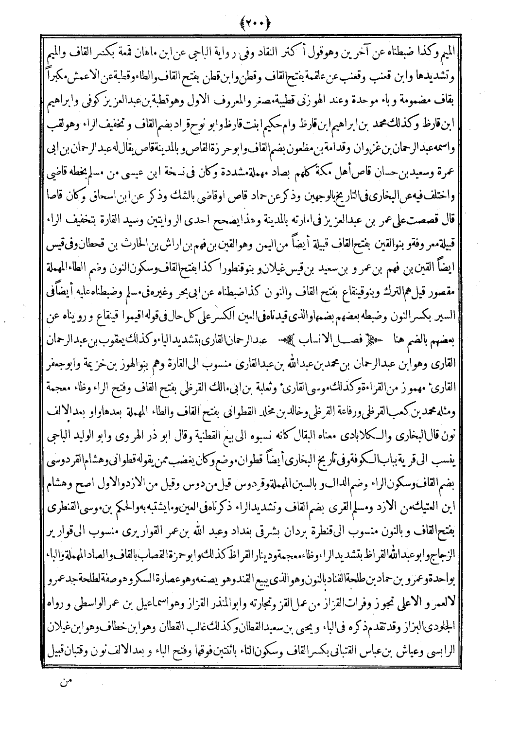 عبد الرَّحْمَن الْقَارئ بتَشْديد الْيَاء وَكَذَلِكَ يَعْقُوب بن عبد الرَّحْمَن الْقَارئ وَهُوَ ابْن عبد الرَّحْمَن بن مُحَمَّد بن عبد الله بن عبد الْقَارئ مَنْسُوب إِلَى القارة وهم بَنو الهوز بن خُزَيْمَة وَأَبُو جَعْفَر الْقَارئ مَهْمُوز من الْقِرَاءَة وَكَذَلِكَ مُوسَى الْقَارئ وثعلبة بن أبي مَالك الْقرظِيّ بِفَتْح الْقَاف وَفتح الرَّاء وظاء مُعْجمَة وَمثله مُحَمَّد بن كَعْب الْقرظِيّ وَرِفَاعَة الْقرظِيّ وخَالِد بن مخلد الْقَطوَانِي بِفَتْح الْقَاف والطاء الْمُهْملَة بعْدهَا وَاو بعد الْألف نون قَالَ البُخَارِيّ والكلابادي مَعْنَاهُ الْبَقَّال كَأَنَّهُ نسبوه إِلَى بيع القطنية وَقَالَ أَبُو ذَر الْهَرَوِيّ وَأَبُو الْوَلِيد الْبَاجِيّ ينْسب إِلَى قَرْيَة بِبَاب الْكُوفَة وَفِي تَارِيخ البُخَارِيّ أَيْضا قطوان مَوضِع وَكَانَ يغْضب مِمَّن يَقُوله قطواني وَهِشَام القردوسي بِضَم الْقَاف وَسُكُون الرَّاء وَضم الدَّال وبالسين الْمُهْملَة وقردوس قيل من دوس وَقيل من الأزد وَالْأول أصح وَهِشَام ابْن العتيك من الأزد وَمُسلم الْقرى بِضَم الْقَاف وَتَشْديد الرَّاء ذَكرْنَاهُ فِي الْعين وَمَا يشْتَبه بِهِ وَالْحكم بن مُوسَى الْقَنْطَرِي بِفَتْح الْقَاف وبالنون مَنْسُوب إِلَى قنطرة بردَان بشرقي بَغْدَاد وَعبد الله بن عمر القواريري مَنْسُوب إِلَى قَوَارِير الزّجاج وَأَبُو عبد الله الْقَرَّاظ بتَشْديد الرَّاء وظاء مُعْجمَة ودينار الْقَرَّاظ كَذَلِك وَأَبُو حَمْزَة القصاب بِالْقَافِ وَالصَّاد الْمُهْملَة وَالْبَاء بِوَاحِدَة وَعَمْرو بن حَمَّاد بن طَلْحَة القناد بالنُّون وَهُوَ الَّذِي يَبِيع القند وَهُوَ يصنعه وَهُوَ عصارة السكر وَهُوَ صفة لطلْحَة جد عَمْرو لَا لعمر والأعلى تجوز وفرات الْقَزاز من عمل القز وتجارته وَأَبُو الْمُنْذر الْقَزاز وَهُوَ إِسْمَاعِيل بن عمر الوَاسِطِيّ وَرَوَاهُ الجلودي الْبَزَّاز وَقد تقدم ذكره فِي الْبَاء وَيحيى بن سعيد الْقطَّان وَكَذَلِكَ غَالب الْقطَّان وَهُوَ ابْن خطَّاف وَهُوَ ابْن غيلَان الرابسي وَعَيَّاش بن عَبَّاس الْقِتْبَانِي بِكَسْر الْقَاف وَسُكُون التَّاء بِاثْنَتَيْنِ فَوْقهَا وَفتح الْبَاء وَبعد الْألف نون وقتبان قبيل