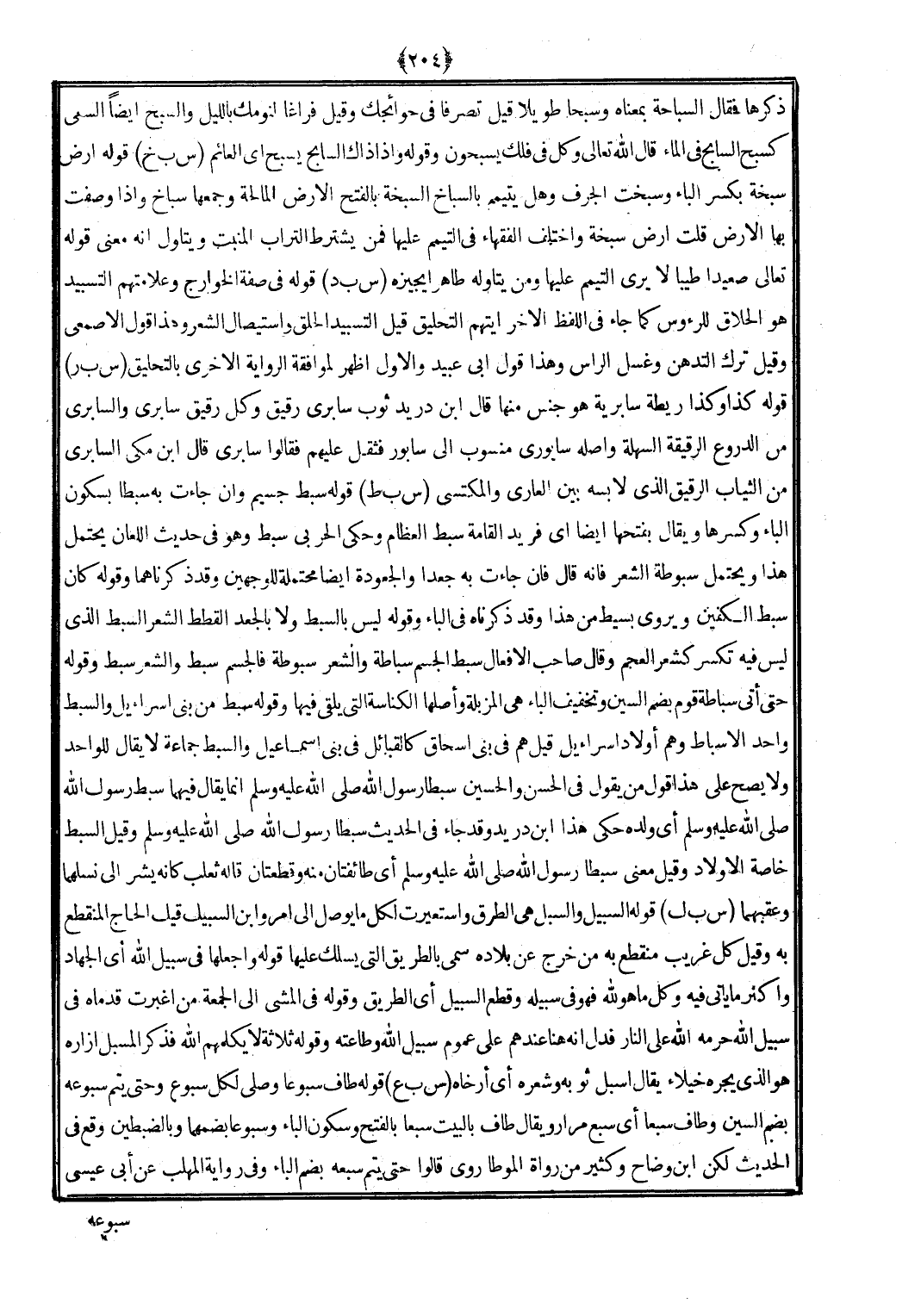 ذكرهَا فَقَالَ السباحة بِمَعْنَاهُ وسبحا طَويلا قيل تَصرفا فِي حوائجك وَقيل فراغا لنومك بِاللَّيْلِ والسبح أَيْضا السَّعْي كسبح السابح فِي المَاء قَالَ الله تَعَالَى) وكل فِي فلك يسبحون