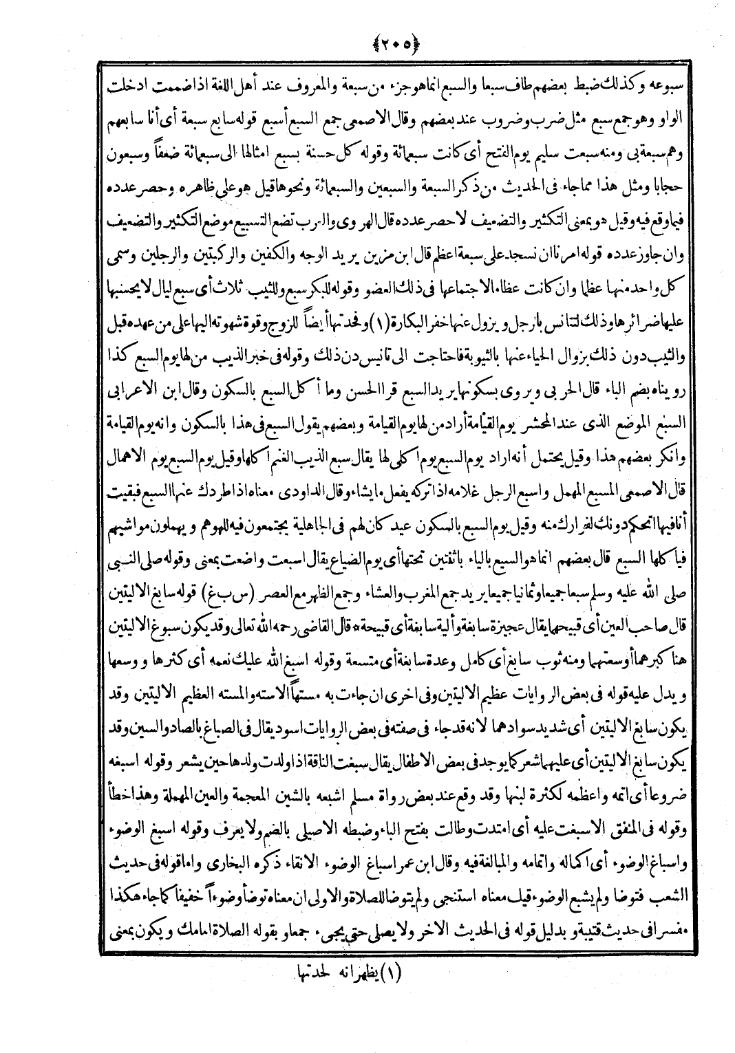 سبوعه وَكَذَلِكَ ضبط بَعضهم طَاف سبعا والسبع إِنَّمَا هُوَ جُزْء من سَبْعَة وَالْمَعْرُوف عِنْد أهل اللُّغَة إِذا ضممت أدخلت الْوَاو وَهُوَ جمع سبع مثل ضرب وضروب عِنْد بَعضهم وَقَالَ الْأَصْمَعِي جمع السَّبع أَسَبْعٌ قَوْله سَابِع سَبْعَة أَي أَنا سابعهم وهم سَبْعَة بِي وَمِنْه سبعت سليم يَوْم الْفَتْح أَي كَانَت سَبْعمِائة وَقَوله كل حَسَنَة بِسبع أَمْثَالهَا إِلَى سَبْعمِائة ضعفا وَسَبْعُونَ حِجَابا وَمثل هَذَا مِمَّا جَاءَ فِي الحَدِيث من ذكر السَّبْعَة وَالسبْعين والسبعمائة وَنَحْوهَا قيل هُوَ على ظَاهره وَحصر عدده فِيمَا وَقع فِيهِ وَقيل هُوَ بِمَعْنى التكثير والتضعيف لَا حصر عدده قَالَ الْهَرَوِيّ وَالْعرب تضع التسبيع مَوضِع التكثير والتضعيف وَإِن جَاوز عدده قَوْله أمرنَا أَن نسجد على سَبْعَة أعظم قَالَ ابْن مزين يُرِيد الْوَجْه وَالْكَفَّيْنِ والركبتين وَالرّجلَيْنِ وَسمي كل وَاحِد مِنْهَا عظما وَإِن كَانَت عظاما لاجتماعها فِي ذَلِك الْعُضْو وَقَوله للبكر سبع وللثيب ثَلَاث أَي سبع لَيَال لَا يحسبها عَلَيْهَا ضرائرها وَذَلِكَ لتتانس بِالرجلِ وَيَزُول عَنْهَا خفر الْبكارَة وفحدتها أَيْضا للزَّوْج وَقُوَّة شَهْوَته إِلَيْهَا على من عَهده قبل وَالثَّيِّب دون ذَلِك بِزَوَال الْحيَاء عَنْهَا بالثيوبة فاحتاجت إِلَى تأنيس دن ذَلِك وَقَوله فِي خبر الذيب من لَهَا يَوْم السَّبع كَذَا روينَاهُ بِضَم الْبَاء قَالَ الْحَرْبِيّ ويروى بسكونها يُرِيد السَّبع قَرَأَ الْحسن وَمَا أكل السَّبع بِالسُّكُونِ وَقَالَ ابْن الْأَعرَابِي السَّبع الْموضع الَّذِي عِنْد الْمَحْشَر يَوْم الْقِيَامَة أَرَادَ من لَهَا يَوْم الْقِيَامَة وَبَعْضهمْ يَقُول السَّبع فِي هَذَا بِالسُّكُونِ وَأَنه يَوْم الْقِيَامَة وَأنكر بَعضهم هَذَا وَقيل يحْتَمل أَنه أَرَادَ يَوْم السَّبع يَوْم أكلى لَهَا يُقَال سبع الذيب الْغنم أكلهَا وَقيل يَوْم السَّبع يَوْم الإهمال قَالَ الْأَصْمَعِي المسبع المهمل وأسبع الرجل غُلَامه إِذا تَركه يفعل مَا يَشَاء وَقَالَ الدَّاودِيّ مَعْنَاهُ إِذا طردك عَنْهَا السَّبع فَبَقيت أَنا فِيهَا أتحكم دُونك لفرارك مِنْهُ وَقيل يَوْم السَّبع بِالسُّكُونِ عيد كَانَ لَهُم فِي الْجَاهِلِيَّة يَجْتَمعُونَ فِيهِ للهوهم ويهملون مَوَاشِيهمْ فيأكلها السَّبع قَالَ بَعضهم إِنَّمَا هُوَ السيع بِالْيَاءِ بِاثْنَتَيْنِ تحتهَا أَي يَوْم الضّيَاع يُقَال أسبعت وأضعت بِمَعْنى وَقَوله صلى النَّبِي (صلى الله عَلَيْهِ وَسلم) سبعا جَمِيعًا وثمانيا جَمِيعًا يُرِيد جمع الْمغرب وَالْعشَاء وَجمع الظّهْر مَعَ الْعَصْر