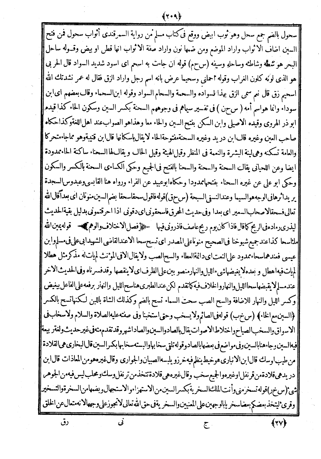 (س ح ن) فِي تَفْسِير سِيمَاهُمْ فِي وُجُوههم السحنة بِكَسْر السِّين وَسُكُون الْحَاء كَذَا قَيده أَبُو ذَر الْهَرَوِيّ وَقَيده الْأصيلِيّ وَابْن السكن بِفَتْح السِّين والحاء مَعًا وَهَذَا هُوَ الصَّوَاب عِنْد أهل اللُّغَة وَكَذَا حَكَاهُ صَاحب الْعين وَغَيره قَالَ ابْن دُرَيْد وَغَيره السحنة مَفْتُوحَة الْحَاء لَا يُقَال بإسكانها قَالَ ابْن قُتَيْبَة وَهُوَ مِمَّا جَاءَ متحركا والعامة تسكنه وَهِي لينَة الْبشرَة وَالنعْمَة فِي المنظر وَقيل الْهَيْئَة وَقيل الْحَال وَيُقَال لَهَا السحناء سَاكِنة الْحَاء ممدودة أَيْضا وَعَن اللحياني يُقَال السحنة والسحنة والسحنا بِالْفَتْح فِي الْجَمِيع وَحكى الكساءي السحنة بِالْكَسْرِ والسكون وَحكى أَبُو عَليّ عَن غَيره السحناء بِفَتْحِهَا ممدودا وَحَكَاهُ أَبُو عبيد عَن الْفراء وَرَوَاهُ هُنَا الْقَابِسِيّ وعبدوس السَّجْدَة يُرِيد أَثَرهَا فِي الْوَجْه هُوَ السيما وَعند النَّسَفِيّ السبحة