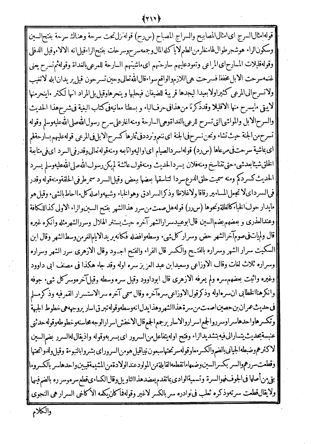 (س ر ر) قَوْله هَل صمت من سرر هَذَا الشَّهْر بِفَتْح السِّين وَالرَّاء الأولى كَذَا للكافة وَعند العذري وَبَعْضهمْ بِضَم السِّين قَالَ أَبُو عبيد سرار الشَّهْر آخِره حَيْثُ يسْتَتر الْهلَال وسرر الشَّهْر مثله وَأنْكرهُ غَيره قَالَ وَلم يَأْتِ فِي صَوْم آخر الشَّهْر حض وسرار كل شَيْء وَسطه وأفضله فَكَأَنَّهُ يُرِيد الْأَيَّام الغر من وسط الشَّهْر وَقَالَ ابْن السّكيت سرار الشَّهْر وسراره بِالْفَتْح وَالْكَسْر قَالَ الْفراء وَالْفَتْح أَجود وَقَالَ الْأَزْهَرِي سرر الشَّهْر وسراره وسراره ثَلَاث لُغَات وَقَالَ الْأَوْزَاعِيّ وَسَعِيد ابْن عبد الْعَزِيز سره أَوله وَقد جَاءَ هَكَذَا فِي مُصَنف أبي دَاوُود وَغَيره وَأثبت بَعضهم سره وَلم يعرفهُ الْأَزْهَرِي قَالَ أَبُو دَاوُود وَقيل سره وَسطه وَقيل آخِره وسر كل شَيْء جَوْفه وَأنكر هُنَا الْخطابِيّ أَن سره أَوله وَذكر قَول الْأَوْزَاعِيّ سره آخِره وَقَالَ سمي آخِره سر الاستسرار الْقَمَر فِيهِ وَذكر مُسلم فِي حَدِيث عمرَان بن حُصَيْن أصمت من سرة هَذَا الشَّهْر وَهَذَا يدل أَنه وَسطه وَقَوله تبرق أسارير وَجهه هِيَ خطوط الْجَبْهَة وتكسرها وأحدها سرا وسرر وَالْجمع أسرار والأسار ير جمع الْجمع قَالَ الْأَخْفَش أسرار الْوَجْه محاسنه وخطوطه وَقَوله حَدثنِي عَنْبَسَة بِحَدِيث يتسار إِلَى فِيهِ بتَشْديد الرَّاء وَفتح أَوله يتفاعل من السرُور أَي يسر بِهِ وَقَوله وَإِذ يُقَال لَهُ السرر بِضَم السِّين لأكثرهم وَضَبطه الجياني بِالضَّمِّ وَالْكَسْر مَعًا وَقَوله سر تحتهَا سَبْعُونَ نَبيا قيل هُوَ من السرُور أَي بشروا بالنبوءة وَقيل ولدُوا تحتهَا وَقطعت سررهم والسر بِكَسْر السِّين وَضمّهَا مَا تقطعه الْقَابِلَة من الْمَوْلُود عِنْد الْولادَة من المشيمة قيبين وأحدها سر بِالْكَسْرِ وَمَا بَقِي من أَصْلهَا فِي الْجوف فَهُوَ السُّرَّة وَتَسْمِيَة الْوَادي بِمَا تقدم يعضد هَذَا التَّأْوِيل وَقَالَ الْكسَائي قطع سره وسرره بِالضَّمِّ فيهمَا وَلَا يُقَال قطعت سرته وَذكره ثَعْلَب فِي نوادره سر بِالْكَسْرِ لَا غير وَقَوله فَمَا كَانَ يكلمهُ إِلَّا كَأَخِي السرَار هِيَ النَّجْوَى
