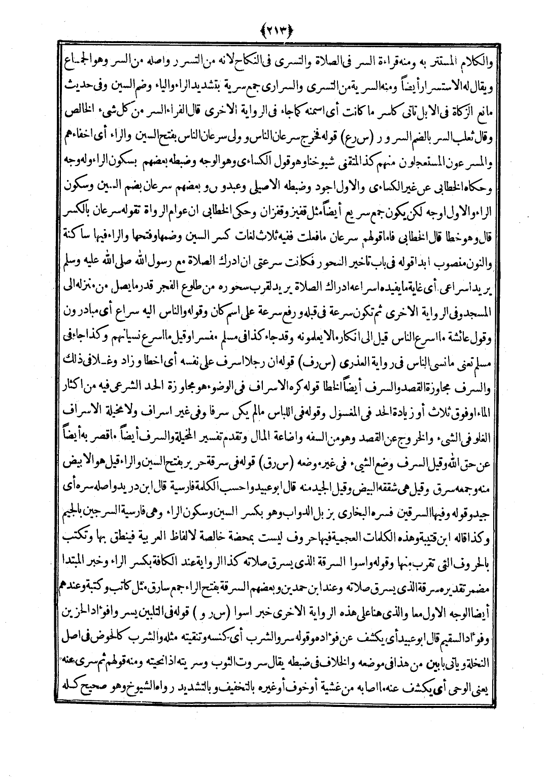 وَالْكَلَام الْمُسْتَتر بِهِ وَمِنْه قِرَاءَة السِّرّ فِي الصَّلَاة والتسري فِي النِّكَاح لِأَنَّهُ من التسرر وَأَصله من السِّرّ وَهُوَ الْجِمَاع وَيُقَال لَهُ الاستسرار أَيْضا وَمِنْه السّريَّة من التَّسَرِّي والسراري جمع سَرِيَّة بتَشْديد الرَّاء وَالْيَاء وَضم السِّين وَفِي حَدِيث مَانع الزَّكَاة فِي الْإِبِل تَأتي كاسر مَا كَانَت أَي أسمنه كَمَا جَاءَ فِي الرِّوَايَة الْأُخْرَى قَالَ الْفراء السِّرّ من كل شَيْء الْخَالِص وَقَالَ ثَعْلَب السِّرّ بِالضَّمِّ السرُور
