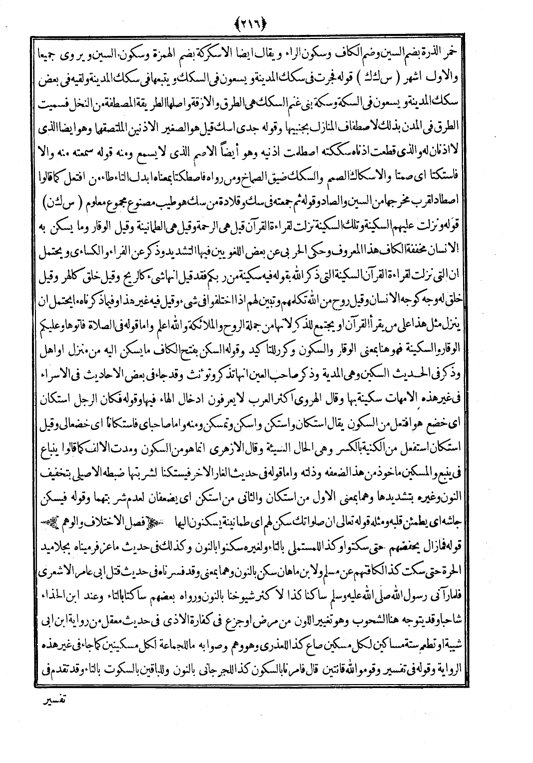 (س ك ن) قَوْله وَنزلت عَلَيْهِم السكينَة وَتلك السكينَة نزلت لقِرَاءَة الْقُرْآن قيل هِيَ الرَّحْمَة وَقيل هِيَ الطُّمَأْنِينَة وَقيل الْوَقار وَمَا يسكن بِهِ الْإِنْسَان مُخَفّفَة الْكَاف هَذَا الْمَعْرُوف وَحكى الْحَرْبِيّ عَن بعض اللغويين فِيهَا التَّشْدِيد وَذكر عَن الْفراء وَالْكسَائِيّ وَيحْتَمل أَن الَّتِي نزلت لقِرَاءَة الْقُرْآن السكينَة الَّتِي ذكر الله بقوله فِيهِ سكينَة من ربكُم فقد قيل أَنَّهَا شَيْء كَالرِّيحِ وَقيل خلق كالهر وَقيل خلق لَهُ وَجه كوجه الْإِنْسَان وَقيل روح من الله تكلمهم وَتبين لَهُم إِذا اخْتلفُوا فِي شَيْء وَقيل فِيهِ غير هَذَا وَفِيمَا ذَكرْنَاهُ مَا يحْتَمل أَن ينزل مثل هَذَا على من يقْرَأ الْقُرْآن أَو يجْتَمع للذّكر لِأَنَّهَا من جملَة الرّوح وَالْمَلَائِكَة وَالله أعلم وَأما قَوْله فِي الصَّلَاة فأتوها وَعَلَيْكُم الْوَقار والسكينة فَهُوَ هُنَا بِمَعْنى الْوَقار والسكون وَكرر للتَّأْكِيد وَقَوله السكن بِفَتْح الْكَاف مَا يسكن إِلَيْهِ من منزل أَو أهل وَذكر فِي الحَدِيث السكين وَهِي المدية وَذكر صَاحب الْعين أَنَّهَا تذكر وتؤنث وَقد جَاءَ فِي بعض الْأَحَادِيث فِي الْإِسْرَاء فِي غير هَذِه الْأُمَّهَات سكينَة بهَا وَقَالَ الْهَرَوِيّ أَكثر الْعَرَب لَا يعْرفُونَ إِدْخَال الْهَاء فِيهَا وَقَوله فَكَانَ الرجل استكان أَي خضع هُوَ افتعل من السّكُون يُقَال استكان واستكن وأسكن وتمسكن وَمِنْه وَأما صَاحِبَايَ فاستكانا أَي خضعا لي وَقيل استكان استفعل من الكنية بِالْكَسْرِ وَهِي الْحَال السَّيئَة وَقَالَ الْأَزْهَرِي إِنَّمَا هُوَ من السّكُون ومدت الْألف كَمَا قَالُوا ينباع فِي يَنْبع والمسكين مَأْخُوذ من هَذَا لضَعْفه وذلته وَأما قَوْله فِي حَدِيث الْغَار الآخر فيستكنا لشربتها ضَبطه الْأصيلِيّ بتَخْفِيف النُّون وَغَيره بتشديدها وهما بِمَعْنى الأول من استكان وَالثَّانِي من استكن أَي يُضعفَانِ لعدم شربتهما وَقَوله فيسكن جأشه أَي يطمئن قلبه وَمثله قَوْله تَعَالَى) إِن صَلَاتك سكن لَهُم