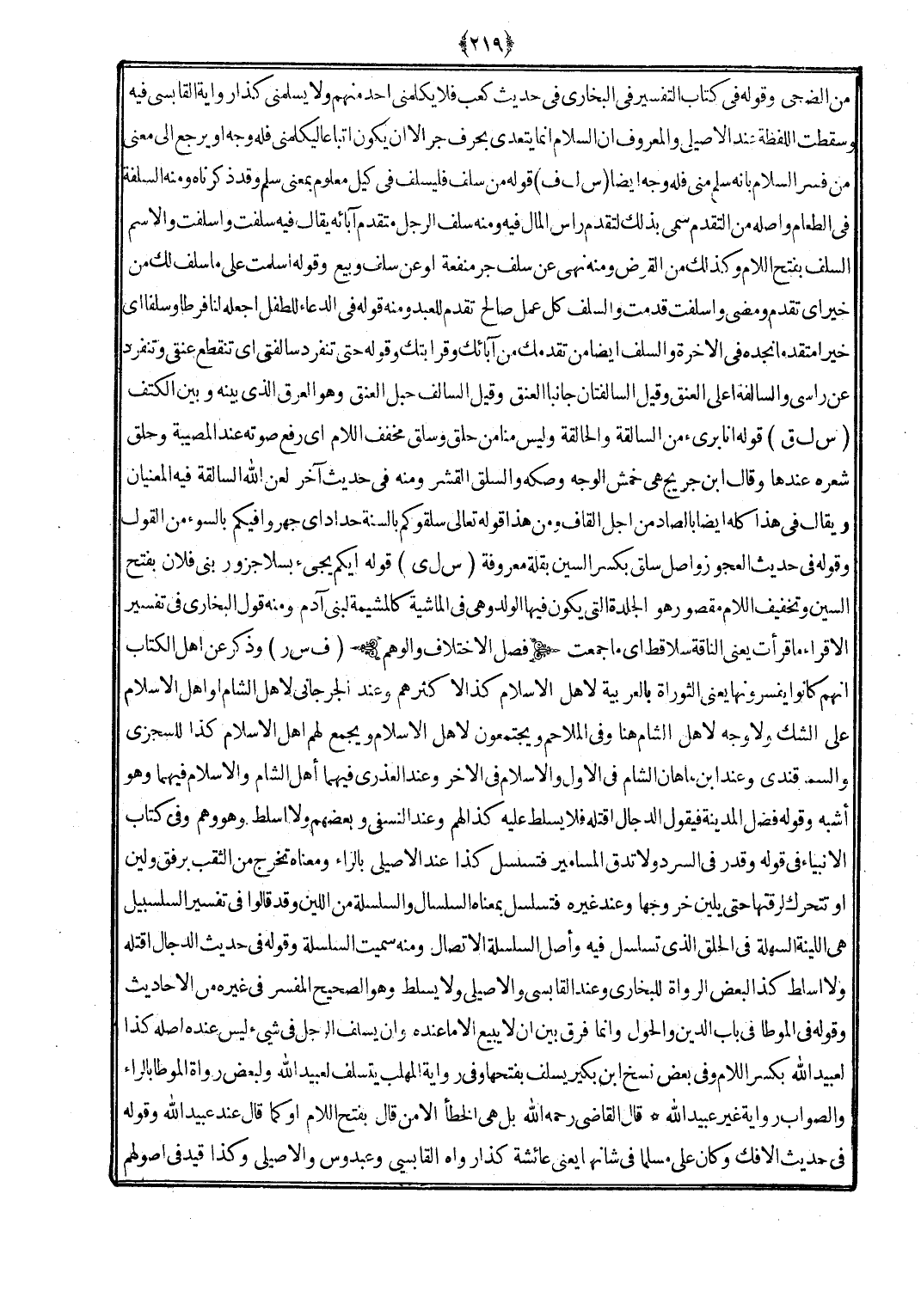 (ف س ر) وَذكر عَن أهل الْكتاب أَنهم كَانُوا يفسرونها يَعْنِي الثوراة بِالْعَرَبِيَّةِ لأهل الْإِسْلَام كَذَا لأكثرهم وَعند الْجِرْجَانِيّ لأهل الشَّام أَو أهل الْإِسْلَام على الشَّك وَلَا وَجه لأهل الشَّام هُنَا وَفِي الْمَلَاحِم ويجتمعون لأهل الْإِسْلَام وَيجمع لَهُم أهل الْإِسْلَام كَذَا للسجزي والسمرقندي وَعند ابْن ماهان الشَّام فِي الأول وَالْإِسْلَام فِي الآخر وَعند العذري فيهمَا أهل الشَّام وَالْإِسْلَام فيهمَا وَهُوَ أشبه وَقَوله فضل الْمَدِينَة فَيَقُول الدَّجَّال اقتله فَلَا يُسَلط عَلَيْهِ كَذَا لَهُم وَعند النَّسَفِيّ وَبَعْضهمْ وَلَا أسلط وَهُوَ وهم وَفِي كتاب الْأَنْبِيَاء فِي قَوْله وَقدر فِي السرد وَلَا تدق المسامير فتسلسل كَذَا عِنْد الْأصيلِيّ بالراء وَمَعْنَاهُ تخرج من الثقب بِرِفْق ولين أَو تتحرك لرقتها حَتَّى يلين خُرُوجهَا وَعند غَيره فتسلسل بِمَعْنَاهُ السلسال والسلسلة من اللين وَقد قَالُوا فِي تَفْسِير السلسبيل هِيَ اللينة السهلة فِي الْحلق الَّذِي تسلسل فِيهِ وأصل السلسلة الِاتِّصَال وَمِنْه سميت السلسلة وَقَوله فِي حَدِيث الدَّجَّال اقتله وَلَا أسلط كَذَا لبَعض الروَاة للْبُخَارِيّ وَعند الْقَابِسِيّ والأصيلي وَلَا يُسَلط وَهُوَ الصَّحِيح الْمُفَسّر فِي غَيره من الْأَحَادِيث وَقَوله فِي الْمُوَطَّأ فِي بَاب الدّين والحول وَإِنَّمَا فرق بَين أَن لَا يَبِيع إِلَّا مَا عِنْده وَأَن يسلف الرجل فِي شَيْء لَيْسَ عِنْده اصله كَذَا لِعبيد الله بِكَسْر اللَّام وَفِي بعض نسخ ابْن بكير يسلف بِفَتْحِهَا وَفِي رِوَايَة الْمُهلب يتسلف لِعبيد الله ولبعض رُوَاة الْمُوَطَّأ بالراء وَالصَّوَاب رِوَايَة غير عبيد الله