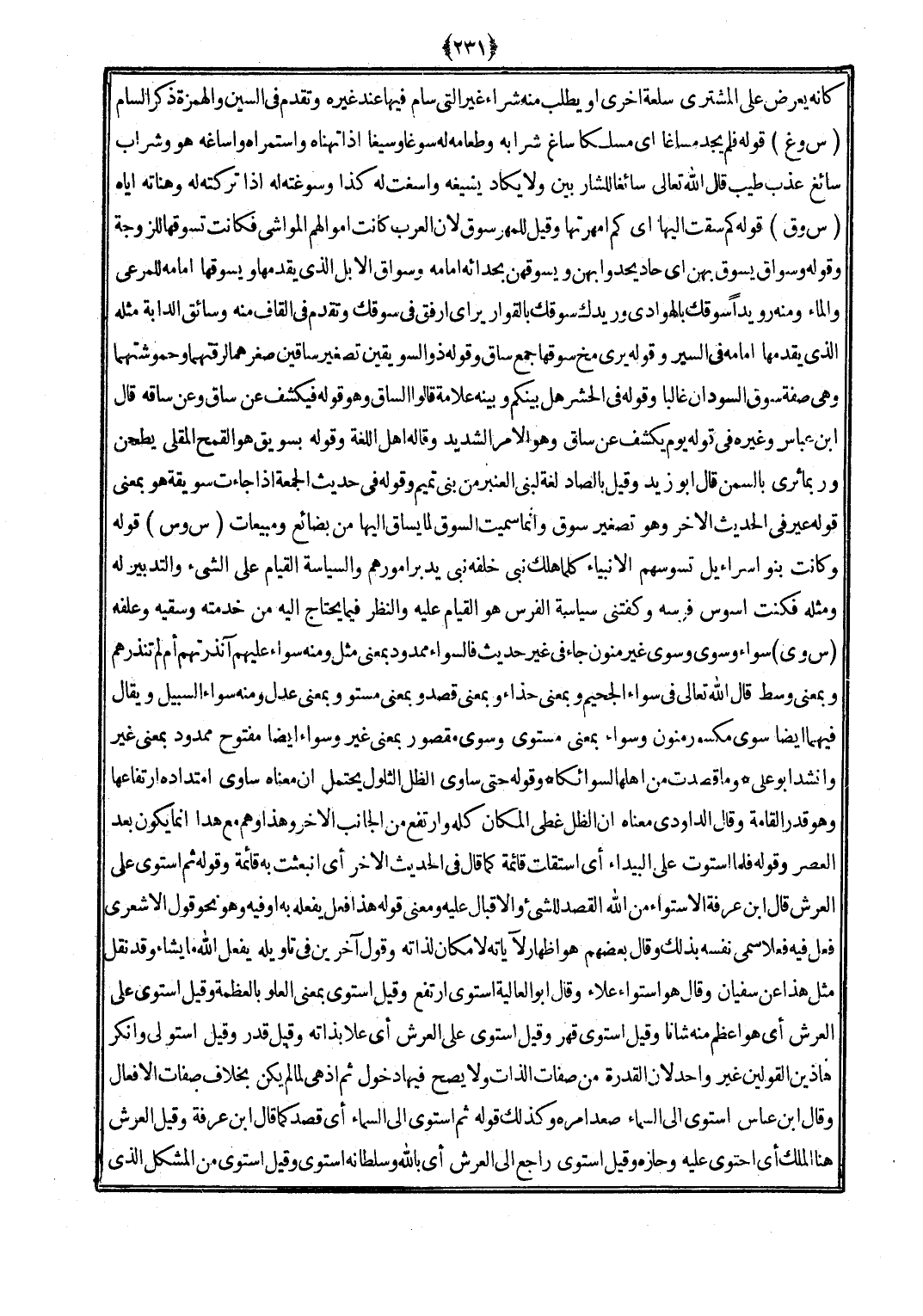 وَقَوله حَتَّى سَاوَى الظل الثلول يحْتَمل أَن مَعْنَاهُ سَاوَى امتداده ارتفاعها وَهُوَ قدر الْقَامَة وَقَالَ الدَّاودِيّ مَعْنَاهُ أَن الظل غطى الْمَكَان كُله وارتفع من الْجَانِب الآخر وَهَذَا وهم مَعَ هَذَا إِنَّمَا يكون بعد الْعَصْر وَقَوله فَلَمَّا اسْتَوَت على الْبَيْدَاء أَي اسْتَقَلت قَائِمَة كَمَا قَالَ فِي الحَدِيث الآخر أَي انبعثت بِهِ قَائِمَة وَقَوله ثمَّ اسْتَوَى على الْعَرْش قَالَ ابْن عَرَفَة الاسْتوَاء من الله الْقَصْد للشَّيْء والإقبال عَلَيْهِ وَمعنى قَوْله هَذَا فعل يَفْعَله بِهِ أَو فِيهِ وَهُوَ نَحْو قَول الْأَشْعَرِيّ فعل فِيهِ فعلا سمى نَفسه بذلك وَقَالَ بَعضهم هُوَ إِظْهَار لآياته لَا مَكَان لذاته وَقَول آخَرين فِي تَأْوِيله يفعل الله مَا يَشَاء وَقد نقل مثل هَذَا عَن سُفْيَان وَقَالَ هُوَ اسْتِوَاء عَلَاء وَقَالَ أَبُو الْعَالِيَة اسْتَوَى ارْتَفع وَقيل اسْتَوَى بِمَعْنى الْعُلُوّ بالعظمة وَقيل اسْتَوَى على الْعَرْش أَي هُوَ أعظم مِنْهُ شانا وَقيل اسْتَوَى قهر وَقيل اسْتَوَى على الْعَرْش أَي علا بِذَاتِهِ وَقيل قدر وَقيل استولى وَأنكر هاذين الْقَوْلَيْنِ غير وَاحِد لِأَن الْقُدْرَة من صِفَات الذَّات وَلَا يَصح فِيهَا دُخُول ثمَّ إِذْ هِيَ لما لم يكن بِخِلَاف صِفَات الْأَفْعَال وَقَالَ ابْن عَبَّاس اسْتَوَى إِلَى السَّمَاء صعد أمره وَكَذَلِكَ قَوْله ثمَّ اسْتَوَى إِلَى السَّمَاء أَي قصد كَمَا قَالَ ابْن عَرَفَة وَقيل الْعَرْش هُنَا الْملك أَي احتوى عَلَيْهِ وحازه وَقيل اسْتَوَى رَاجع إِلَى الْعَرْش أَي بِاللَّه وسلطانه اسْتَوَى وَقيل اسْتَوَى من الْمُشكل الَّذِي
