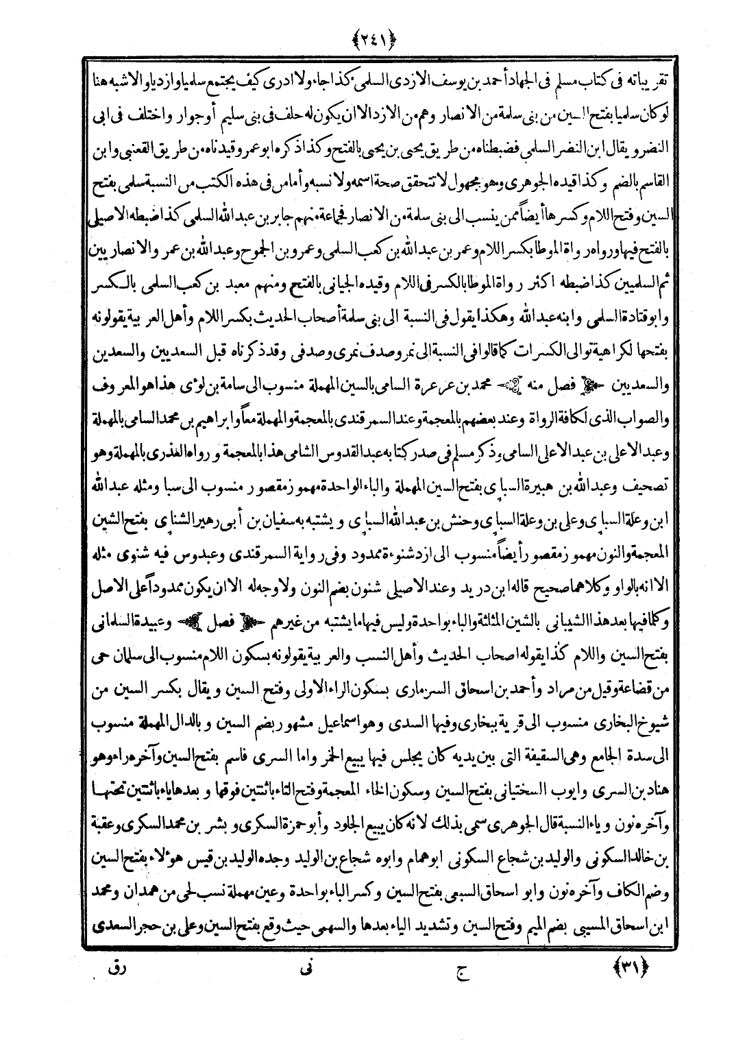 تقريباته فِي كتاب مُسلم فِي الْجِهَاد أَحْمد بن يُوسُف الْأَزْدِيّ السّلمِيّ كَذَا جَاءَ وَلَا أَدْرِي كَيفَ يجْتَمع سلميا وإزديا وَالْأَشْبَه هُنَا لَو كَانَ سلميا بِفَتْح السِّين من بني سَلمَة من الْأَنْصَار وهم من الأزد إِلَّا أَن يكون لَهُ حلف فِي بني سليم أَو جوَار وَاخْتلف فِي أبي النَّضر وَيُقَال ابْن النَّضر السّلمِيّ فضبطناه من طَرِيق يحيى بن يحيى بِالْفَتْح وَكَذَا ذكره أَبُو عمر وقيدناه من طَرِيق القعْنبِي وَابْن الْقَاسِم بِالضَّمِّ وَكَذَا قَيده الْجَوْهَرِي وَهُوَ مَجْهُول لَا تتَحَقَّق صِحَة اسْمه وَلَا نسبه وَأما من فِي هَذِه الْكتب من النِّسْبَة سلمي بِفَتْح السِّين وَفتح اللَّام وَكسرهَا أَيْضا مِمَّن ينْسب إِلَى بني سَلمَة من الْأَنْصَار فجماعة مِنْهُم جَابر بن عبد الله السّلمِيّ كَذَا ضَبطه الْأصيلِيّ بِالْفَتْح فِيهَا وَرَوَاهُ رُوَاة الْمُوَطَّأ بِكَسْر اللَّام وَعمر بن عبد الله بن كَعْب السّلمِيّ وَعَمْرو بن الجموح وَعبد الله بن عمر والأنصاريين ثمَّ السلميين كَذَا ضَبطه أَكثر رُوَاة الْمُوَطَّأ بِالْكَسْرِ فِي اللَّام وَقَيده الجياني بِالْفَتْح وَمِنْهُم معبد بن كَعْب السّلمِيّ بِالْكَسْرِ وَأَبُو قَتَادَة السّلمِيّ وَابْنه عبد الله وَهَكَذَا يَقُول فِي النِّسْبَة إِلَى بني سَلمَة أَصْحَاب الحَدِيث بِكَسْر اللَّام وَأهل الْعَرَبيَّة يَقُولُونَهُ بِفَتْحِهَا لكراهية توالي الكسرات كَمَا قَالُوا فِي النِّسْبَة إِلَى نمر وصدف نمري وصدفي وَقد ذَكرْنَاهُ قبل السعديين والسعدين والسعديين