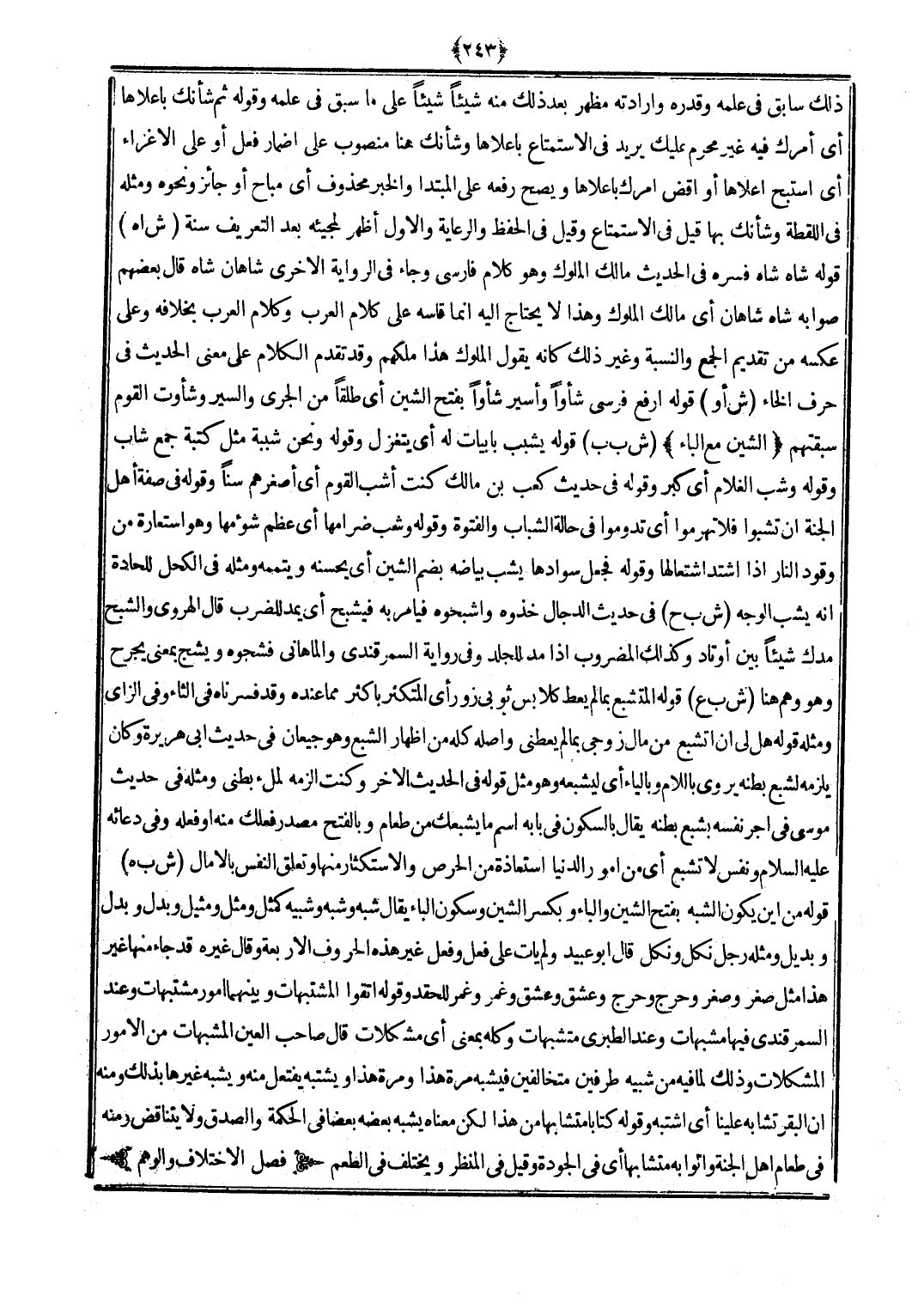 (ش ب هـ) قَوْله من أَيْن يكون الشّبَه بِفَتْح الشين وَالْبَاء وبكسر الشين وَسُكُون الْبَاء يُقَال شبه وَشبه وشبيه كَمثل وَمثل ومثيل وَبدل وَبدل وَبُدَيْل وَمثله رجل نكل وَنكل قَالَ أَبُو عبيد وَلم يَأْتِ على فعل وَفعل غير هَذِه الْحُرُوف الْأَرْبَعَة وَقَالَ غَيره قد جَاءَ مِنْهَا غير هَذَا مثل صغر وَصغر وحرج وحرج وعشق وعشق وغمر وغمر للحقد وَقَوله اتَّقوا المشتبهات وَبَينهمَا أُمُور مُشْتَبهَات وَعند السَّمرقَنْدِي فِيهَا مشبهات وَعند الطَّبَرِيّ متشبهات وَكله بِمَعْنى أَي مشكلات قَالَ صَاحب الْعين المشبهات من الْأُمُور المشكلات وَذَلِكَ لما فِيهِ من شَبيه طرفين متخالفين فَيُشبه مرّة هَذَا وَمرَّة هَذَا وَيشْتَبه يفتعل مِنْهُ وَيُشبه غَيرهَا بذلك وَمِنْه أَن الْبَقر تشابه علينا أَي اشْتبهَ وَقَوله كتابا متشابها من هَذَا لَكِن مَعْنَاهُ يشبه بعضه بَعْضًا فِي الْحِكْمَة والصدق وَلَا يتناقض وَمِنْه فِي طَعَام أهل الْجنَّة وَأتوا بِهِ متشابها أَي فِي الْجَوْدَة وَقيل فِي المنظر وَيخْتَلف فِي الطّعْم
