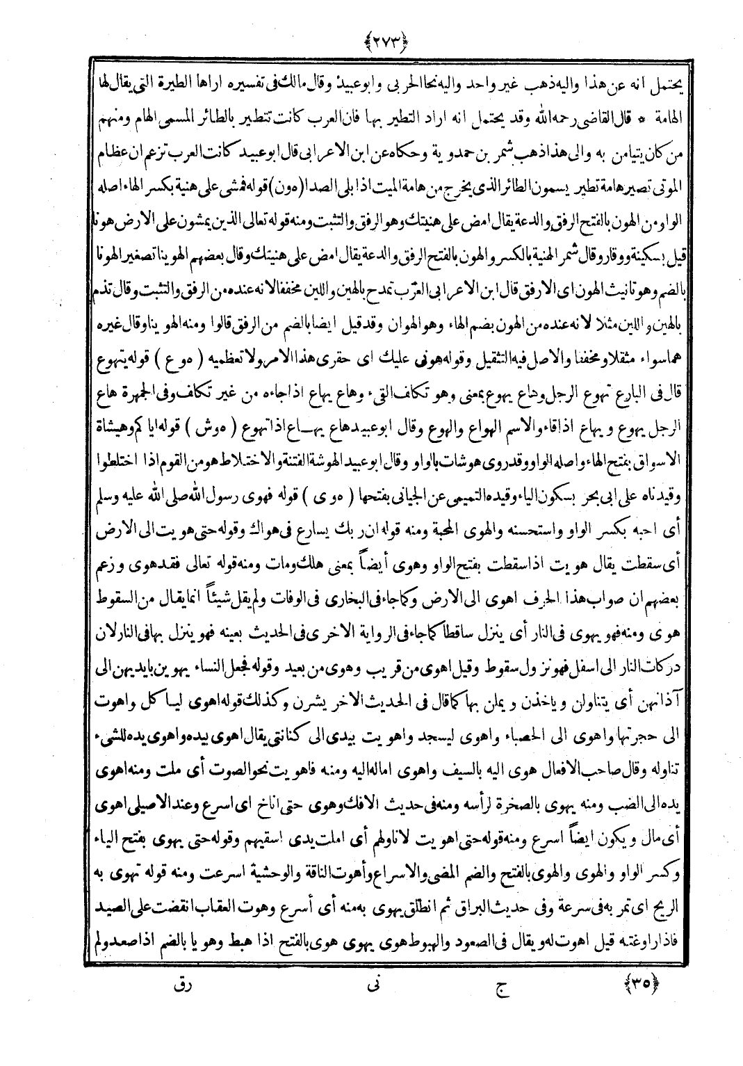 (هـ وى) قَوْله فهوى رَسُول الله (صلى الله عَلَيْهِ وَسلم) أَي أحبه بِكَسْر الْوَاو وَاسْتَحْسنهُ والهوى الْمحبَّة وَمِنْه قَوْله أَن رَبك يُسَارع فِي هَوَاك وَقَوله حَتَّى هويت إِلَى الأَرْض أَي سَقَطت يُقَال هويت إِذا سَقَطت بِفَتْح الْوَاو وَهوى أَيْضا بِمَعْنى هلك وَمَات وَمِنْه قَوْله تَعَالَى فقد هوى وَزعم بَعضهم أَن صَوَاب هَذَا الْحَرْف أَهْوى إِلَى الأَرْض وكما جَاءَ فِي البُخَارِيّ فِي الوفات وَلم يقل شَيْئا إِنَّمَا يُقَال من السُّقُوط هوى وَمِنْه فَهُوَ يهوي فِي النَّار أَي ينزل سَاقِطا كَمَا جَاءَ فِي الرِّوَايَة الْأُخْرَى فِي الحَدِيث بِعَيْنِه فَهُوَ ينزل بهَا فِي النَّار لِأَن دركات النَّار إِلَى أَسْفَل فَهُوَ نزُول سُقُوط وَقيل أَهْوى من قريب وَهوى من بعيد وَقَوله فَجعل النِّسَاء يهوين بأيديهن إِلَى آذانهن أَي يتناولن ويأخذن ويملن بهَا كَمَا قَالَ فِي الحَدِيث الآخر يشرن وَكَذَلِكَ قَوْله أَهْوى ليَأْكُل وأهوت إِلَى حُجْرَتهَا وأهوى إِلَى الْحَصْبَاء وأهوى ليسجد وأهويت بيَدي إِلَى كِنَانَتِي يُقَال أَهْوى بِيَدِهِ وأهوى يَده للشَّيْء تنَاوله وَقَالَ صَاحب الْأَفْعَال هوى إِلَيْهِ بِالسَّيْفِ وأهوى أماله إِلَيْهِ وَمِنْه فَأَهْوَيْت نَحْو الصَّوْت أَي ملت وَمِنْه أَهْوى يَده إِلَى الضَّب وَمِنْه يهوى بالصخرة لرأسه وَمِنْه فِي حَدِيث الْإِفْك وَهوى حَتَّى أَنَاخَ أَي أسْرع وَعند الْأصيلِيّ أَهْوى أَي مَال وَيكون أَيْضا أسْرع وَمِنْه قَوْله حَتَّى أهويت لأناولهم أَي أملت يَدي أسقيهم وَقَوله حَتَّى يهوى بِفَتْح الْيَاء وَكسر الْوَاو والهوى والهوى بِالْفَتْح وَالضَّم الْمُضِيّ والإسراع وأهوت النَّاقة والوحشية أسرعت وَمِنْه قَوْله تهوى بِهِ الرّيح أَي تمر بِهِ فِي سرعَة وَفِي حَدِيث الْبراق ثمَّ انْطلق يهوى بِهِ مِنْهُ أَي أسْرع وهوت الْعقَاب انْقَضتْ على الصَّيْد فَإِذا راوغته قيل أهوت لَهُ وَيُقَال فِي الصعُود والهبوط هوى يهوي هوى بِالْفَتْح إِذا هَبَط وَهُوَ يَا بِالضَّمِّ إِذا صعد وَلم