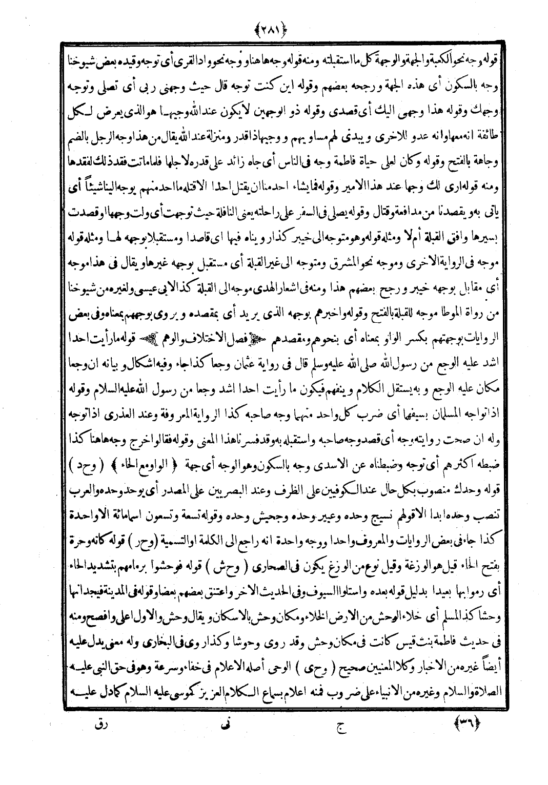 قَوْله وَجه نَحْو الْكَعْبَة والجهة والوجهة كل مَا استقبلته وَمِنْه قَوْله وَجه هَا هُنَا وَوجه نَحْو وَاد الْقرى أَي توجه وَقَيده بعض شُيُوخنَا وَجه بِالسُّكُونِ أَي هَذِه الْجِهَة وَرجحه بَعضهم وَقَوله أَيْن كنت توجه قَالَ حَيْثُ وجهني رَبِّي أَي تصلي وَتوجه وَجهك وَقَوله هَذَا وَجْهي إِلَيْك أَي قصدي وَقَوله ذُو الْوَجْهَيْنِ لَا يكون عِنْد الله وجيها هُوَ الَّذِي يعرض لكل طَائِفَة أَنه مَعهَا وَأَنه عَدو لِلْأُخْرَى ويبدي لَهُم مساويهم ووجيها ذَا قدر ومنزلة عِنْد الله يُقَال من هَذَا وَجه الرجل بِالضَّمِّ وجاهة بِالْفَتْح وَقَوله وَكَانَ لعلى حَيَاة فَاطِمَة وَجه فِي النَّاس أَي جاه زَائِد على قدره لأَجلهَا فَلَمَّا مَاتَت فقد ذَلِك لفقدها وَمِنْه قَوْله أرى لَك وَجها عِنْد هَذَا الْأَمِير وَقَوله فَمَا يَشَاء أحد منا أَن يقتل أحدا إِلَّا قَتله مَا أحد مِنْهُم يُوَجه إِلَيْنَا شَيْئا أَي يَأْتِي بِهِ ويقصدنا من مدافعة وقتال وَقَوله يُصَلِّي فِي السّفر على رَاحِلَته يَعْنِي النَّافِلَة حَيْثُ تَوَجَّهت أَي ولت وَجههَا أَو قصدت بسيرها وَافق الْقبْلَة أم لَا وَمثله قَوْله وَهُوَ مُتَوَجّه إِلَى خَيْبَر كَذَا روينَاهُ فِيهَا أَي قَاصِدا ومستقبلا بِوَجْهِهِ لَهَا وَمثله قَوْله موجه فِي الرِّوَايَة الْأُخْرَى وموجه نَحْو الْمشرق ومتوجه إِلَى غير الْقبْلَة أَي مُسْتَقْبل بِوَجْهِهِ غَيرهَا وَيُقَال فِي هَذَا موجه أَي مُقَابل بِوَجْهِهِ خَيْبَر وَرجح بَعضهم هَذَا وَمِنْه فِي إِشْعَار الْهدى موجه إِلَى الْقبْلَة كَذَا لأبي عِيسَى وَلغيره من شُيُوخنَا من رُوَاة الْمُوَطَّأ موجه للْقبْلَة بِالْفَتْح وَقَوله وَأخْبرهمْ بِوَجْهِهِ الَّذِي يُرِيد أَي بمقصده ويروى بوجههم بِمَعْنَاهُ وَفِي بعض الرِّوَايَات بوجهتهم بِكَسْر الْوَاو بِمَعْنَاهُ أَي بنحوهم ومقصدهم.