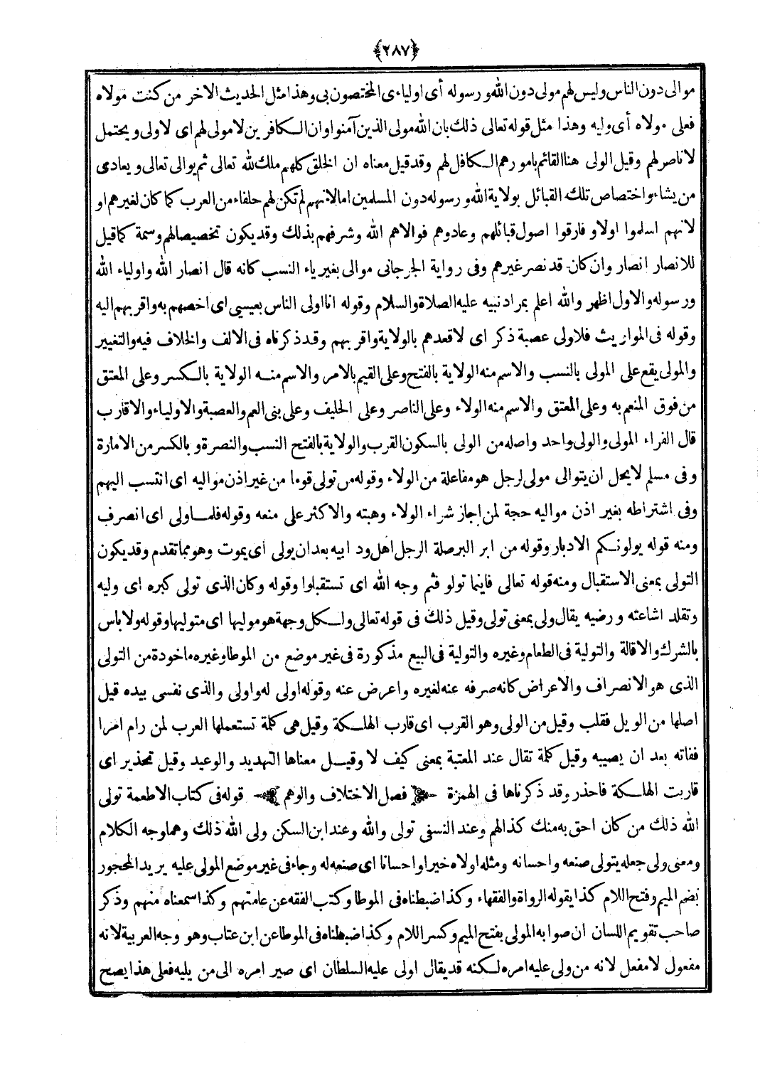 (أَي لَا ولي وَيحْتَمل لَا نَاصِر لَهُم وَقيل الْوَلِيّ هُنَا الْقَائِم بأمورهم الكافل لَهُم وَقد قيل مَعْنَاهُ أَن الْخلق كلهم ملك لله تَعَالَى ثمَّ يوالي تَعَالَى ويعادي من يَشَاء واختصاص تِلْكَ الْقَبَائِل بِولَايَة الله وَرَسُوله دون الْمُسلمين أما لأَنهم لم تكن لَهُم حلفاء من الْعَرَب كَمَا كَانَ لغَيرهم أَو لأَنهم أَسْلمُوا أَولا وفارقوا أصُول قبائلهم وعادوهم فوالاهم الله وشرفهم بذلك وَقد يكون تَخْصِيصًا لَهُم وسمة كَمَا قيل للْأَنْصَار أنصار وَإِن كَانَ قد نصر غَيرهم وَفِي رِوَايَة الْجِرْجَانِيّ موَالِي بِغَيْر يَاء النّسَب كَأَنَّهُ قَالَ أنصار الله وأولياء الله وَرَسُوله وَالْأول أظهر وَالله أعلم بِمُرَاد نبيه (صلى الله عَلَيْهِ وَسلم) وَقَوله أَنا أولى النَّاس بِعِيسَى أَي أخصهم بِهِ وأقربهم إِلَيْهِ وَقَوله فِي الْمَوَارِيث فَلَا ولي عصبَة ذكر أَي لاقعدهم بِالْولَايَةِ وأقربهم وَقد ذَكرْنَاهُ فِي الْألف وَالْخلاف فِيهِ والتغيير وَالْمولى يَقع على الْمولى بِالنّسَبِ وَالِاسْم مِنْهُ الْولَايَة بِالْفَتْح وعَلى الْقيم بِالْأَمر وَالِاسْم مِنْهُ الْولَايَة بِالْكَسْرِ وعَلى الْمُعْتق من فَوق الْمُنعم بِهِ وعَلى الْمُعْتق وَالِاسْم مِنْهُ الْوَلَاء وعَلى النَّاصِر وعَلى الحليف وعَلى بني الْعم والعصبة والأولياء والأقارب قَالَ الْفراء الْمولى وَالْوَلِيّ وَاحِد وَأَصله من الْوَلِيّ بِالسُّكُونِ الْقرب وَالْولَايَة بِالْفَتْح النّسَب والنصرة وبالكسر من الْإِمَارَة وَفِي مُسلم لَا يحل أَن يتوالى مولى لرجل هُوَ مفاعلة من الْوَلَاء وَقَوله من تولى قوما من غير إِذن موَالِيه أَي انتسب إِلَيْهِم وَفِي اشْتِرَاطه بِغَيْر إِذن موَالِيه حجَّة لمن أجَاز شِرَاء الْوَلَاء وهبته وَالْأَكْثَر على مَنعه وَقَوله فَلَمَّا ولى أَي انْصَرف وَمِنْه قَوْله يولونكم الأدبار وَقَوله من أبر الْبر صلَة الرجل أهل ود أَبِيه بعد أَن يولي أَي يَمُوت وَهُوَ مِمَّا تقدم وَقد يكون التولي بِمَعْنى الِاسْتِقْبَال وَمِنْه قَوْله تَعَالَى) فأينما توَلّوا فثم وَجه الله