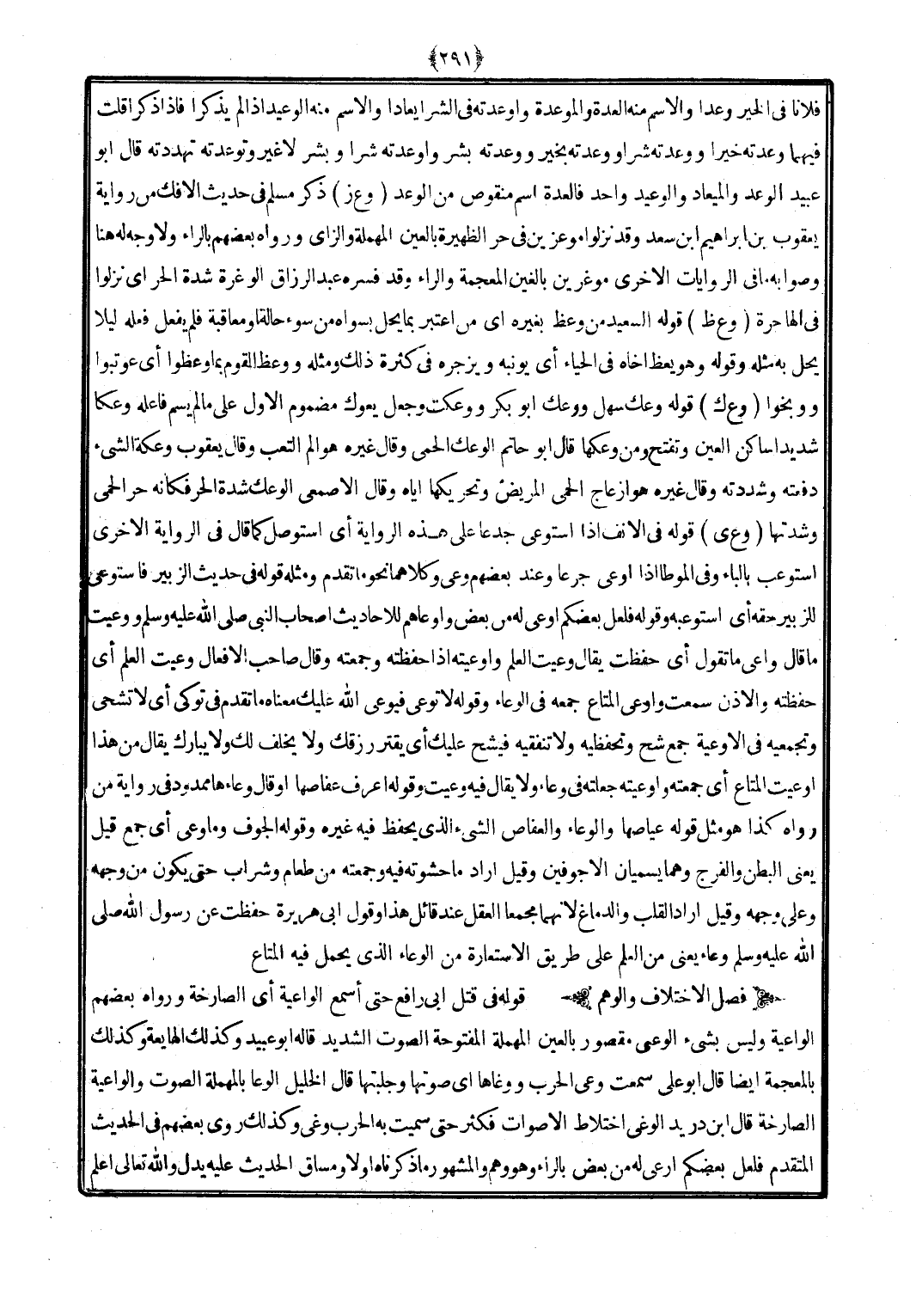 (وع ى) قَوْله فِي الْأنف إِذا استوعى جدعا على هَذِه الرِّوَايَة أَي استوصل كَمَا قَالَ فِي الرِّوَايَة الْأُخْرَى استوعب بِالْبَاء وَفِي الْمُوَطَّأ إِذا أوعى جرعا وَعند بَعضهم وعى وَكِلَاهُمَا نَحْو مَا تقدم وَمثله قَوْله فِي حَدِيث الزبير فاستوعى للزبير حَقه أَي استوعبه وَقَوله فَلَعَلَّ بَعْضكُم أوعى لَهُ من بعض وأوعاهم للأحاديث أَصْحَاب النَّبِي (صلى الله عَلَيْهِ وَسلم) ووعيت مَا قَالَ وأعي مَا تَقول أَي حفظت يُقَال وعيت الْعلم وأوعيته إِذا حفظته وَجمعته وَقَالَ صَاحب الْأَفْعَال وعيت الْعلم أَي حفظته والاذن سَمِعت وأوعى الْمَتَاع جمعه فِي الْوِعَاء وَقَوله لَا توعى فيوعى الله عَلَيْك مَعْنَاهُ مَا تقدم فِي توكي أَي لَا تشحى وتجمعيه فِي الأوعية جمع شح وتحفظيه وَلَا تنفقيه فيشح عَلَيْك أَي يقتر رزقك وَلَا يخلف لَك وَلَا يُبَارك يُقَال من هَذَا أوعيت الْمَتَاع أَي جمعته وأوعيته جعلته فِي وعَاء وَلَا يُقَال فِيهِ وعيت وَقَوله أعرف عفاصها أَو قَالَ وعاءها مَمْدُود فِي رِوَايَة من رَوَاهُ كَذَا هُوَ مثل قَوْله عياصها والوعاء والعفاص الشَّيْء الَّذِي يحفظ فِيهِ غَيره وَقَوله الْجوف وَمَا وعي أَي جمع قيل يَعْنِي الْبَطن والفرج وهما يسميان الأجوفين وَقيل أَرَادَ مَا حشوته فِيهِ وَجمعته من طَعَام وشراب حَتَّى يكون من وَجهه وعَلى وَجهه وَقيل أَرَادَ الْقلب والدماغ لِأَنَّهُمَا مجمعا الْعقل عِنْد قَائِل هَذَا وَقَول أبي هُرَيْرَة حفظت عَن رَسُول الله (صلى الله عَلَيْهِ وَسلم) وعَاء يَعْنِي من الْعلم على طَرِيق الِاسْتِعَارَة من الْوِعَاء الَّذِي يحمل فِيهِ الْمَتَاع.