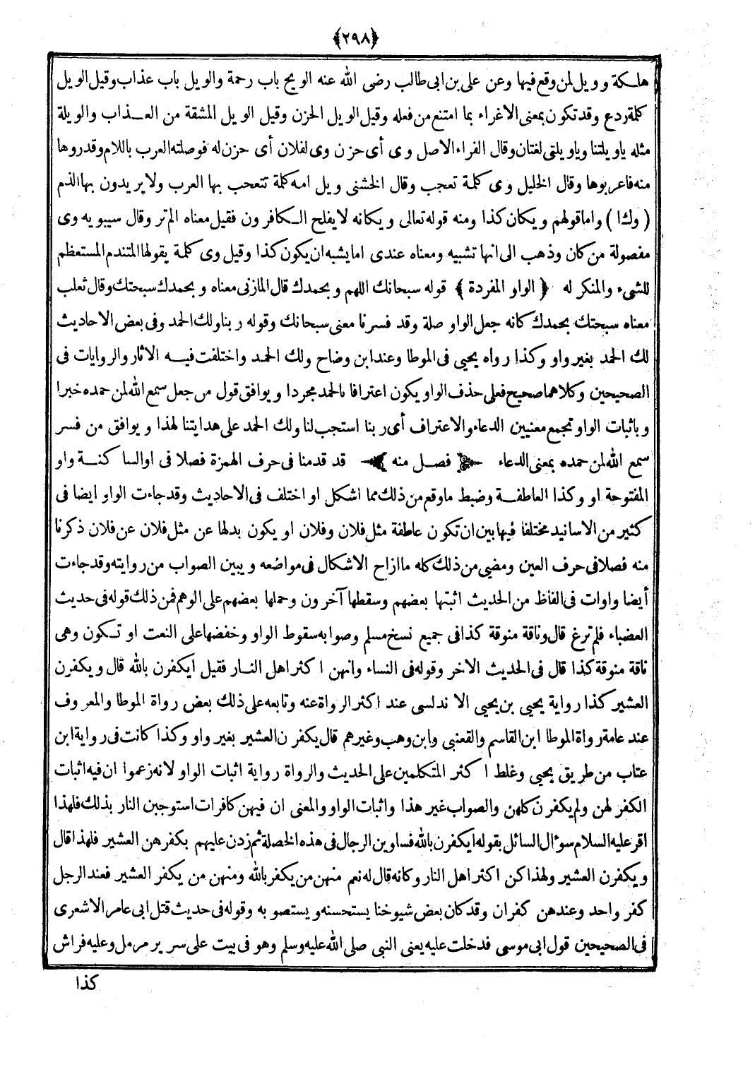 قد قدمنَا فِي حرف الْهمزَة فصلا فِي أَو الساكنة وَاو الْمَفْتُوحَة أَو وَكَذَا العاطفة وَضبط مَا وَقع من ذَلِك مِمَّا أشكل أَو اخْتلف فِي الْأَحَادِيث وَقد جَاءَت الْوَاو أَيْضا فِي كثير من الْأَسَانِيد مُخْتَلفا فِيهَا بَين أَن تكون عاطفة مثل فلَان وَفُلَان أَو يكون بدلهَا عَن مثل فلَان عَن فلَان ذكرنَا مِنْهُ فصلا فِي حرف الْعين وَمضى من ذَلِك كُله مَا أزاح الأشكال فِي موَاضعه وَيبين الصَّوَاب من رِوَايَته وَقد جَاءَت أَيْضا وأوات فِي أَلْفَاظ من الحَدِيث أثبتها بَعضهم وسقطها آخَرُونَ وَحملهَا بَعضهم على الْوَهم فَمن ذَلِك قَوْله فِي حَدِيث العضباء فَلم ترغ قَالَ وناقة منوقة كَذَا فِي جَمِيع نسخ مُسلم وَصَوَابه سُقُوط الْوَاو وخفضها على النَّعْت أَو تكون وَهِي نَاقَة منوقة كَذَا قَالَ فِي الحَدِيث الآخر وَقَوله فِي النِّسَاء وأنهن أَكثر أهل النَّار فَقيل أيكفرن بِاللَّه قَالَ ويكفرن العشير كَذَا رِوَايَة يحيى بن يحيى الأندلسي عِنْد أَكثر الروَاة عَنهُ وَتَابعه على ذَلِك بعض رُوَاة الْمُوَطَّأ وَالْمَعْرُوف عِنْد عَامَّة رُوَاة الْمُوَطَّأ ابْن الْقَاسِم والقعنبي وَابْن وهب وَغَيرهم قَالَ يكفرن العشير بِغَيْر وَاو وَكَذَا كَانَت فِي رِوَايَة ابْن عتاب من طَرِيق يحيى وَغلط أَكثر الْمُتَكَلِّمين على الحَدِيث والرواة رِوَايَة إِثْبَات الْوَاو لِأَنَّهُ زَعَمُوا أَن فِيهِ إِثْبَات الْكفْر لَهُنَّ وَلم يكفرن كُلهنَّ وَالصَّوَاب غير هَذَا وَإِثْبَات الْوَاو وَالْمعْنَى أَن فِيهِنَّ كافرات استوجبن النَّار بذلك فَلهَذَا أقرّ (صلى الله عَلَيْهِ وَسلم) سُؤال السَّائِل بقوله أيكفرن بِاللَّه فساوين الرِّجَال فِي هَذِه الْخصْلَة ثمَّ زدن عَلَيْهِم بكفرهن العشير فَلهَذَا قَالَ ويكفرن العشير وَلِهَذَا كن أَكثر أهل النَّار وَكَأَنَّهُ قَالَ لَهُ نعم مِنْهُنَّ من يكفر بِاللَّه ومنهن من يكفر العشير فَعِنْدَ الرجل كفر وَاحِد وعندهن كفران وَقد كَانَ بعض شُيُوخنَا يستحسنه ويستصوبه وَقَوله فِي حَدِيث قتل أبي عَامر الْأَشْعَرِيّ فِي الصَّحِيحَيْنِ قَول أبي مُوسَى فَدخلت عَلَيْهِ يَعْنِي النَّبِي (صلى الله عَلَيْهِ وَسلم) وَهُوَ فِي بَيت على سَرِير مرمل وَعَلِيهِ فرَاش