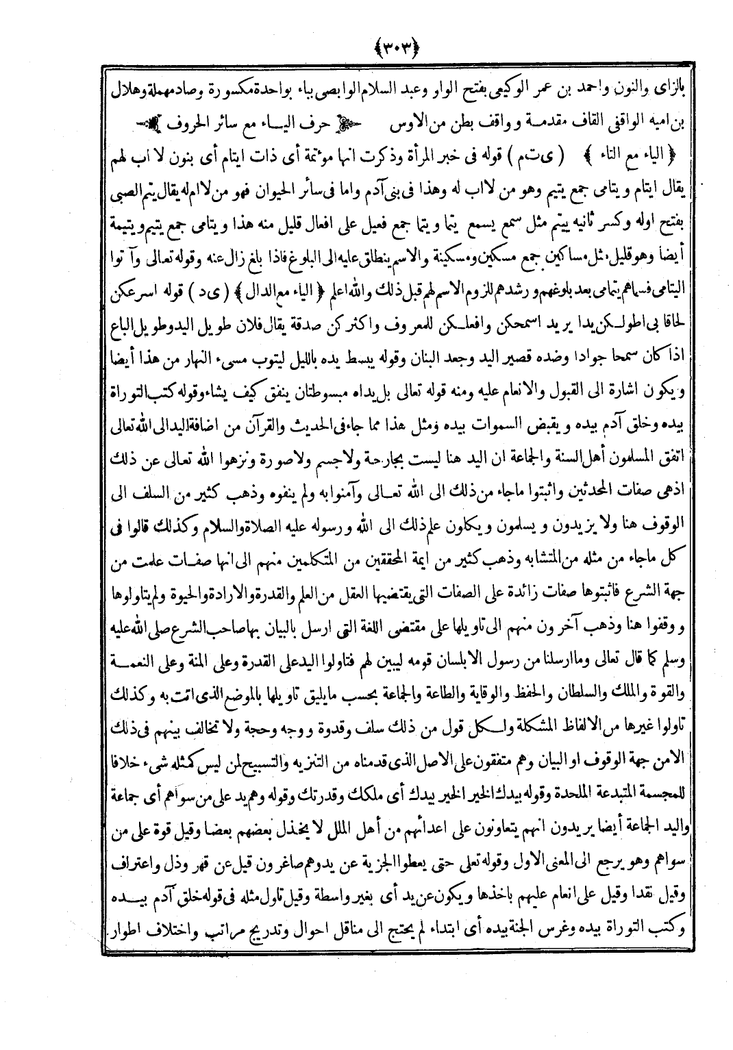 (وَقَوله كتب التَّوْرَاة بِيَدِهِ وَخلق آدم بِيَدِهِ وَيقبض السَّمَوَات بِيَدِهِ وَمثل هَذَا مِمَّا جَاءَ فِي الحَدِيث وَالْقُرْآن من إِضَافَة الْيَد إِلَى الله تَعَالَى اتّفق الْمُسلمُونَ أهل السّنة وَالْجَمَاعَة أَن الْيَد هُنَا لَيست بجارحة وَلَا جسم وَلَا صُورَة ونزهوا الله تَعَالَى عَن ذَلِك إِذْ هِيَ صِفَات الْمُحدثين واثبتوا مَا جَاءَ من ذَلِك إِلَى الله تَعَالَى وآمنوا بِهِ وَلم ينفوه وَذهب كثير من السّلف إِلَى الْوُقُوف هُنَا وَلَا يزِيدُونَ ويسلمون ويكلون علم ذَلِك إِلَى الله وَرَسُوله (صلى الله عَلَيْهِ وَسلم) وَكَذَلِكَ قَالُوا فِي كل مَا جَاءَ من مثله من الْمُتَشَابه وَذهب كثير من أَئِمَّة الْمُحَقِّقين من الْمُتَكَلِّمين مِنْهُم إِلَى أَنَّهَا صِفَات علمت من جِهَة الشَّرْع فأثبتوها صِفَات زَائِدَة على الصِّفَات الَّتِي يقتضيها الْعقل من الْعلم وَالْقُدْرَة والإرادة والحيوة وَلم يتأولوها ووقفوا هُنَا وَذهب آخَرُونَ مِنْهُم إِلَى تَأْوِيلهَا على مُقْتَضى اللُّغَة الَّتِي أرسل بِالْبَيَانِ بهَا صَاحب الشَّرْع (صلى الله عَلَيْهِ وَسلم) كَمَا قَالَ تَعَالَى وَمَا أرسلنَا من رَسُول إِلَّا بِلِسَان قومه ليبين لَهُم فتأولوا الْيَد على الْقُدْرَة وعَلى الْمِنَّة وعَلى النِّعْمَة وَالْقُوَّة وَالْملك وَالسُّلْطَان وَالْحِفْظ والوقاية وَالطَّاعَة وَالْجَمَاعَة بِحَسب مَا يَلِيق تَأْوِيلهَا بالموضع الَّذِي أَتَت بِهِ وَكَذَلِكَ تأولوا غَيرهَا من الْأَلْفَاظ المشكلة وَلكُل قَول من ذَلِك سلف وقدوة وَوجه وَحجَّة وَلَا تخَالف بَينهم فِي ذَلِك إِلَّا من جِهَة الْوُقُوف أَو الْبَيَان وهم متفقون على الأَصْل الَّذِي قدمْنَاهُ من التَّنْزِيه وَالتَّسْبِيح لمن لَيْسَ كمثله شَيْء خلافًا للمجسمة المتبدعة الملحدة وَقَوله بِيَدِك الْخَيْر الْخَيْر بِيَدِك أَي ملكك وقدرتك وَقَوله وهم يَد على من سواهُم أَي جمَاعَة وَالْيَد الْجَمَاعَة أَيْضا يُرِيدُونَ أَنهم يتعاونون على أعدائهم من أهل الْملَل لَا يخذل بَعضهم بَعْضًا وَقيل قُوَّة على من سواهُم وَهُوَ يرجع إِلَى الْمَعْنى الأول وَقَوله تَعَالَى) حَتَّى يُعْطوا الْجِزْيَة عَن يَد وهم صاغرون