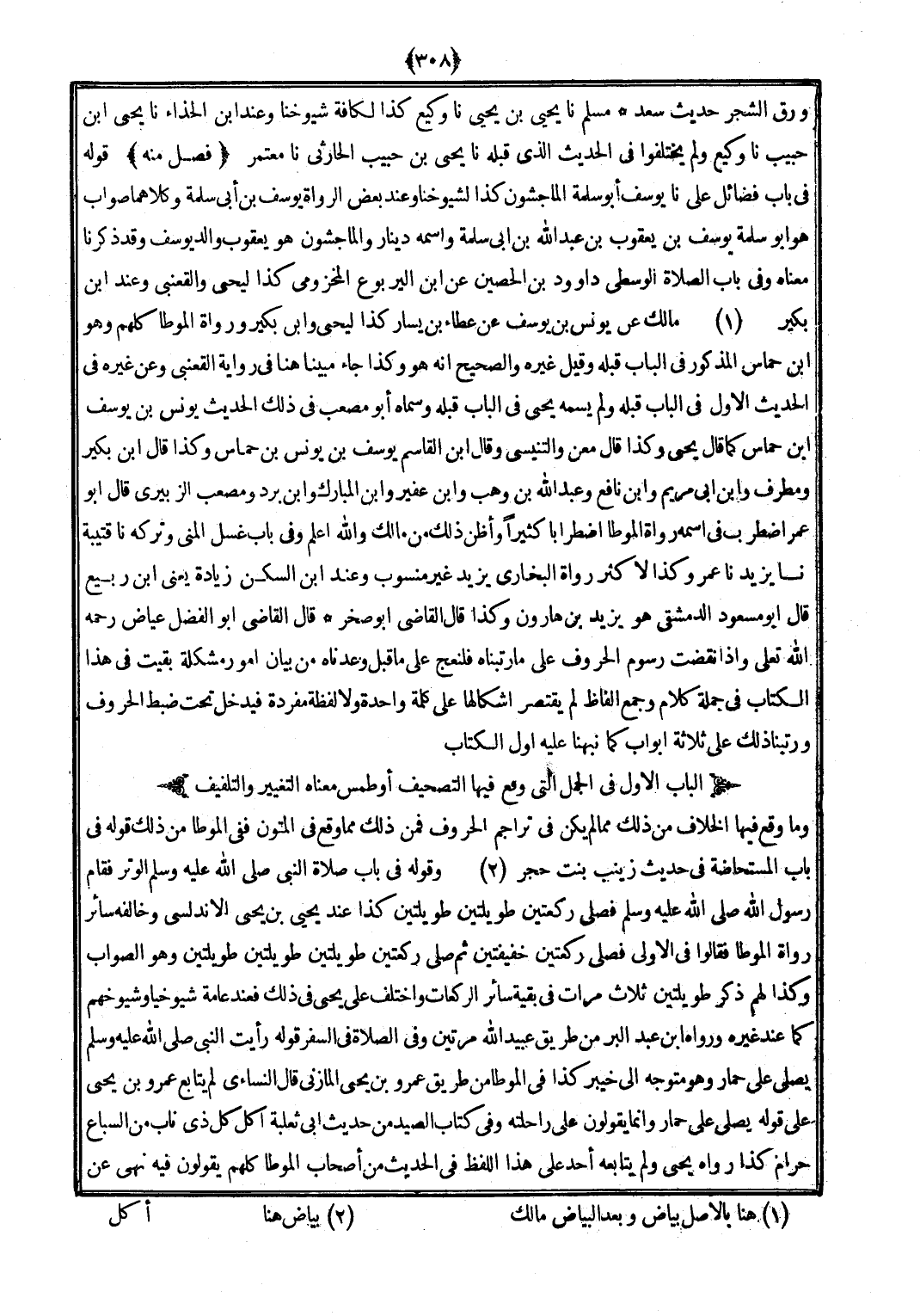 وَمَا وَقع فِيهَا الْخلاف من ذَلِك مِمَّا لم يكن فِي تراجم الْحُرُوف فَمن ذَلِك مِمَّا وَقع فِي الْمُتُون فَفِي الْمُوَطَّأ من ذَلِك قَوْله فِي بَاب الْمُسْتَحَاضَة فِي حَدِيث زَيْنَب بنت حجر وَقَوله فِي بَاب صَلَاة النَّبِي (صلى الله عَلَيْهِ وَسلم) الْوتر فَقَامَ رَسُول الله (صلى الله عَلَيْهِ وَسلم) فصلى رَكْعَتَيْنِ طويلتين طويلتين كَذَا عِنْد يحيى بن يحيى الأندلسي وَخَالفهُ سَائِر رُوَاة الْمُوَطَّأ فَقَالُوا فِي الأولى فصلى رَكْعَتَيْنِ خفيفتين ثمَّ صلى رَكْعَتَيْنِ طويلتين طويلتين طويلتين وَهُوَ الصَّوَاب وَكَذَا لَهُم ذكر طويلتين ثَلَاث مَرَّات فِي بَقِيَّة سَائِر الرَّكْعَات وَاخْتلف على يحيى فِي ذَلِك فَعِنْدَ عَامَّة شُيُوخنَا وشيوخهم كَمَا عِنْد غَيره وَرَوَاهُ ابْن عبد الْبر من طَرِيق عبيد الله مرَّتَيْنِ وَفِي الصَّلَاة فِي السّفر قَوْله رَأَيْت النَّبِي (صلى الله عَلَيْهِ وَسلم) يُصَلِّي على حمَار وَهُوَ مُتَوَجّه إِلَى خَيْبَر كَذَا فِي الْمُوَطَّأ من طَرِيق عَمْرو بن يحيى الْمَازِني قَالَ النَّسَائِيّ لم يُتَابع عَمْرو بن يحيى على قَوْله يُصَلِّي على حمَار وَإِنَّمَا يَقُولُونَ على رَاحِلَته وَفِي كتاب الصَّيْد من حَدِيث أبي ثَعْلَبَة أكل كل ذِي نَاب من السبَاع حرَام كَذَا رَوَاهُ يحيى وَلم يُتَابِعه أحد على هَذَا اللَّفْظ فِي الحَدِيث من اصحاب الْمُوَطَّأ كلهم يَقُولُونَ فِيهِ نهى عَن