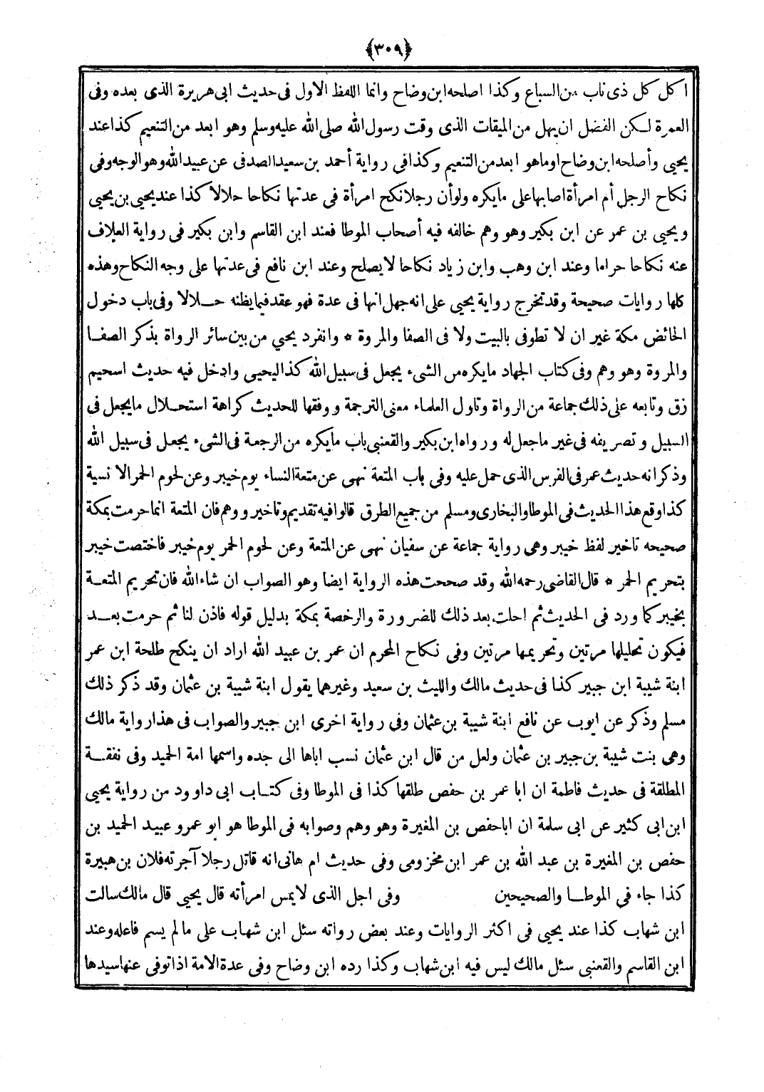 أكل كل ذِي نَاب من السبَاع وَكَذَا أصلحه ابْن وضاح وَإِنَّمَا اللَّفْظ الأول فِي حَدِيث أبي هُرَيْرَة الَّذِي بعده وَفِي الْعمرَة لَكِن الْفضل أَن يهل من الْمِيقَات الَّذِي وَقت رَسُول الله (صلى الله عَلَيْهِ وَسلم) وَهُوَ أبعد من التَّنْعِيم كَذَا عِنْد يحيى وَأَصْلحهُ ابْن وضاح أَو مَا هُوَ أبعد من التَّنْعِيم وَكَذَا فِي رِوَايَة أَحْمد بن سعيد الصَّدَفِي عَن عبيد الله وَهُوَ الْوَجْه وَفِي نِكَاح الرجل أم امْرَأَة أَصَابَهَا على مَا يكره وَلَو أَن رجلا نكح امْرَأَة فِي عدتهَا نِكَاحا حَلَالا كَذَا عِنْد يحيى بن يحيى وَيحيى بن عمر عَن ابْن بكير وَهُوَ وهم خَالفه فِيهِ أَصْحَاب الْمُوَطَّأ فَعِنْدَ ابْن الْقَاسِم وَابْن بكير فِي رِوَايَة العلاف عَنهُ نِكَاحا حَرَامًا وَعند ابْن وهب وَابْن زِيَاد نِكَاحا لَا يصلح وَعند ابْن نَافِع فِي عدتهَا على وَجه النِّكَاح وَهَذِه كلهَا رِوَايَات صَحِيحَة وَقد تخرج رِوَايَة يحيى على أَنه جهل أَنَّهَا فِي عدَّة فَهُوَ عقد فِيمَا يَظُنّهُ حَلَالا وَفِي بَاب دُخُول الْحَائِض مَكَّة غير أَن لَا تطوفى بِالْبَيْتِ وَلَا فِي الصَّفَا والمروة