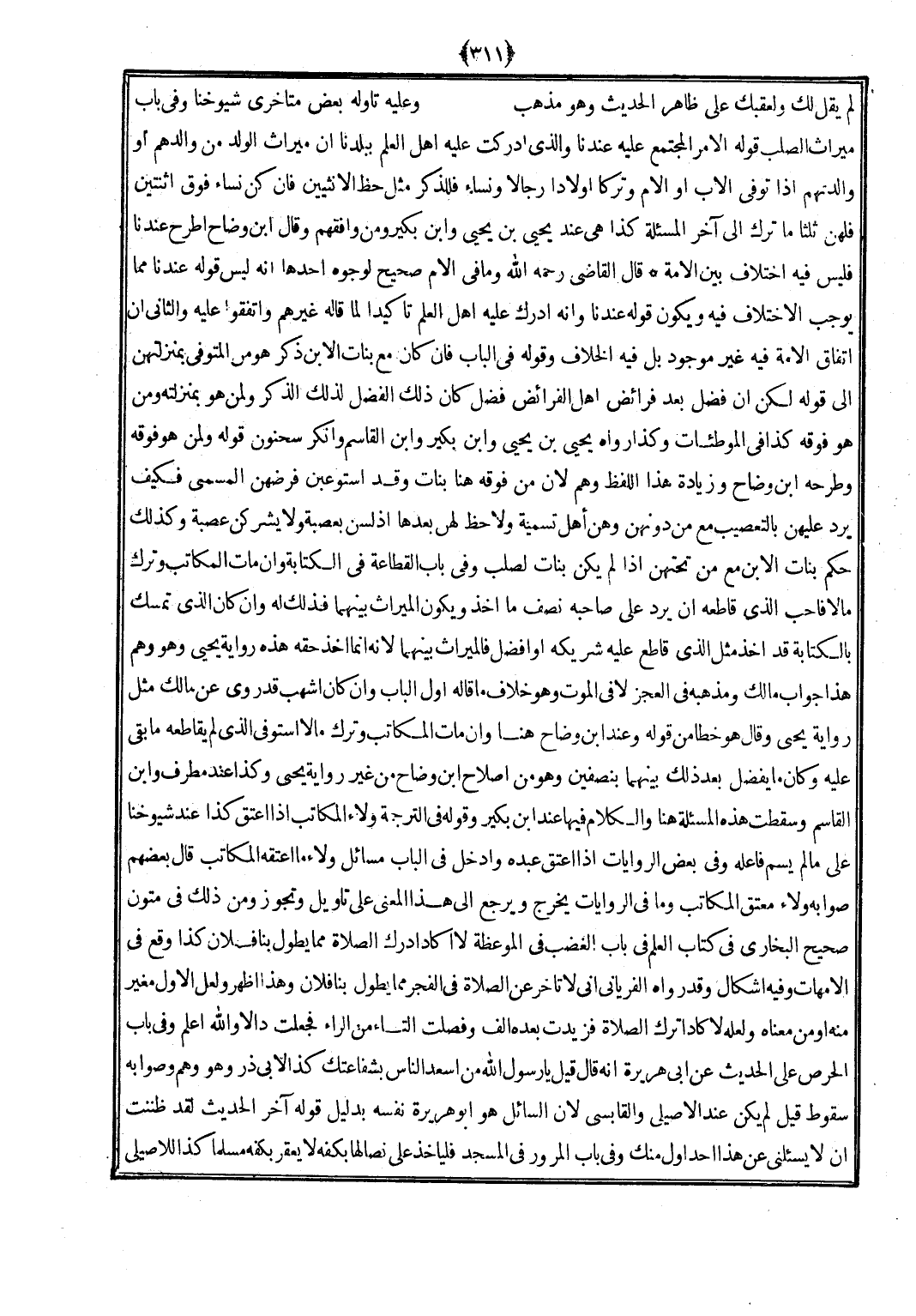 قَالَ القَاضِي رَحمَه الله وَمَا فِي الْأُم صَحِيح لوجوه أَحدهَا أَنه لَيْسَ قَوْله عندنَا مِمَّا يُوجب الِاخْتِلَاف فِيهِ وَيكون قَوْله عندنَا وَأَنه أدْرك عَلَيْهِ أهل الْعلم تَأْكِيدًا لما قَالَه غَيرهم وَاتَّفَقُوا عَلَيْهِ وَالثَّانِي أَن اتِّفَاق الْأمة فِيهِ غير مَوْجُود بل فِيهِ الْخلاف وَقَوله فِي الْبَاب فَإِن كَانَ مَعَ بَنَات الابْن ذكر هُوَ من الْمُتَوفَّى بمنزلتهن إِلَى قَوْله لَكِن أَن فضل بعد فَرَائض أهل الْفَرَائِض فضل كَانَ ذَلِك الْفضل لذَلِك الذّكر وَلمن هُوَ بِمَنْزِلَتِهِ وَمن هُوَ فَوْقه كَذَا فِي الموطئات وَكَذَا رَوَاهُ يحيى بن يحيى وَابْن بكير وَابْن الْقَاسِم وَأنكر سَحْنُون قَوْله وَلمن هُوَ فَوْقه وَطَرحه ابْن وضاح وَزِيَادَة هَذَا اللَّفْظ وهم لِأَن من فَوْقه هُنَا بَنَات وَقد استوعبن فرضهن الْمُسَمّى فَكيف يرد عَلَيْهِنَّ بِالتَّعْصِيبِ مَعَ من دونهن وَهن أهل تَسْمِيَة ولاحظ لَهُنَّ بعْدهَا إِذْ لسن بعصبة وَلَا يُشْرِكْنَ عصبَة وَكَذَلِكَ حكم بَنَات الابْن مَعَ من تحتهن إِذا لم يكن بَنَات لصلب وَفِي بَاب القطاعة فِي الْكِتَابَة وَإِن مَاتَ الْمكَاتب وَترك مَالا فَأحب الَّذِي قاطعه أَن يرد على صَاحبه نصف مَا أَخذ وَيكون الْمِيرَاث بَينهمَا فَذَلِك لَهُ وَإِن كَانَ الَّذِي تمسك بِالْكِتَابَةِ قد أَخذ مثل الَّذِي قَاطع عَلَيْهِ شَرِيكه أَو أفضل فالميراث بَينهمَا لِأَنَّهُ إِنَّمَا أَخذ حَقه هَذِه رِوَايَة يحيى وَهُوَ وهم هَذَا جَوَاب مَالك ومذهبه فِي الْعَجز لَا فِي الْمَوْت وَهُوَ خلاف مَا قَالَه أول الْبَاب وَإِن كَانَ أَشهب قد روى عَن مَالك مثل رِوَايَة يحيى وَقَالَ هُوَ خطأ من قَوْله وَعند ابْن وضاح هُنَا وَإِن مَاتَ الْكَاتِب وَترك مَا لَا استوفى الَّذِي لم يقاطعه مَا بَقِي عَلَيْهِ وَكَانَ مَا يفضل بعد ذَلِك بَينهمَا بنصفين وَهُوَ من إصْلَاح ابْن وضاح من غير رِوَايَة يحيى وَكَذَا عِنْد مطرف وَابْن الْقَاسِم وَسَقَطت هَذِه الْمَسْأَلَة هُنَا وَالْكَلَام فِيهَا عِنْد ابْن بكير وَقَوله فِي التَّرْجَمَة وَلَاء الْمكَاتب إِذا أعتق كَذَا عِنْد شُيُوخنَا على مَا لم يسم فَاعله وَفِي بعض الرِّوَايَات إِذا أعتق عَبده وَأدْخل فِي الْبَاب مسَائِل وَلَاء مَا أعْتقهُ الْمكَاتب قَالَ بَعضهم صَوَابه وَلَاء مُعتق الْمكَاتب وَمَا فِي الرِّوَايَات يخرج وَيرجع إِلَى هَذَا الْمَعْنى على تَأْوِيل وَتجوز وَمن ذَلِك فِي متون صَحِيح البُخَارِيّ فِي كتاب الْعلم فِي بَاب الْغَضَب فِي الموعظة لَا أكاد أدْرك الصَّلَاة مِمَّا يطول بِنَا فلَان كَذَا وَقع فِي الْأُمَّهَات وَفِيه أشكال وَقد رَوَاهُ الْفِرْيَانِيُّ أَنِّي لأتأخر عَن الصَّلَاة فِي الْفجْر مِمَّا يطول بِنَا فلَان وَهَذَا أظهر وَلَعَلَّ الأول مغير مِنْهُ أَو من مَعْنَاهُ وَلَعَلَّه لَا كَاد أترك الصَّلَاة فزيدت بعده ألف وفصلت التَّاء من الرَّاء فَجعلت دَالا وَالله أعلم وَفِي بَاب الْحِرْص على الحَدِيث عَن أبي هُرَيْرَة أَنه قَالَ قيل يَا رَسُول الله من أسعد النَّاس بشفاعتك كَذَا لأبي ذَر وَهُوَ وهم وَصَوَابه سُقُوط قيل لم يكن عِنْد الْأصيلِيّ والقابسي لِأَن السَّائِل هُوَ أَبُو هُرَيْرَة نَفسه بِدَلِيل قَوْله آخر الحَدِيث لقد ظَنَنْت أَن لَا يسألني عَن هَذَا أحد أول مِنْك وَفِي بَاب الْمُرُور فِي الْمَسْجِد فليأخذ على نصالها بكفه لَا يعقر بكفه مُسلما كَذَا للأصيلي