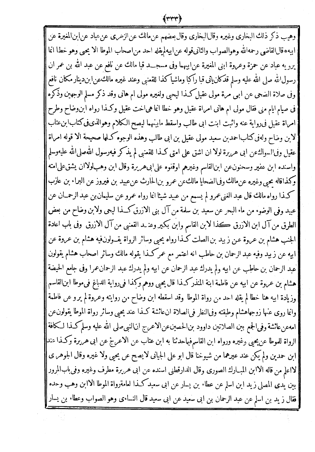 قَالَ القَاضِي رَحمَه الله وَهُوَ الصَّوَاب وَالثَّانِي قَوْله عَن أَبِيه لم يقلهُ أحد من أَصْحَاب الْمُوَطَّأ إِلَّا يحيى وَهُوَ خطأ إِنَّمَا يرويهِ عباد عَن حَمْزَة وَعُرْوَة ابْني الْمُغيرَة عَن أَبِيهِمَا وَفِي مَسْجِد قبا مَالك عَن نَافِع عَن عبد الله بن عمر أَن رَسُول الله (صلى الله عَلَيْهِ وَسلم) قد كَانَ يَأْتِي قبا رَاكِبًا وماشيا كَذَا للقعنبي وَعند غَيره مَالك عَن ابْن دِينَار مَكَان نَافِع وَفِي صَلَاة الضُّحَى عَن أبي مرّة مولى عقيل كَذَا ليحيى وَلغيره مولى أم هاني وَقد ذكر مُسلم الْوَجْهَيْنِ وَذكره فِي صِيَام أَيَّام منى فَقَالَ مولى أم هاني امْرَأَة عقيل وَهُوَ خطأ إِنَّمَا هِيَ أُخْت عقيل وَكَذَا رَوَاهُ ابْن وضاح وَطرح امْرَأَة عقيل فِي رِوَايَة عَنهُ وَأثبت ابنت أبي طَالب وَأسْقط مَا بَينهمَا ليَصِح الْكَلَام وَهُوَ الَّذِي فِي كتاب ابْن عتاب لِابْنِ وضاح وَله فِي كتاب أَحْمد بن سعيد مولى عقيل بن أبي طَالب وَهَذِه الْوُجُوه كلهَا صَحِيحَة إِلَّا قَوْله امْرَأَة عقيل وَفِي السِّوَاك عَن أبي هُرَيْرَة لَوْلَا أَن أشق على أمتِي كَذَا للقعنبي لم يذكر فِيهِ رَسُول الله (صلى الله عَلَيْهِ وَسلم) وأسنده ابْن عفير وَسَحْنُون عَن ابْن الْقَاسِم وَغَيرهم أوقفوه على أبي هُرَيْرَة وَقَالَ ابْن وهب لَوْلَا أَن يشق على أمته وَكَذَا قَالَه يحيى وَغَيره عَن مَالك وَفِي الضَّحَايَا مَالك عَن عَمْرو بن الْحَارِث عَن عبيد بن فَيْرُوز عَن الْبَراء بن عَازِب كَذَا رَوَاهُ مَالك قَالَ عبد الْغَنِيّ عمر وَلم يسمع من عبيد شَيْئا إِنَّمَا رَوَاهُ عَمْرو عَن سُلَيْمَان بن عبد الرَّحْمَن عَن عبيد وَفِي الْوضُوء من مَاء الْبَحْر عَن سعيد بن سَلمَة من آل بني الْأَزْرَق كَذَا ليحيى وَلابْن وضاح من بعض الطّرق من آل ابْن الْأَزْرَق كَذَا لِابْنِ الْقَاسِم وَابْن بكير وَعند القعْنبِي من آل الْأَزْرَق وَفِي بَاب إِعَادَة الْجنب هِشَام بن عُرْوَة عَن زبيد بن الصَّلْت كَذَا رَوَاهُ يحيى وَسَائِر الروَاة يَقُولُونَ فِيهِ هِشَام بن عُرْوَة عَن أَبِيه عَن زبيد وَفِيه عبد الرَّحْمَن بن حَاطِب أَنه اعْتَمر مَعَ عمر كَذَا يَقُوله مَالك وَسَائِر أَصْحَاب هِشَام يَقُولُونَ عبد الرَّحْمَن بن حَاطِب عَن أَبِيه وَلم يدْرك عبد الرَّحْمَن عَن أَبِيه وَلم يدْرك عبد الرَّحْمَن عمرا وَفِي جَامع الْحَيْضَة هِشَام بن عُرْوَة عَن أَبِيه عَن فَاطِمَة ابْنة الْمُنْذر كَذَا قَالَ يحيى وَوهم وَكَذَا فِي رِوَايَة الدّباغ فِي موطأ ابْن الْقَاسِم وَزِيَادَة أَبِيه هُنَا خطأ لم يقلهُ أحد من رُوَاة الْمُوَطَّأ وَقد أسْقطه ابْن وضاح من رِوَايَته وَعُرْوَة لم يرو عَن فَاطِمَة وَإِنَّمَا روى عَنْهَا زَوجهَا هِشَام وطبقته وَفِي النّظر فِي الصَّلَاة أَن عَائِشَة كَذَا عِنْد يحيى وَسَائِر رُوَاة الْمُوَطَّأ يَقُولُونَ عَن أمه عَن عَائِشَة وَفِي الْجمع بَين الصَّلَاتَيْنِ دَاوُود بن الْحصين عَن الْأَعْرَج أَن النَّبِي (صلى الله عَلَيْهِ وَسلم) كَذَا لكافة الروَاة للموطأ عَن يحيى وَغَيره وَرَوَاهُ ابْن الْقَاسِم فِيمَا حَدثنَا بِهِ ابْن عتاب عَن الْأَعْرَج عَن أبي هُرَيْرَة وَكَذَا عِنْد ابْن حمدين وَلم يكن عِنْد عيرهما من شُيُوخنَا قَالَ أَبُو عَليّ الجياني لَا يَصح عَن يحيى وَلَا غَيره وَقَالَ الْجَوْهَرِي لَا أعلم من قَالَه إِلَّا ابْن الْمُبَارك الصُّورِي وَقَالَ الدَّارَقُطْنِيّ أسْندهُ عَن أبي هُرَيْرَة مطرف وَغَيره وَفِي بَاب الْمُرُور بَين يَدي الْمُصَلِّي زيد ابْن أسلم عَن عَطاء بن يسَار عَن أبي سعيد كَذَا لعامة رُوَاة الْمُوَطَّأ إِلَّا ابْن وهب وَحده فَقَالَ زيد بن أسلم عَن عبد الرَّحْمَن بن أبي سعيد عَن أبي سعيد قَالَ النساءي وَهُوَ الصَّوَاب وَعَطَاء بن يسَار