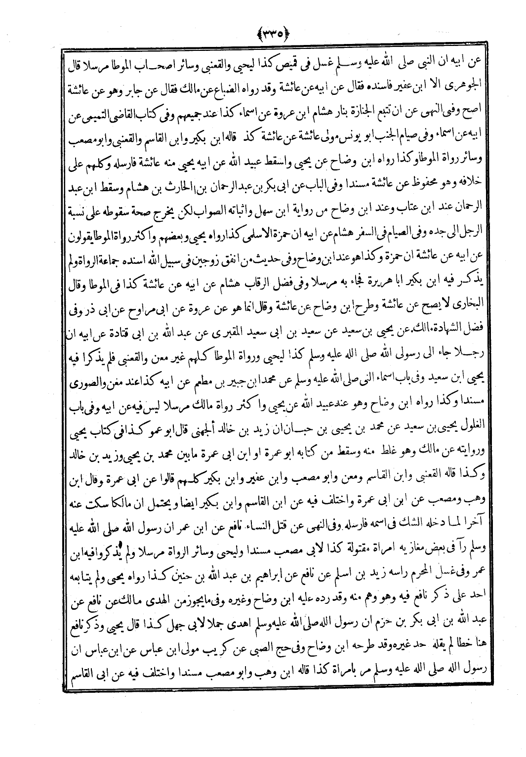عَن أَبِيه أَن النَّبِي (صلى الله عَلَيْهِ وَسلم) غسل فِي قَمِيص كَذَا ليحيى والقعنبي وَسَائِر أَصْحَاب الْمُوَطَّأ مُرْسلا قَالَ الْجَوْهَرِي إِلَّا ابْن عفير فأسنده فَقَالَ عَن أَبِيه عَن عَائِشَة وَقد رَوَاهُ الضباع عَن مَالك فَقَالَ عَن جَابر وَهُوَ عَن عَائِشَة أصح وَفِي النَّهْي عَن أَن تتبع الْجِنَازَة بِنَار هِشَام ابْن عُرْوَة عَن أَسمَاء كَذَا عِنْد جَمِيعهم وَفِي كتاب القَاضِي التَّمِيمِي عَن أَبِيه عَن أَسمَاء وَفِي صِيَام الْجنب أَبُو يُونُس مولى عَائِشَة عَن عَائِشَة كَذَا قَالَه ابْن بكير وَابْن الْقَاسِم والقعنبي وَأَبُو مُصعب وَسَائِر رُوَاة الْمُوَطَّأ وَكَذَا رَوَاهُ ابْن وضاح عَن يحيى واسقط عبيد الله عَن أَبِيه يحيى مِنْهُ عَائِشَة فَأرْسلهُ وَكلهمْ على خِلَافه وَهُوَ مَحْفُوظ عَن عَائِشَة مُسْندًا وَفِي الْبَاب عَن أبي بكر بن عبد الرَّحْمَن بن الْحَارِث بن هِشَام وَسقط ابْن عبد الرَّحْمَن عِنْد ابْن عتاب وَعند ابْن وضاح من رِوَايَة ابْن سهل وإثباته الصَّوَاب لَكِن يخرج صِحَة سُقُوطه على نِسْبَة الرجل إِلَى جده وَفِي الصّيام فِي السّفر هِشَام عَن أَبِيه أَن حَمْزَة الْأَسْلَمِيّ كَذَا رَوَاهُ يحيى وَبَعْضهمْ وَأكْثر رُوَاة الْمُوَطَّأ يَقُولُونَ عَن أَبِيه عَن عَائِشَة أَن حَمْزَة وَكَذَا هُوَ عِنْد ابْن وضاح وَفِي حَدِيث من أنْفق زَوْجَيْنِ فِي سَبِيل الله أسْندهُ جمَاعَة الروَاة وَلم يذكر فِيهِ ابْن بكير أَبَا هُرَيْرَة فجَاء بِهِ مُرْسلا وَفِي فضل الرّقاب هِشَام عَن أَبِيه عَن عَائِشَة كَذَا فِي الْمُوَطَّأ وَقَالَ البُخَارِيّ لَا يَصح عَن عَائِشَة وَطرح ابْن وضاح عَن عَائِشَة وَقَالَ إِنَّمَا هُوَ عَن عُرْوَة عَن أبي مراوح عَن أبي ذَر وَفِي فضل الشَّهَادَة مَالك عَن يحيى بن سعيد عَن سعيد بن أبي سعيد المَقْبُري عَن عبد الله بن أبي قَتَادَة عَن أَبِيه أَن رجلا جَاءَ إِلَى رَسُول الله (صلى الله عَلَيْهِ وَسلم) كَذَا ليحيى ورواة الْمُوَطَّأ كلهم غير معن والقعنبي فَلم يذكرَا فِيهِ يحيى ابْن سعيد وَفِي بَاب أَسمَاء النَّبِي (صلى الله عَلَيْهِ وَسلم) عَن مُحَمَّد بن جُبَير بن مطعم عَن أَبِيه كَذَا عِنْد مغن والصوري مُسْندًا وَكَذَا رَوَاهُ ابْن وضاح وَهُوَ عِنْد عبيد الله عَن يحيى وَأكْثر رُوَاة مَالك مُرْسلا لَيْسَ فِيهِ عَن أَبِيه وَفِي بَاب الْغلُول يحيى بن سعيد عَن مُحَمَّد بن يحيى بن حبَان أَن زيد بن خَالِد الْجُهَنِيّ قَالَ أَبُو عمو كَذَا فِي كتاب يحيى وَرِوَايَته عَن مَالك وَهُوَ غلط مِنْهُ وَسقط من كِتَابه أَبُو عمْرَة أَو ابْن أبي عمْرَة مَا بَين مُحَمَّد بن يحيى وَزيد بن خَالِد وَكَذَا قَالَه القعْنبِي وَابْن الْقَاسِم ومعن وَأَبُو مُصعب وَابْن عفير وَابْن بكير كلهم قَالُوا عَن أبي عمْرَة وَقَالَ ابْن وهب وَمصْعَب عَن ابْن أبي عمْرَة وَاخْتلف فِيهِ عَن ابْن الْقَاسِم وَابْن بكير أَيْضا وَيحْتَمل أَن مَالِكًا سكت عَنهُ آخرا لما دخله الشَّك فِي اسْمه فَأرْسلهُ وَفِي النَّهْي عَن قتل النِّسَاء نَافِع عَن ابْن عمر ان رَسُول الله (صلى الله عَلَيْهِ وَسلم) رآ فِي بعض مغازيه امْرَأَة مقتولة كَذَا لأبي مُصعب مُسْندًا وليحيى وَسَائِر الروَاة مُرْسلا وَلم يذكرُوا فِيهِ ابْن عمر وَفِي غسل الْمحرم رَأسه زيد بن أسلم عَن نَافِع عَن إِبْرَاهِيم بن عبد الله بن حنين كَذَا رَوَاهُ يحيى وَلم يُتَابِعه أحد على ذكر نَافِع فِيهِ وَهُوَ وهم مِنْهُ وَقد رده عَلَيْهِ ابْن وضاح وَغَيره وَفِي مَا يجوز من الْهدى مَالك عَن نَافِع عَن عبد الله بن أبي بكر بن حزم أَن رَسُول الله (صلى الله عَلَيْهِ وَسلم) أهْدى جملا لأبي جهل كَذَا قَالَ يحيى وَذكر نَافِع هُنَا خطأ لم يقلهُ حد غَيره وَقد طَرحه ابْن وضاح وَفِي حج الصَّبِي عَن كريب مولى ابْن عَبَّاس عَن ابْن عَبَّاس أَن رَسُول الله (صلى الله عَلَيْهِ وَسلم) مر بِامْرَأَة ك