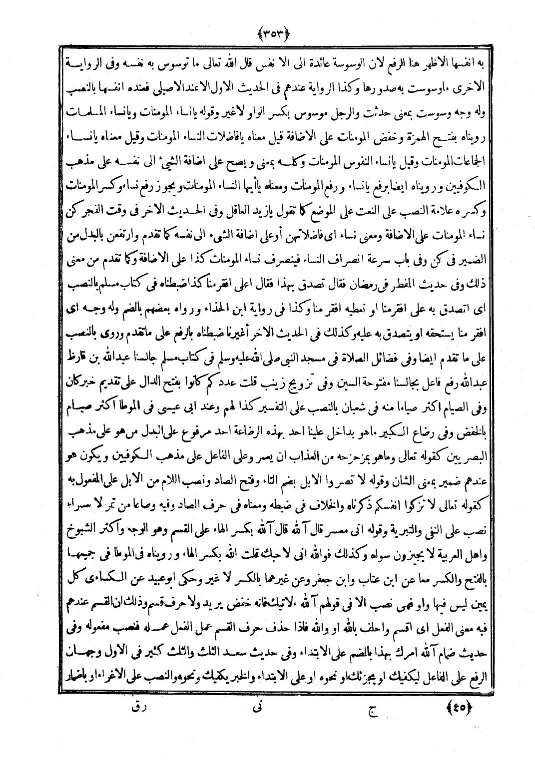 (وَفِي الرِّوَايَة الْأُخْرَى مَا وسوست بِهِ صدورها وَكَذَا الرِّوَايَة عِنْدهم فِي الحَدِيث الأول إِلَّا عِنْد الْأصيلِيّ فَعنده أَنْفسهَا بِالنّصب وَله وَجه وسوست بِمَعْنى حدثت وَالرجل موسوس بِكَسْر الْوَاو لَا غير وَقَوله يَا نسَاء الْمُؤْمِنَات وَيَا نسَاء المسلمات روينَاهُ بِفَتْح الْهمزَة وخفض الْمُؤْمِنَات على الْإِضَافَة قيل مَعْنَاهُ يَا فاضلات النِّسَاء الْمُؤْمِنَات وَقيل مَعْنَاهُ يَا نسَاء الْجَمَاعَات الْمُؤْمِنَات وَقيل يَا نسَاء النُّفُوس الْمُؤْمِنَات وَكله بِمَعْنى وَيصِح على إِضَافَة الشَّيْء إِلَى نَفسه على مَذْهَب الْكُوفِيّين ورويناه أَيْضا بِرَفْع يَا نسَاء وَرفع الْمُؤْمِنَات وَمَعْنَاهُ يَا أَيهَا النِّسَاء الْمُؤْمِنَات وَيجوز رفع نسَاء وَكسر الْمُؤْمِنَات وكسره عَلامَة النصب على النَّعْت على الْموضع كَمَا تَقول يَا زيد الْعَاقِل وَفِي الحَدِيث الآخر فِي وَقت الْفجْر كن نسَاء الْمُؤْمِنَات على الْإِضَافَة وَمعنى نسَاء أَي فاضلاتهن أَو على إِضَافَة الشَّيْء إِلَى نَفسه كَمَا تقدم وارتفعن بِالْبَدَلِ من الضَّمِير فِي كن وَفِي بَاب سرعَة انصراف النِّسَاء فَيَنْصَرِف نسَاء الْمُؤْمِنَات كَذَا على الْإِضَافَة وكما تقدم من معنى ذَلِك وَفِي حَدِيث الْمُفطر فِي رَمَضَان فَقَالَ تصدق بِهَذَا فَقَالَ أَعلَى أفقر منا كَذَا ضبطناه فِي كتاب مُسلم بِالنّصب أَي أَتصدق بِهِ على أفقر منا أَو نُعْطِيه أفقر منا وَكَذَا فِي رِوَايَة ابْن الْحذاء وَرَوَاهُ بَعضهم بِالضَّمِّ وَله وَجه أَي أفقر منا يسْتَحقّهُ أَو يتَصَدَّق بِهِ عَلَيْهِ وَكَذَلِكَ فِي الحَدِيث الآخر أغيرنا ضبطناه بِالرَّفْع على مَا تقدم وروى بِالنّصب على مَا تقدم أَيْضا وَفِي فَضَائِل الصَّلَاة فِي مَسْجِد النَّبِي (صلى الله عَلَيْهِ وَسلم) فِي كتاب مُسلم جالسنا عبد الله بن قارظ عبد الله رفع فَاعل بجالسنا مَفْتُوحَة السِّين وَفِي تَزْوِيج زَيْنَب قلت عدد كم كَانُوا بِفَتْح الدَّال على تَقْدِيم خبر كَانَ وَفِي الصّيام أَكثر صياما مِنْهُ فِي شعْبَان بِالنّصب على التَّفْسِير كَذَا لَهُم وَعند أبي عِيسَى فِي الْمُوَطَّأ أَكثر صِيَام بالخفض وَفِي رضَاع الْكَبِير مَا هُوَ بداخل علينا أحد بِهَذِهِ الرضَاعَة أحد مَرْفُوع على الْبَدَل من هُوَ على مَذْهَب الْبَصرِيين كَقَوْلِه تَعَالَى) وَمَا هُوَ بمزحزحه من الْعَذَاب أَن يعمر