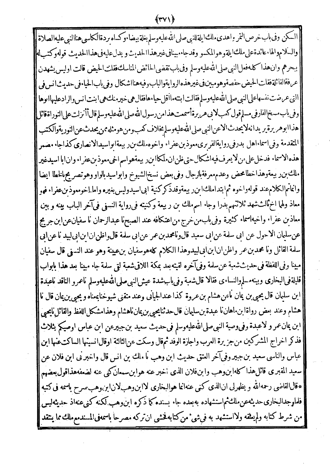 السكن وَفِي بَاب خرص التَّمْر وَأهْدى ملك ايلة للنَّبِي (صلى الله عَلَيْهِ وَسلم) بغلة بَيْضَاء وكساه بردة الكاسي هُنَا النَّبِي (صلى الله عَلَيْهِ وَسلم) وَالْهَاء عَائِدَة على ملك أَيْلَة وَهُوَ المكسو وَقد جَاءَ مُبينًا فِي غير هَذَا الحَدِيث وَيدل عَلَيْهِ فِي هَذَا الحَدِيث قَوْله وَكتب لَهُ ببحرهم وَأَن هَذَا كُله فعل النَّبِي (صلى الله عَلَيْهِ وَسلم) وَفِي بَاب تقضي الْحَائِض الْمَنَاسِك فَقلت الْحيض قَالَت أَو لَيْسَ يشهدن عَرَفَة القائلة فَقلت الْحيض حَفْصَة وَهُوَ مُبين فِي غير هَذِه الرِّوَايَة وَالْبَاب وَفِيه هُنَا أشكال وَفِي بَاب الْحيَاء فِي حَدِيث أنس فِي الَّتِي عرضت نَفسهَا على النَّبِي (صلى الله عَلَيْهِ وَسلم) فَقَالَت ابْنَته مَا أقل حياءها فَقَالَ هِيَ خير مِنْك هِيَ ابنت أنس والراد عَلَيْهَا أَبوهَا وَفِي بَاب مسخ الفار فِي مُسلم قَول كَعْب لأبي هُرَيْرَة أسمعت هَذَا من رَسُول الله (صلى الله عَلَيْهِ وَسلم) قَالَ أأنزلت على التَّوْرَاة قَائِل هَذَا أَبُو هُرَيْرَة يُرِيد أَنه لَا يحدث إِلَّا عَن النَّبِي (صلى الله عَلَيْهِ وَسلم) بِخِلَاف كَعْب وَمن هُوَ مثله مِمَّن يحدث عَن التورية والكتب الْمُتَقَدّمَة وَفِي أَسمَاء أهل بدر فِي رِوَايَة الْفربرِي معوذ بن عفراء وَأَخُوهُ ملك بن ربيعَة أَبُو أسيد الْأنْصَارِيّ كَذَا جَاءَ مُضْمر هَذِه الْأَسْمَاء فَدخل على من لَا يعرف فِيهِ أشكال حَتَّى ظن أَن ملكا ابْن ربيعَة هُوَ اسْم أخي معوذ بن عفراء وَأَن أَبَا أسيد غير ملك بن ربيعَة وَهَذَا خطأ مَحْض وَعدم معرفَة بِالرِّجَالِ وَفِي بعض نسخ الشُّيُوخ وَأَبُو أسيد بِالْوَاو وَهُوَ تَصْرِيح بالْخَطَأ أَيْضا وَإِنَّمَا تمّ الْكَلَام عِنْد قَوْله وَأَخُوهُ ثمَّ ابْتَدَأَ ملك ابْن ربيعَة وَقد ذكر كنية أبي أسيد وَلَيْسَ بِغَيْرِهِ وَأما أَخُو معوذ بن عفراء فَهُوَ معَاذ وَلَهُمَا أَخ ثَالِث شهد ثَلَاثَتهمْ بَدْرًا وَجَاء اسْم ملك بن ربيعَة وكنيته فِي رِوَايَة النَّسَفِيّ فِي آخر الْبَاب بَينه وَبَين معَاذ بن عفراء وأخيه أَسمَاء كَثِيرَة وَفِي بَاب من خرج من اعْتِكَافه عِنْد الصُّبْح نَا عبد الرَّحْمَن نَا سُفْيَان عَن ابْن جريج عَن سُلَيْمَان الْأَحول عَن أبي سَلمَة عَن أبي سعيد قَالَ ونا مُحَمَّد بن عمر عَن أبي سَلمَة قَالَ وأظن أَن ابْن أبي لبيد نَا عَن أبي سَلمَة الْقَائِل ونا مُحَمَّد بن عمر وأظن أَن ابْن أبي لبيد وَهَذَا الْكَلَام كُله هُوَ سُفْيَان بن عُيَيْنَة وَهُوَ عِنْد النَّسَفِيّ قَالَ سُفْيَان مُبينًا وَفِي اللَّفْظَة فِي حَدِيث شُعْبَة عَن سَلمَة وَفِي آخِره لَقيته بعد بِمَكَّة اللاقي شُعْبَة لَقِي سَلمَة جَاءَ مُبينًا بعد هَذَا بِأَبْوَاب قَليلَة فِي البُخَارِيّ وَبَينه مُسلم وَالنَّسَائِيّ فَقَالَا قَالَ شُعْبَة وَفِي بَاب شدَّة عَيْش النَّبِي (صلى الله عَلَيْهِ وَسلم) نَا عَمْرو النَّاقِد نَا عَبدة ابْن سُلَيْمَان قَالَ يحيى بن يمَان نَا عَن هِشَام بن عُرْوَة كَذَا عِنْد الجياني وَعند متقني شُيُوخنَا بِمَعْنَاهُ وَيحيى بن يمَان قَالَ نَا هِشَام وَعند بعض رُوَاة ابْن ماهان نَا عَبدة بن سُلَيْمَان قَالَ حَدثنَا يحيى بن يمَان نَا هِشَام وَهَذَا مُشكل اللَّفْظ وَالْقَائِل نَا يحيى ابْن يمَان عمر وَلَا عَبدة وَفِي وَصِيَّة النَّبِي (صلى الله عَلَيْهِ وَسلم) فِي حَدِيث سعيد بن جُبَير عَن ابْن عَبَّاس أوصيكم بِثَلَاث فَذكر إِخْرَاج الْمُشْركين من جَزِيرَة الْعَرَب وإجازة الْوَفْد ثمَّ قَالَ وَسكت عَن الثَّالِثَة أَو قَالَ أنسيتها السَّاكِت عَنْهَا ابْن عَبَّاس وَالنَّاسِي سعيد بن جُبَير وَفِي آخر الْعتْق حَدِيث ابْن وهب نَا ملك بن أنس قَالَ وَأَخْبرنِي ابْن فلَان عَن سعيد المَقْبُري قَائِل هَذَا كُله ابْن وهب وَابْن فلَان الَّذِي أخبر عَنهُ هُوَ ابْن سمْعَان كنى عَنهُ لضَعْفه هَذَا قَول بَع