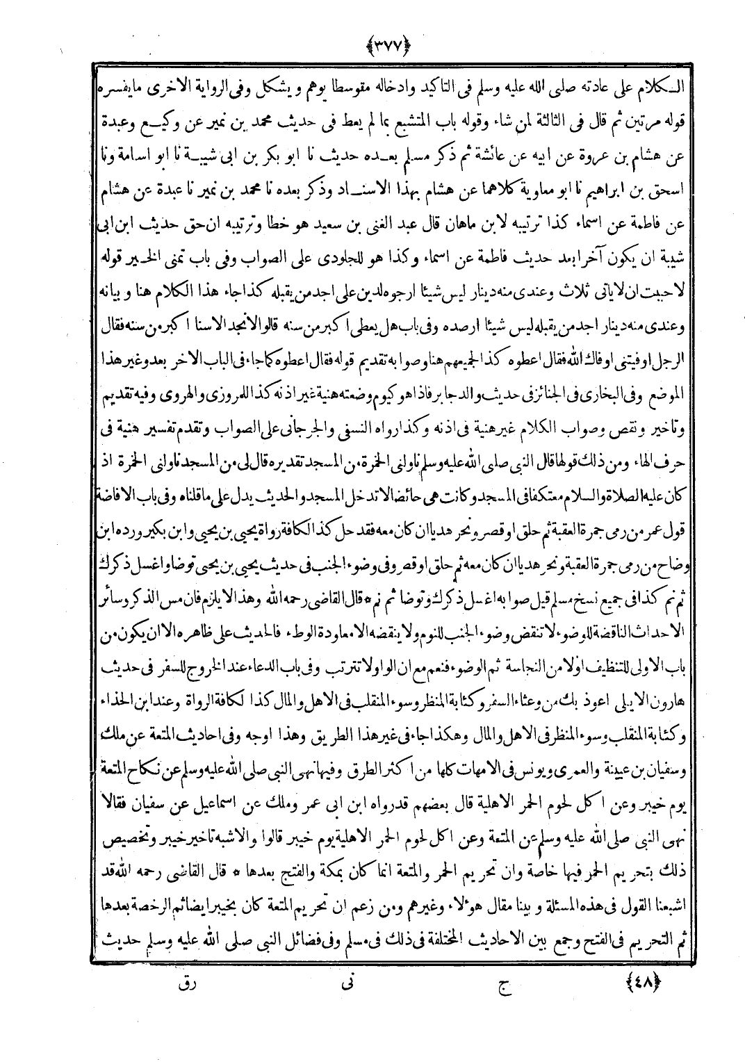 قَالَ القَاضِي رَحمَه الله وَهَذَا لَا يلْزم فَإِن مس الذّكر وَسَائِر الْأَحْدَاث الناقضة للْوُضُوء لَا تنقض وضوء الْجنب للنوم وَلَا ينْقضه إِلَّا معاودة الْوَطْء فَالْحَدِيث على ظَاهره إِلَّا أَن يكون من بَاب الأولى للتنظيف أَولا من النَّجَاسَة ثمَّ الْوضُوء فَنعم مَعَ أَن الْوَاو لَا تترتب وَفِي بَاب الدُّعَاء عِنْد الْخُرُوج للسَّفر فِي حَدِيث هَارُون الْأَيْلِي أعوذ بك من وعثاء السّفر وكئابة المنظر وَسُوء المنقلب فِي الْأَهْل وَالْمَال كَذَا لكافة الروَاة وَعند ابْن الْحذاء وكئابة المنقلب وَسُوء المنظر فِي الْأَهْل وَالْمَال وَهَكَذَا جَاءَ فِي غير هَذَا الطَّرِيق وَهَذَا أوجه وَفِي أَحَادِيث الْمُتْعَة عَن ملك وسُفْيَان بن عُيَيْنَة والعمري وَيُونُس فِي الْأُمَّهَات كلهَا من أَكثر الطّرق وفيهَا نهى النَّبِي (صلى الله عَلَيْهِ وَسلم) عَن نِكَاح الْمُتْعَة يَوْم خَيْبَر وَعَن أكل لُحُوم الْحمر الْأَهْلِيَّة قَالَ بَعضهم قد رَوَاهُ ابْن أبي عمر وَملك عَن إِسْمَاعِيل عَن سُفْيَان فَقَالَا نهى النَّبِي (صلى الله عَلَيْهِ وَسلم) عَن الْمُتْعَة وَعَن أكل لُحُوم الْحمر الْأَهْلِيَّة يَوْم خَيْبَر قَالُوا وَالْأَشْبَه تَأْخِير خَيْبَر وَتَخْصِيص ذَلِك بِتَحْرِيم الْحمر فِيهَا خَاصَّة وَأَن تَحْرِيم الْحمر والمتعة إِنَّمَا كَانَ بِمَكَّة وَالْفَتْح بعْدهَا