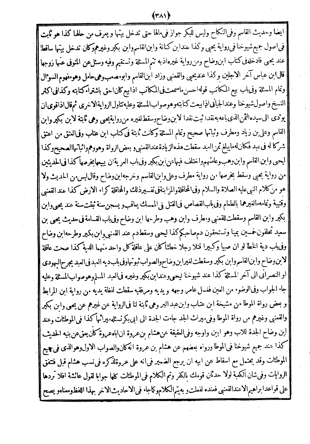 أَيْضا وَحَدِيث الْقَاسِم وَفِي النِّكَاح وَلَيْسَ للبكر جَوَاز فِي مَالهَا حَتَّى تدخل بَيتهَا وَيعرف من حَالهَا كَذَا هُوَ ثَابت فِي أصُول جَمِيع شُيُوخنَا فِي رِوَايَة يحيى وَكَذَا عِنْد ابْن كنَانَة وَابْن الْقَاسِم وَابْن بكير وَغَيرهم وَكَانَ تدخل بَيتهَا سَاقِطا عِنْد يحيى فَأدْخلهُ فِي كتاب ابْن وضاح وَمن رِوَايَة غَيره إِذْ بِهِ تتمّ الْمَسْأَلَة وتستقيم وَفِيه وَسَأَلَ عَن المتوفي عَنْهَا زَوجهَا قَالَ ابْن عَبَّاس آخر الْأَجَليْنِ وَكَذَا عِنْد يحيى والقعنبي وَزَاد ابْن الْقَاسِم وَأَبُو مُصعب وَهِي حَامِل وَهُوَ مَفْهُوم السُّؤَال وَتَمام الْمَسْأَلَة وَفِي بَاب بيع الْمكَاتب قَوْله أحسن مَا سَمِعت فِي الْمكَاتب إِذا بيع كَانَ أَحَق باشتراء كِتَابَته وَكَذَا فِي أَكثر النّسخ وأصول شُيُوخنَا وَعند الجياني إِذا بِيعَتْ كِتَابَته وَهُوَ صَوَاب الْمَسْأَلَة وَعَلِيهِ تتأول الرِّوَايَة الْأُخْرَى ثمَّ قَالَ إِذا قوى أَن يُؤَدِّي إِلَى سَيّده الثّمن الَّذِي بَاعه بِهِ نَقْدا ثَبت نَقْدا لِابْنِ وضاح وَسقط لغيره من رِوَايَة يحيى وَهِي ثَابِتَة لِابْنِ بكير وَابْن الْقَاسِم وَعلي بن زِيَاد ومطرف وثباتها صَحِيح وَتَمام الْمَسْأَلَة وَكَانَت ثَابِتَة فِي كتاب ابْن عتاب وَفِي الْعتْق من أعتق شركا لَهُ فِي عبد فَكَانَ لَهُ مَا يبلغ ثمن العَبْد سَقَطت هَذِه الزِّيَادَة عندا لقعنبي وَبَعض الروَاة وَهُوَ وهم وإثباتها الصَّحِيح وَكَذَا ليحيى وَابْن الْقَاسِم وَابْن وهب وعامتهم وَاخْتلف فِيهَا عَن ابْن بكير وَفِي بَاب الْعرية أَن يَبِيعهَا بِخرْصِهَا كَذَا فِي الْحَدِيثين من رِوَايَة يحيى وَسقط بِخرْصِهَا من رِوَايَة مطرف وَعلي وَابْن الْقَاسِم وخرجه ابْن وضاح وَقَالَ لَيْسَ من الحَدِيث وَلَا هُوَ من كَلَام النَّبِي (صلى الله عَلَيْهِ وَسلم) وَفِي المحاقلة والمزابنة فِي تَفْسِير ذَلِك والمحاقلة كِرَاء الأَرْض كَذَا عِنْد القعْنبِي وقتيبة وَتَمَامه مَا لغَيْرِهِمَا بِالطَّعَامِ وَفِي بَاب الْقصاص فِي الْقَتْل فِي الممسك يُعَاقب ويسجن سنة ثبتَتْ سنة عِنْد يحيى وَابْن بكير وَابْن الْقَاسِم وَسَقَطت للقعنبي ومطرف وَابْن وهب وطرحها ابْن وضاح وَفِي بَاب الْقسَامَة فِي حَدِيث يحيى بن سعيد تحلفون خمسين يَمِينا وتستحقون دم صَاحبكُم كَذَا ليحيى وَسقط دم عِنْد القعْنبِي وَابْن بكير وَطَرحه ابْن وضاح وَفِي بَاب دِيَة الْخَطَأ لَو أَن صَبيا وكبيرا قتلا رجلا خطئا كَانَ على عَاقِلَة كل وَاحِد مِنْهُمَا الدِّيَة كَذَا صحت عَاقِلَة لِابْنِ وضاح وَابْن الْقَاسِم وَابْن بكير وَسَقَطت لغير ابْن وضاح وَالصَّوَاب ثُبُوتهَا وَفِي بَاب دِيَة العَبْد فِي العَبْد يجرح الْيَهُودِيّ أَو النَّصْرَانِي إِلَى آخر الْمَسْأَلَة كَذَا عِنْد شُيُوخنَا ليحيى وَعند ابْن بكير وَغَيره فِي العَبْد الْمُسلم وَهُوَ صَوَاب الْمَسْأَلَة وَعَلِيهِ جَاءَ الْجَواب وَفِي الْوضُوء من الْعين فَغسل عَامر وَجهه وَيَديه ومرفقيه سَقَطت لَفْظَة يَدَيْهِ من رِوَايَة ابْن المرابط وَبَعض رُوَاة الْمُوَطَّأ من مشيخة ابْن عتاب وَابْن عبد الْبر وَهِي ثَابِتَة لنا فِي الرِّوَايَة عَن غَيرهم عَن يحيى وَابْن بكير والقعنبي وَغَيرهم من رُوَاة الْمُوَطَّأ وَفِي مِيرَاث الْجد جَاءَت الْجدّة إِلَى أبي بكر تسأله مِيرَاثهَا كَذَا فِي الموطئات وَعند ابْن وضاح الْجدّة للْأَب وَهُوَ أبين وأوجه وَفِي الْعَقِيقَة عَن هِشَام بن عُرْوَة أَن أَبَاهُ عُرْوَة كَانَ يعق عَن بنيه الحَدِيث كَذَا عِنْد جَمِيع شُيُوخنَا فِي الْمُوَطَّأ وَرَوَاهُ بَعضهم عَن هِشَام بن عُرْوَة أَنه كَانَ وَالصَّوَاب الأول وَهُوَ الَّذِي فِي جَمِيع الموطئات وَقد يحْتَمل مَعَ إِسْقَاط عَن أَبِيه أَن يرجع الضَّمِير فِي أَنه على عُرْوَة لذكره فِي نسب هِشَام قبل فتتفق الرِّوَايَات وَفِي شَأْن الْ