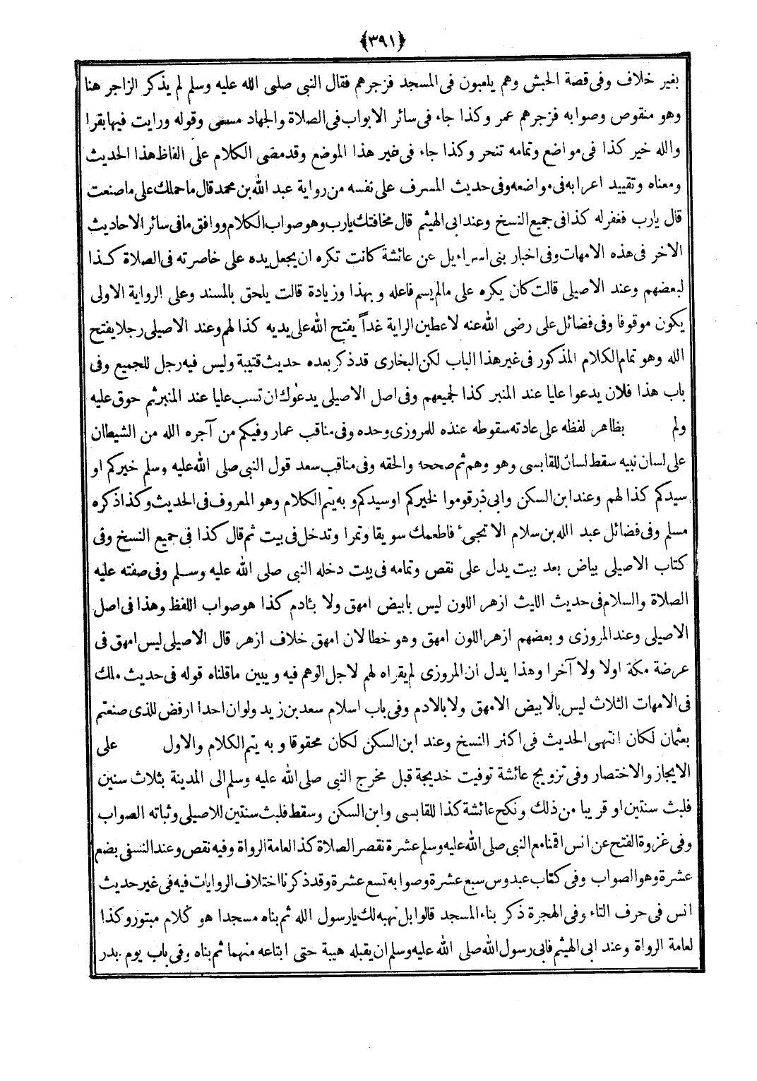 بِغَيْر خلاف وَفِي قصَّة الْحَبَش وهم يَلْعَبُونَ فِي الْمَسْجِد فزجرهم فَقَالَ النَّبِي (صلى الله عَلَيْهِ وَسلم) لم يذكر الزاجر هُنَا وَهُوَ مَنْقُوص وَصَوَابه فزجرهم عمر وَكَذَا جَاءَ فِي سَائِر الْأَبْوَاب فِي الصَّلَاة وَالْجهَاد مُسَمّى وَقَوله وَرَأَيْت فِيهَا بقرًا وَالله خير كَذَا فِي مَوَاضِع وَتَمَامه تنحر وَكَذَا جَاءَ فِي غير هَذَا الْموضع وَقد مضى الْكَلَام على أَلْفَاظ هَذَا الحَدِيث وَمَعْنَاهُ وَتَقْيِيد إعرابه فِي موَاضعه وَفِي حَدِيث المسرف على نَفسه من رِوَايَة عبد الله بن مُحَمَّد قَالَ مَا حملك على مَا صنعت قَالَ يارب فغفر لَهُ كَذَا فِي جَمِيع النّسخ وَعند أبي الْهَيْثَم قَالَ مخافتك يَا رب وَهُوَ صَوَاب الْكَلَام وَوَافَقَ مَا فِي سَائِر الْأَحَادِيث الْأُخَر فِي هَذِه الْأُمَّهَات وَفِي أَخْبَار بني إِسْرَائِيل عَن عَائِشَة كَانَت تكره أَن يَجْعَل يَده على خاصرته فِي الصَّلَاة كَذَا لبَعْضهِم وَعند الْأصيلِيّ قَالَت كَانَ يكره على مَا لم يسم فَاعله وَبِهَذَا وَزِيَادَة قَالَت يلْحق بالمسند وعَلى الرِّوَايَة الأولى يكون مَوْقُوفا وَفِي فَضَائِل على رضى الله عَنهُ لَأُعْطيَن الرَّايَة غَدا يفتح الله على يَدَيْهِ كَذَا لَهُم وَعند الْأصيلِيّ رجلا يفتح الله وَهُوَ تَمام الْكَلَام الْمَذْكُور فِي غير هَذَا الْبَاب لَكِن البُخَارِيّ قد ذكر بعده حَدِيث قُتَيْبَة وَلَيْسَ فِيهِ رجل للْجَمِيع وَفِي بَاب هَذَا فلَان يدعوا عليا عِنْد الْمِنْبَر كَذَا لجميعهم وَفِي أصل الْأصيلِيّ يَدْعُوك أَن تسب عليا عِنْد الْمِنْبَر ثمَّ حوق عَلَيْهِ وَلم بِظَاهِر لَفظه على عَادَته سُقُوطه عِنْده للمروزي وَحده وَفِي مَنَاقِب عمار وَفِيكُمْ من آجره الله من الشَّيْطَان على لِسَان نبيه سقط لِسَان للقابسي وَهُوَ وهم ثمَّ صَححهُ وألحقه وَفِي مَنَاقِب سعد قَول النَّبِي (صلى الله عَلَيْهِ وَسلم) خَيركُمْ أَو سيدكم كَذَا لَهُم وَعند ابْن السكن وَأبي ذَر قومُوا لخيركم أَو سيدكم وَبِه يتم الْكَلَام وَهُوَ الْمَعْرُوف فِي الحَدِيث وَكَذَا ذكره مُسلم وَفِي فَضَائِل عبد الله بن سَلام أَلا تَجِيء فأطعمك سويقا وَتَمْرًا وَتدْخل فِي بَيت ثمَّ قَالَ كَذَا فِي جَمِيع النّسخ وَفِي كتاب الْأصيلِيّ بَيَاض بعد بَيت يدل على نقص وَتَمَامه فِي بَيت دخله النَّبِي (صلى الله عَلَيْهِ وَسلم) وَفِي صفته (صلى الله عَلَيْهِ وَسلم) فِي حَدِيث اللَّيْث أَزْهَر اللَّوْن لَيْسَ بأبيض أمهق وَلَا بِآدَم كَذَا هُوَ صَوَاب اللَّفْظ وَهَذَا فِي أصل الْأصيلِيّ وَعند الْمروزِي وَبَعْضهمْ أَزْهَر اللَّوْن أمهق وَهُوَ خطأ لِأَن أمهق خلاف أَزْهَر قَالَ الْأصيلِيّ لَيْسَ أمهق فِي عرضة مَكَّة أَولا وَلَا آخرا وَهَذَا يدل أَن الْمروزِي لم يقرأه لَهُم لأجل الْوَهم فِيهِ وَيبين مَا قُلْنَاهُ قَوْله فِي حَدِيث ملك فِي الْأُمَّهَات الثَّلَاث لَيْسَ بالأبيض الأمهق وَلَا بِالْأدمِ وَفِي بَاب إِسْلَام سعد بن زيد وَلَو أَن أحدا أرفض للَّذي صَنَعْتُم بعثمان لَكَانَ انْتهى الحَدِيث فِي أَكثر النّسخ وَعند ابْن السكن لَكَانَ محقوقا وَبِه يتم الْكَلَام وَالْأول على الإيجاز والاختصار وَفِي تَزْوِيج عَائِشَة توفيت خَدِيجَة قبل مخرج النَّبِي (صلى الله عَلَيْهِ وَسلم) إِلَى الْمَدِينَة بِثَلَاث سِنِين فَلبث سنتَيْن أَو قَرِيبا من ذَلِك ونكح عَائِشَة كَذَا للقابسي وَابْن السكن وَسقط فَلبث سنتَيْن للأصيلي وثباته الصَّوَاب وَفِي غَزْوَة الْفَتْح عَن أنس أَقَمْنَا مَعَ النَّبِي (صلى الله عَلَيْهِ وَسلم) عشرَة نقصر الصَّلَاة كَذَا الْعَامَّة الروَاة وَفِيه نقص وَعند النَّسَفِيّ بضع عشرَة وَهُوَ الصَّوَاب وَفِي كتاب عَبدُوس سبع عشرَة وَصَوَابه تسع عشرَة وَقد ذكرنَا اخْتِلَاف الرِّوَايَات فِيهِ فِي غير حَدِيث أنس فِي حرف التَّاء وَفِي الْهِجْرَة ذكر بِنَاء الْمَسْجِ