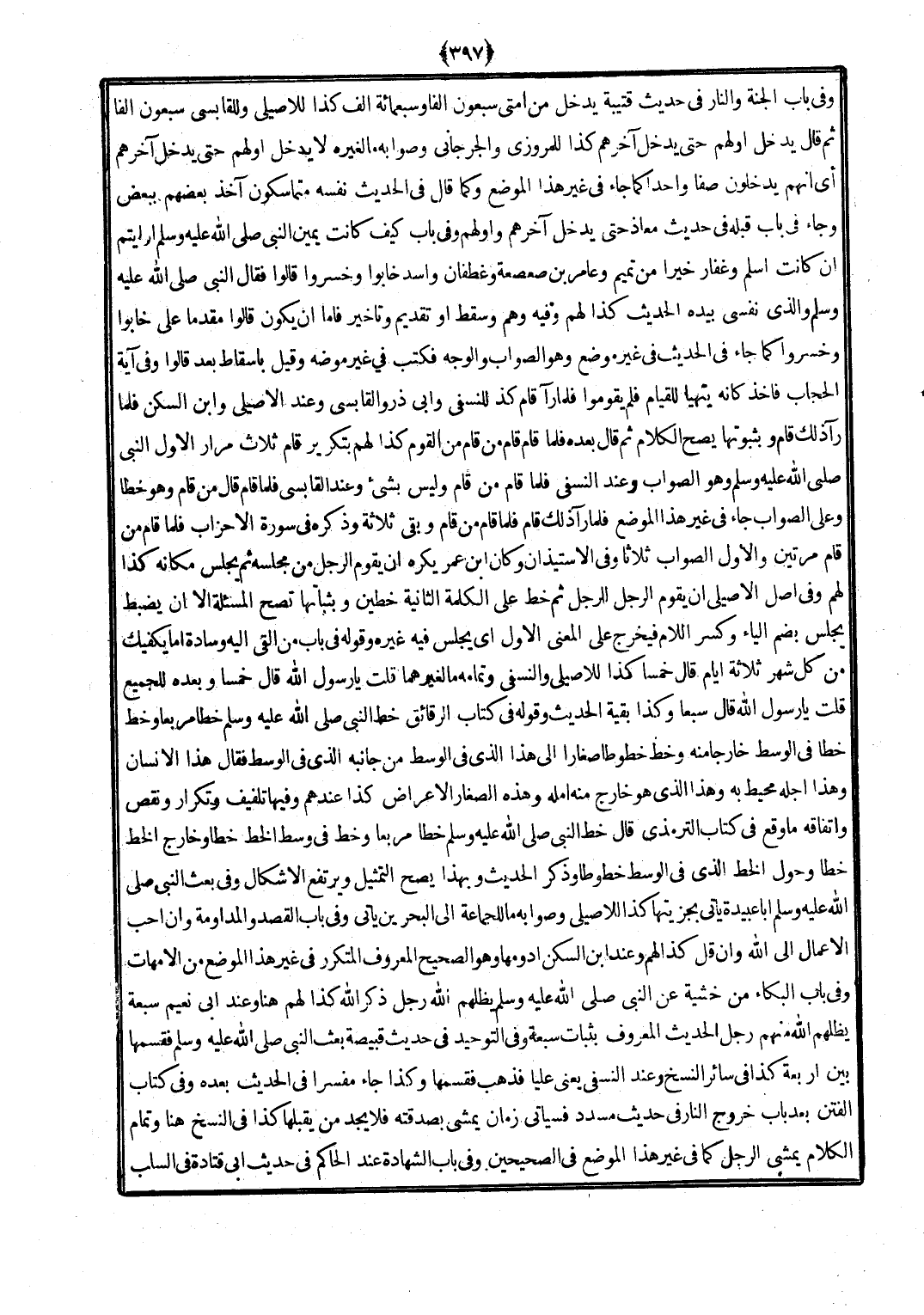 وَفِي بَاب الْجنَّة وَالنَّار فِي حَدِيث قُتَيْبَة يدْخل من أمتِي سَبْعُونَ ألفا وَسَبْعمائة ألف كَذَا للأصيلي وللقابسي سَبْعُونَ ألفا ثمَّ قَالَ يدْخل أَوَّلهمْ حَتَّى يدْخل آخِرهم كَذَا للمروزي والجرجاني وَصَوَابه مَا لغيره لَا يدْخل اولهم حَتَّى يدْخل آخِرهم أَي أَنهم يدْخلُونَ صفا وَاحِدًا كَمَا جَاءَ فِي غير هَذَا الْموضع وكما قَالَ فِي الحَدِيث نَفسه متماسكون آخذ بَعضهم بِبَعْض وَجَاء فِي بَاب قبله فِي حَدِيث معَاذ حَتَّى يدْخل آخِرهم وأولهم وَفِي بَاب كَيفَ كَانَت يَمِين النَّبِي (صلى الله عَلَيْهِ وَسلم) أَرَأَيْتُم إِن كَانَت أسلم وغفار خيرا من تَمِيم وعامر بن صعصعة وغَطَفَان وَأسد خابوا وخسروا قَالُوا فَقَالَ النَّبِي (صلى الله عَلَيْهِ وَسلم) وَالَّذِي نَفسِي بِيَدِهِ الحَدِيث كَذَا لَهُم وَفِيه وهم وَسقط أَو تَقْدِيم وَتَأْخِير فَأَما أَن يكون قَالُوا مقدما على خابوا وخسروا كَمَا جَاءَ فِي الحَدِيث فِي غير موضه وَهُوَ الصَّوَاب وَالْوَجْه فَكتب فِي غير مَوْضِعه وَقيل بِإِسْقَاط بعد قَالُوا وَفِي آيَة الْحجاب فَأخذ كَأَنَّهُ يتهيأ للْقِيَام فَلم يقومُوا فَلَمَّا رآ قَامَ كَذَا للنسفي وَأبي ذَر والقابسي وَعند الْأصيلِيّ وَابْن السكن فَلَمَّا رآ ذَلِك قَامَ وبثبوتها يَصح الْكَلَام ثمَّ قَالَ بعده فَلَمَّا قَامَ قَامَ من قَامَ من الْقَوْم كَذَا لَهُم بتكرير قَامَ ثَلَاث مرار الأول النَّبِي (صلى الله عَلَيْهِ وَسلم) وَهُوَ الصَّوَاب وَعند النَّسَفِيّ فَلَمَّا قَامَ من قَامَ وَلَيْسَ بِشَيْء وَعند الْقَابِسِيّ فَلَمَّا قَامَ قَالَ من قَامَ وَهُوَ خطأ وعَلى الصَّوَاب جَاءَ فِي غير هَذَا الْموضع فَلَمَّا رآ ذَلِك قَامَ فَلَمَّا قَامَ من قَامَ وَبَقِي ثَلَاثَة وَذكره فِي سُورَة الْأَحْزَاب فَلَمَّا قَامَ من قَامَ مرَّتَيْنِ وَالْأول الصَّوَاب ثَلَاثًا وَفِي الاستيذان وَكَانَ ابْن عمر يكره أَن يقوم الرجل من مَجْلِسه ثمَّ يجلس مَكَانَهُ كَذَا لَهُم وَفِي أصل الْأصيلِيّ أَن يقوم الرجل للرجل ثمَّ خطّ على الكلخة الثَّانِيَة خطين وبثباتها تصح الْمَسْأَلَة إِلَّا أَن يضْبط يجلس بِضَم الْيَاء وَكسر اللَّام فَيخرج على الْمَعْنى الأول أَي يجلس فِيهِ غَيره وَقَوله فِي بَاب من ألْقى إِلَيْهِ وسَادَة أما يَكْفِيك من كل شهر ثَلَاثَة أَيَّام قَالَ خمْسا كَذَا للأصيلي والنسفي وَتَمَامه مَا لغَيْرِهِمَا قلت يَا رَسُول الله قَالَ خمْسا وَبعده للْجَمِيع قلت يَا رَسُول الله قَالَ سبعا وَكَذَا بَقِيَّة الحَدِيث وَقَوله فِي كتاب الرَّقَائِق خطّ النَّبِي (صلى الله عَلَيْهِ وَسلم) خطا مربعًا وَخط خطا فِي الْوسط خَارِجا مِنْهُ وَخط خُطُوطًا صغَارًا إِلَى هَذَا الَّذِي فِي الْوسط من جَانِبه الَّذِي فِي الْوسط فَقَالَ هَذَا الْإِنْسَان وَهَذَا أَجله مُحِيط بِهِ وَهَذَا الَّذِي هُوَ خَارج مِنْهُ أمله وَهَذِه الصغار الْأَعْرَاض كَذَا عِنْدهم وفيهَا تلفيف وتكرار وَنقص واتفاقه مَا وَقع فِي كتاب التِّرْمِذِيّ قَالَ خطّ النَّبِي (صلى الله عَلَيْهِ وَسلم) خطأ مربعًا وَخط فِي وسط الْخط خطا وخارج الْخط خطا وحول الْخط الَّذِي فِي الْوسط خُطُوطًا وَذكر الحَدِيث وَبِهَذَا يَصح التَّمْثِيل ويرتفع الأشكال وَفِي بعث النَّبِي (صلى الله عَلَيْهِ وَسلم) أَبَا عُبَيْدَة يَأْتِي بجزيتها كَذَا للأصيلي وَصَوَابه مَا للْجَمَاعَة إِلَى الْبَحْرين يَأْتِي وَفِي بَاب الْقَصْد والمداومة وَإِن أحب الْأَعْمَال إِلَى الله وَإِن قل كَذَا لَهُم وَعند ابْن السكن أدومها وَهُوَ الصَّحِيح الْمَعْرُوف المتكرر فِي غير هَذَا الْموضع من الْأُمَّهَات وَفِي بَاب الْبكاء من خشيَة عَن النَّبِي (صلى الله عَلَيْهِ وَسلم) يظلهم الله رجل ذكر الله كَذَا لَهُم هُنَا وَعند أبي نعيم سَبْعَة يظلهم الله مِنْهُم رجل الحَدِيث الْمَعْرُوف بثبات سَبْعَة وَفِي التَّوْحِيد فِي