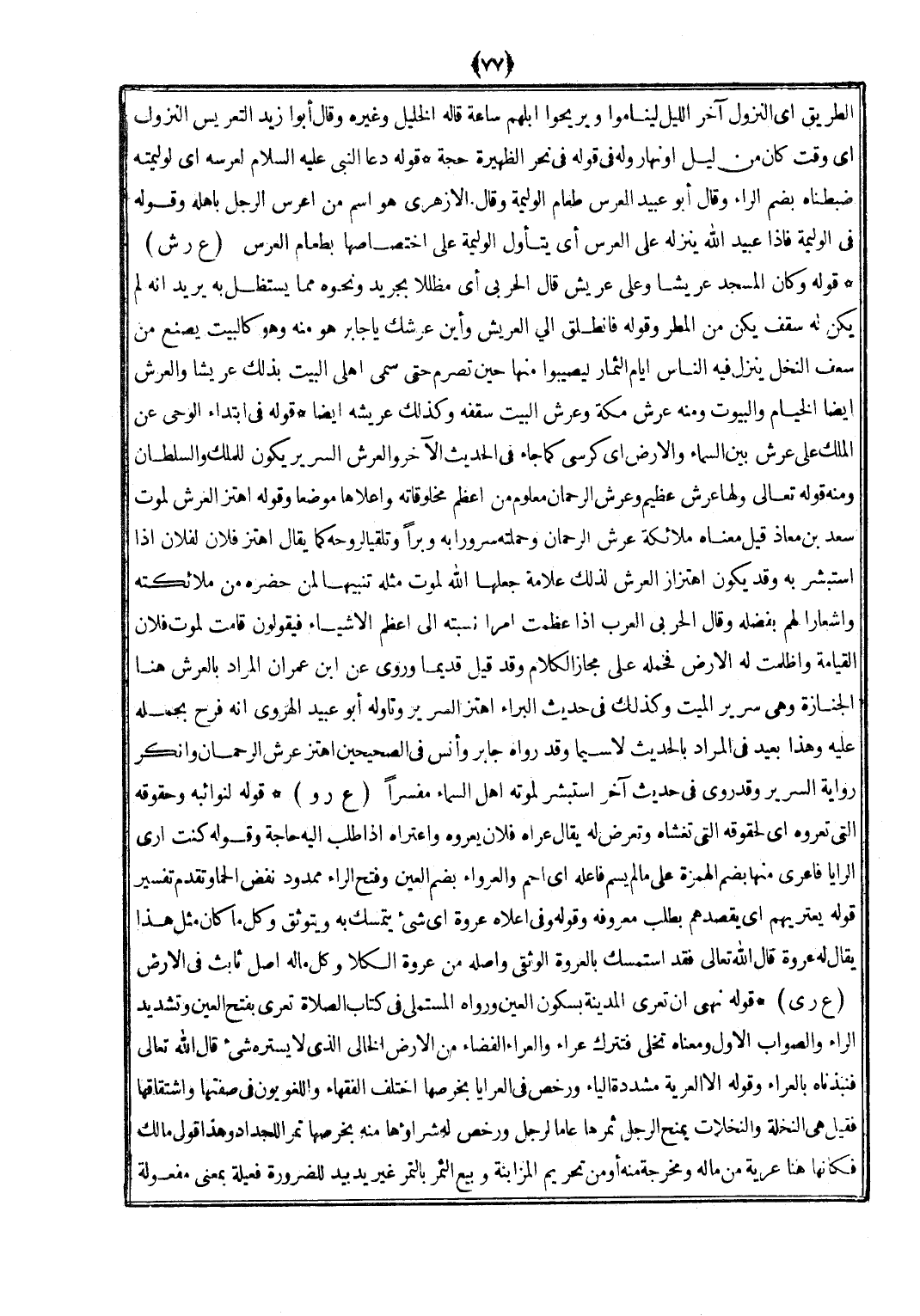 (ع ر ش) قَوْله وَكَانَ الْمَسْجِد عَرِيشًا وعَلى عَرِيش قَالَ الْحَرْبِيّ أَي مظللا بجريد وَنَحْوه مِمَّا يستظل بِهِ يُرِيد أَنه لم يكن لَهُ سقف يكن من الْمَطَر وَقَوله فَانْطَلق إِلَيّ الْعَريش وَأَيْنَ عرشك يَا جَابر هُوَ مِنْهُ وَهُوَ كالبيت يصنع من سعف النّخل ينزل فِيهِ النَّاس أَيَّام الثِّمَار ليصيبوا مِنْهَا حِين تصرم حَتَّى سمي أَهلِي الْبَيْت بذلك عَرِيشًا وَالْعرش أَيْضا الْخيام والبيوت وَمِنْه عرش مَكَّة وعرش الْبَيْت سقفه وَكَذَلِكَ عريشه أَيْضا