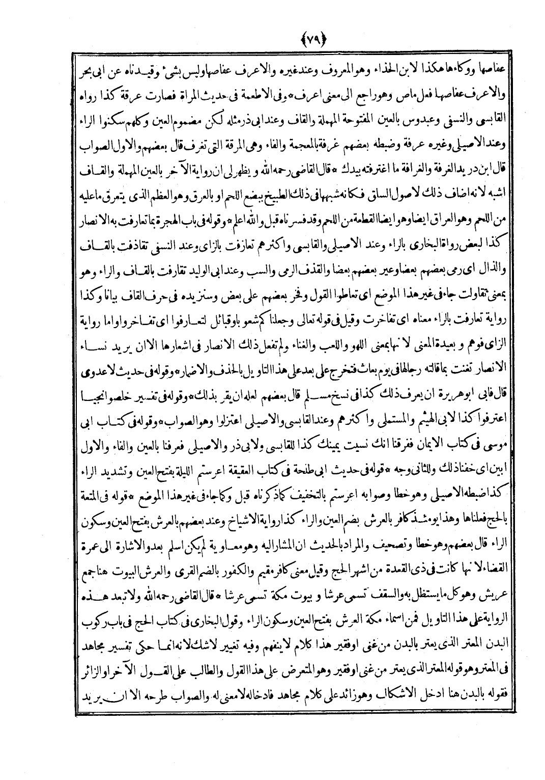 قَالَ القَاضِي رَحمَه الله وَلَا تبعد هَذِه الرِّوَايَة على هَذَا التَّأْوِيل فَمن أَسمَاء مَكَّة الْعَرْش بِفَتْح الْعين وَسُكُون الرَّاء وَقَول البُخَارِيّ فِي كتاب الْحَج فِي بَاب ركُوب الْبدن المعتر الَّذِي يعتر بِالْبدنِ من غَنِي أَو فَقير هَذَا كَلَام لَا ينفهم وَفِيه تَغْيِير لاشك لِأَنَّهُ إِنَّمَا حكى تَفْسِير مُجَاهِد فِي المعتر وَهُوَ قَوْله المعتر الَّذِي يعتر من غَنِي أَو فَقير وَهُوَ المتعرض على هَذَا القَوْل والطالب على القَوْل الآخر أَو الزائر فَقَوله بِالْبدنِ هُنَا ادخل الأشكال وَهُوَ زَائِد على كَلَام مُجَاهِد فإدخاله لَا معنى لَهُ وَالصَّوَاب طَرحه إِلَّا أَن يُرِيد