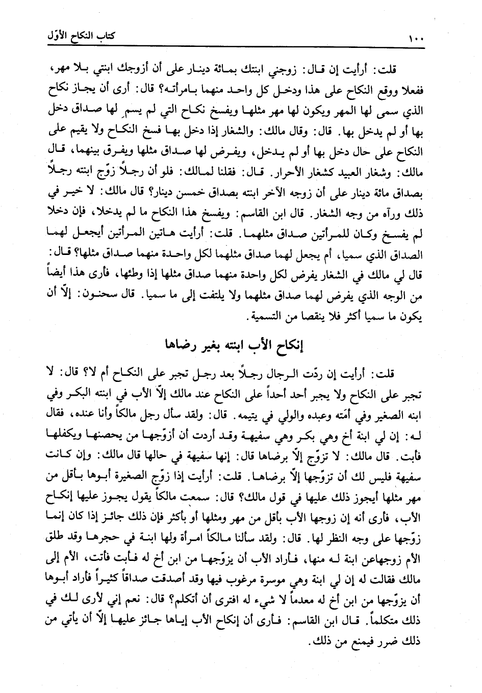 قُلْتُ: أَرَأَيْتَ إنْ رَدَّتْ الرِّجَالَ رَجُلًا بَعْدَ رَجُلٍ تُجْبَرُ عَلَى النِّكَاحِ أَمْ لَا؟ قَالَ: لَا تُجْبَرُ عَلَى النِّكَاحِ وَلَا يُجْبِرُ أَحَدٌ أَحَدًا عَلَى النِّكَاحِ عِنْدَ مَالِكٍ إلَّا الْأَبُ فِي ابْنَتِهِ الْبِكْرِ وَفِي ابْنِهِ الصَّغِيرِ وَفِي أَمَتِهِ وَعَبْدِهِ وَالْوَلِيُّ فِي يَتِيمِهِ، قَالَ: وَلَقَدْ سَأَلَ رَجُلٌ مَالِكًا وَأَنَا عِنْدَهُ، فَقَالَ لَهُ: إنَّ لِي ابْنَةَ أَخٍ وَهِيَ بِكْرٌ وَهِيَ سَفِيهَةٌ وَقَدْ أَرَدْت أَنْ أُزَوِّجَهَا مَنْ يُحْصِنُهَا وَيَكْفُلُهَا فَأَبَتْ قَالَ مَالِكٌ: لَا تُزَوَّجُ إلَّا بِرِضَاهَا قَالَ: إنَّهَا سَفِيهَةٌ فِي حَالِهَا قَالَ مَالِكٌ: وَإِنْ كَانَتْ سَفِيهَةً فَلَيْسَ لَك أَنْ تُزَوِّجَهَا إلَّا بِرِضَاهَا