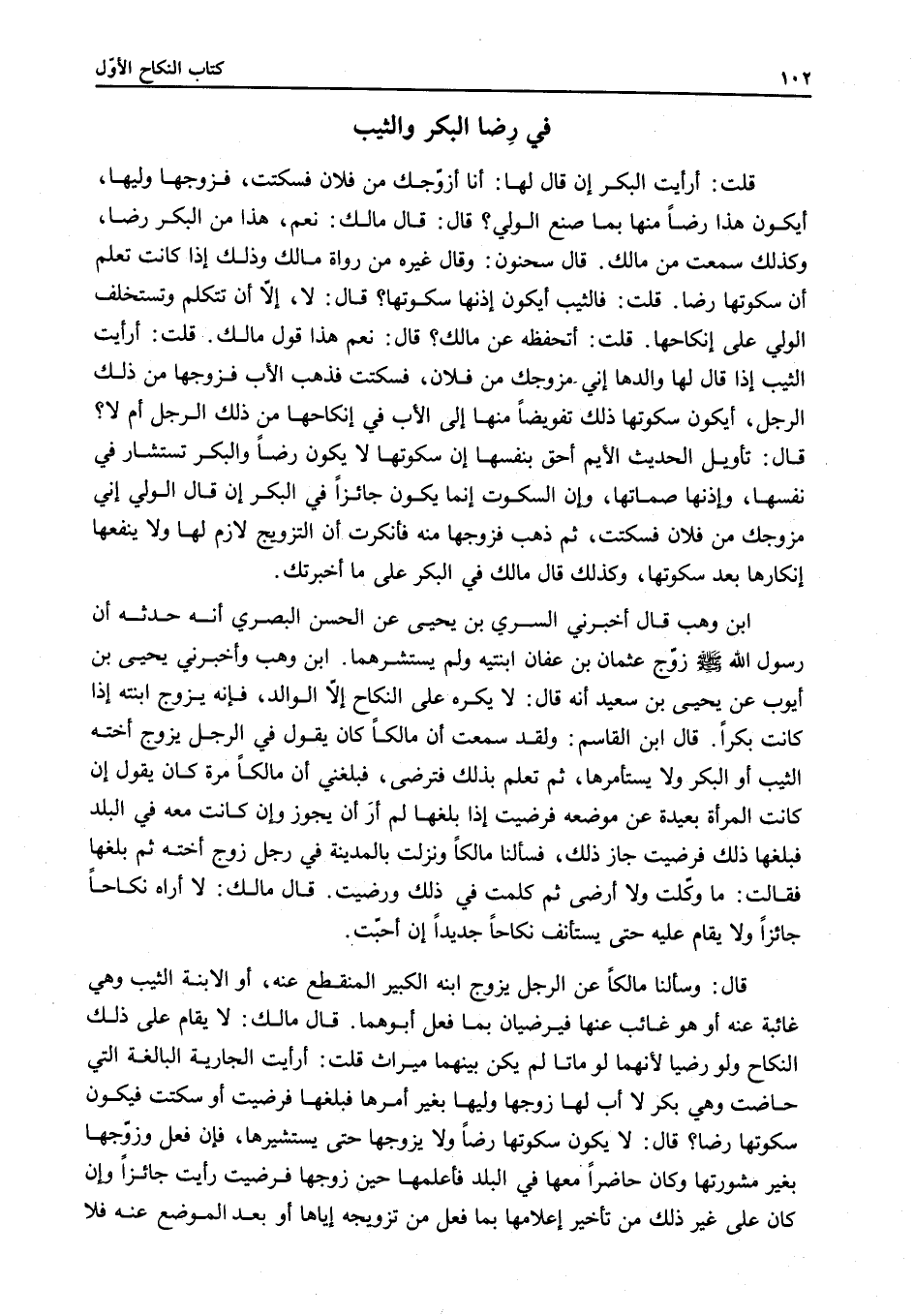 فِي رِضَا الْبِكْرِ وَالثَّيِّبِ قُلْتُ: أَرَأَيْتَ الْبِكْرَ إنْ قَالَ: لَهَا أَنَا أُزَوِّجُك مِنْ فُلَانٍ فَسَكَتَتْ، فَزَوَّجَهَا وَلِيُّهَا، أَيَكُونُ هَذَا رِضًا مِنْهَا بِمَا صَنَعَ الْوَلِيُّ؟ قَالَ: قَالَ مَالِكٌ: نَعَمْ، هَذَا مِنْ الْبِكْرِ رِضًا، وَكَذَلِكَ سَمِعْت مِنْ مَالِكٍ قَالَ سَحْنُونٌ وَقَالَ غَيْرُهُ مِنْ رُوَاةِ مَالِكٍ: وَذَلِكَ إذَا كَانَتْ تَعْلَمُ أَنَّ سُكُوتَهَا رِضًا، قُلْتُ: فَالثَّيِّبُ أَيَكُونُ إذْنُهَا سُكُوتَهَا؟ قَالَ: لَا، إلَّا أَنْ تَتَكَلَّمَ وَتَسْتَخْلِفَ الْوَلِيَّ عَلَى إنْكَاحِهَا قُلْتُ: أَتَحْفَظُهُ عَنْ مَالِكٍ قَالَ: نَعَمْ، هَذَا قَوْلُ مَالِكٍ