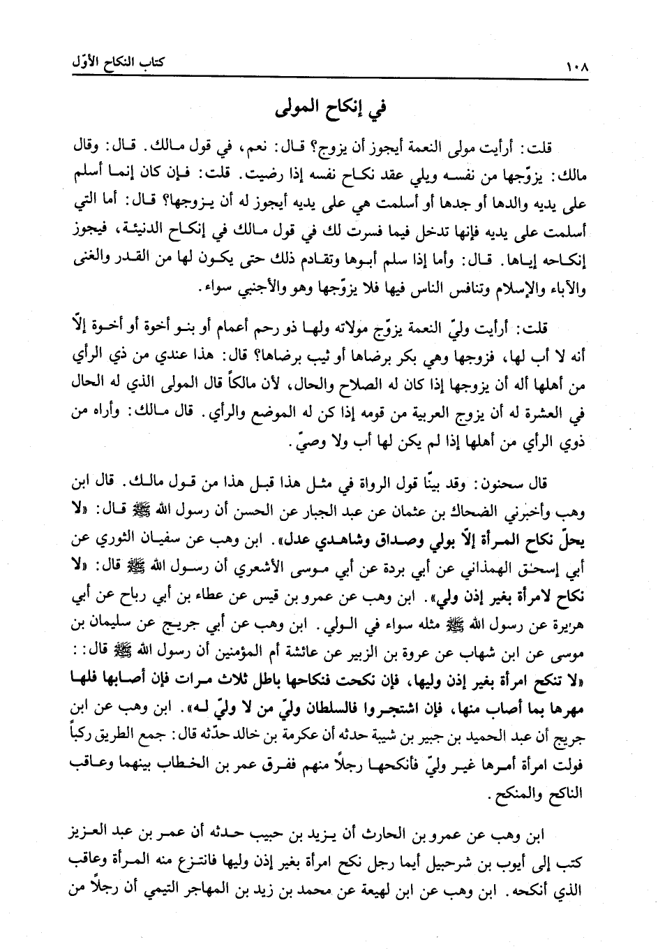 قَالَ سَحْنُونٌ: وَقَدْ بَيَّنَّا قَوْلَ الرُّوَاةِ فِي مِثْلِ هَذَا قَبْلَ هَذَا مِنْ قَوْلِ مَالِكٍ قَالَ ابْنُ وَهْبٍ وَأَخْبَرَنِي الضَّحَّاكُ بْنُ عُثْمَانَ عَنْ عَبْدِ الْجَبَّارِ عَنْ الْحَسَنِ أَنَّ رَسُولَ اللَّهِ - صَلَّى اللَّهُ عَلَيْهِ وَسَلَّمَ - قَالَ: «لَا يَحِلُّ نِكَاحُ الْمَرْأَةِ إلَّا بِوَلِيٍّ وَصَدَاقٍ وَشَاهِدَيْ عَدْلٍ» ابْنُ وَهْبٍ عَنْ سُفْيَانَ الثَّوْرِيِّ عَنْ أَبِي إِسْحَاقَ الْهَمْدَانِيِّ عَنْ أَبِي بُرْدَةَ عَنْ أَبِي مُوسَى الْأَشْعَرِيِّ أَنَّ رَسُولَ اللَّهِ - صَلَّى اللَّهُ عَلَيْهِ وَسَلَّمَ - قَالَ: «لَا نِكَاحَ لِامْرَأَةٍ بِغَيْرِ إذْنِ وَلِيٍّ» ابْنُ وَهْبٍ عَنْ عَمْرِو بْنِ قَيْسٍ عَنْ عَطَاءِ بْنِ أَبِي رَبَاحٍ عَنْ أَبِي هُرَيْرَةَ عَنْ رَسُولِ اللَّهِ - صَلَّى اللَّهُ عَلَيْهِ وَسَلَّمَ - مِثْلُهُ سَوَاءٌ فِي الْوَلِيِّ ابْنُ وَهْبٍ عَنْ أَبِي جُرَيْجٍ عَنْ سُلَيْمَانَ بْنِ مُوسَى عَنْ ابْنِ شِهَابٍ عَنْ عُرْوَةَ بْنِ الزُّبَيْرِ عَنْ عَائِشَةَ أُمِّ الْمُؤْمِنِينَ أَنَّ رَسُولَ اللَّهِ - صَلَّى اللَّهُ عَلَيْهِ وَسَلَّمَ - قَالَ: «لَا تُنْكَحُ امْرَأَةٌ بِغَيْرِ إذْنِ وَلِيِّهَا، فَإِنْ نُكِحَتْ فَنِكَاحُهَا بَاطِلٌ ثَلَاثَ مَرَّاتٍ فَإِنْ أَصَابَهَا فَلَهَا مَهْرُهَا بِمَا أَصَابَ مِنْهَا، فَإِنْ اشْتَجَرُوا فَالسُّلْطَانُ وَلِيُّ مَنْ لَا وَلِيَّ لَهُ» ابْنُ وَهْبٍ عَنْ ابْنِ جُرَيْجٍ أَنَّ عَبْدَ الْحَمِيدِ بْنَ جُبَيْرِ بْنِ شَيْبَةَ حَدَّثَهُ أَنَّ عِكْرِمَةَ بْنِ خَالِدٍ حَدَّثَهُ قَالَ: جَمَعَ الطَّرِيقُ رَكْبًا فَوَلَّتْ امْرَأَةٌ أَمْرَهَا غَيْرَ وَلِيٍّ فَأَنْكَحَهَا رَجُلًا مِنْهُمْ فَفَرَّقَ عُمَرُ بْنُ الْخَطَّابِ بَيْنَهُمَا وَعَاقَبَ النَّاكِحَ وَالْمُنْكِحَ ابْنُ وَهْبٍ عَنْ عَمْرِو بْنِ الْحَارِثِ أَنَّ يَزِيدَ بْنَ حَبِيبٍ حَدَّثَهُ أَنَّ عُمَرَ بْنَ عَبْدِ الْعَزِيزِ كَتَبَ إلَى أَيُّوبَ بْنِ شُرَحْبِيلَ أَيُّمَا رَجُلٍ نَكَحَ امْرَأَةً بِغَيْرِ إذْنِ وَلِيِّهَا فَانْتَزِعْ مِنْهُ الْمَرْأَةَ وَعَاقِبْ الَّذِي أَنْكَحَهُ.