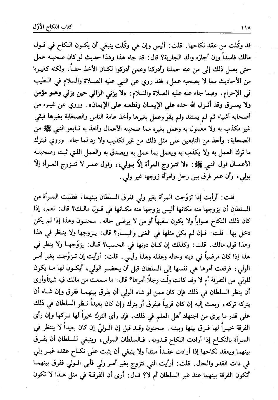 قُلْتُ: أَرَأَيْت إنْ تَزَوَّجَتْ بِغَيْرِ أَمْرِ الْوَلِيِّ، فَرَفَعَتْ أَمْرَهَا هِيَ نَفْسُهَا إلَى السُّلْطَانِ قَبْلَ أَنْ يَحْضُرَ الْوَلِيُّ، أَيَكُونُ لَهَا مَا يَكُونُ لِلْوَلِيِّ مِنْ التَّفْرِقَةِ أَمْ لَا وَقَدْ كَانَتْ وَلَّتْ رَجُلًا أَمَرَهَا؟ قَالَ: مَا سَمِعْت مِنْ مَالِكٍ فِيهِ شَيْئًا وَأَرَى أَنْ يَنْظُرَ السُّلْطَانُ فِي ذَلِكَ فَإِنْ كَانَ مِمَّنْ لَوْ شَاءَ الْوَلِيُّ أَنْ يُفَرِّقَ بَيْنَهُمَا فَفَرَّقَ وَإِنْ شَاءَ أَنْ يَتْرُكَهُ تَرَكَهُ، وَبَعَثَ إلَيْهِ إنْ كَانَ قَرِيبًا فَيُفَرِّقُ أَوْ يَتْرُكُ وَإِنْ كَانَ بَعِيدًا نَظَرَ السُّلْطَانُ فِي ذَلِكَ عَلَى قَدْرِ مَا يَرَى مِنْ اجْتِهَادِ أَهْلِ الْعِلْمِ فِي ذَلِكَ، فَإِنْ رَأَى التَّرْكَ خَيْرًا لَهَا تَرَكَهَا وَإِنْ رَأَى الْفُرْقَةَ خَيْرًا لَهَا فَرَّقَ بَيْنَهَا وَبَيْنَهُ سَحْنُونٌ وَقَدْ قِيلَ إنَّ الْوَلِيَّ إنْ كَانَ بَعِيدًا لَا يُنْتَظَرُ فِي الْمَرْأَةِ بِالنِّكَاحِ إذَا أَرَادَتْ النِّكَاحَ قُدُومُهُ، فَالسُّلْطَانُ الْمُوَلَّى، وَيَنْبَغِي لِلسُّلْطَانِ أَنْ يُفَرِّقَ بَيْنَهُمَا وَيَعْقِدَ نِكَاحَهَا إذَا أَرَادَتْ عَقْدًا مُبْتَدَأً وَلَا يَنْبَغِي أَنْ يَثْبُتَ عَلَى نِكَاحِ عَقْدِهِ غَيْرُ وَلِيٍّ فِي ذَاتِ الْقَدْرِ وَالْحَالِ