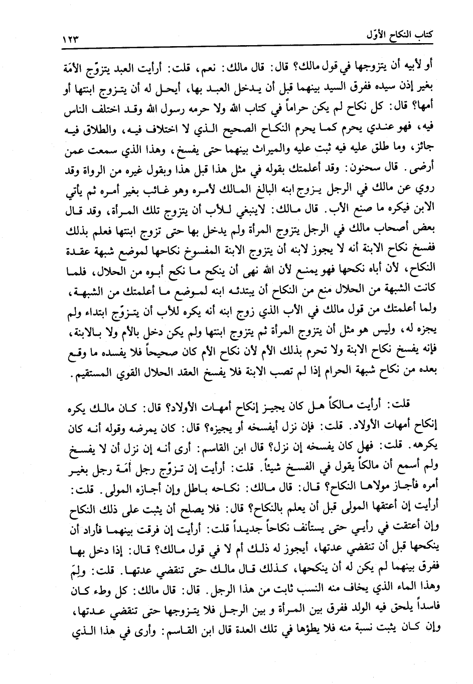 قَالَ: قَالَ مَالِكٌ: نَعَمْ، قُلْتُ: أَرَأَيْتَ الْعَبْدَ يَتَزَوَّجُ الْأَمَةَ بِغَيْرِ إذْنِ سَيِّدِهِ فَفَرَّقَ السَّيِّدُ بَيْنَهُمَا قَبْلَ أَنْ يَدْخُلَ الْعَبْدُ بِهَا، أَيَحِلُّ لَهُ أَنْ يَتَزَوَّجَ ابْنَتَهَا أَوْ أُمَّهَا؟ قَالَ: كُلُّ نِكَاحٍ لَمْ يَكُنْ حَرَامًا فِي كِتَابِ اللَّهِ وَلَا حَرَّمَهُ رَسُولُ اللَّهِ وَقَدْ اخْتَلَفَ النَّاسُ فِيهِ فَهُوَ عِنْدِي يَحْرُمُ كَمَا يَحْرُمُ النِّكَاحُ الصَّحِيحُ الَّذِي لَا اخْتِلَافَ فِيهِ، وَالطَّلَاقُ فِيهِ جَائِزٌ، وَمَا طَلَّقَ عَلَيْهِ فِيهِ ثَبَتَ عَلَيْهِ وَالْمِيرَاثُ بَيْنَهُمَا حَتَّى يَفْسَخَ، وَهَذَا الَّذِي سَمِعْت عَمَّنْ أَرْضَى قَالَ سَحْنُونٌ: وَقَدْ أَعْلَمْتُك بِقَوْلِهِ فِي مِثْلِ هَذَا قَبْلَ هَذَا وَبِقَوْلِ غَيْرِهِ مِنْ الرُّوَاةِ وَقَدْ رُوِيَ عَنْ مَالِكٍ فِي الرَّجُلِ يُزَوِّجُ ابْنَهُ الْبَالِغَ الْمَالِكَ لِأَمْرِهِ وَهُوَ غَائِبٌ بِغَيْرِ أَمَرَهُ ثُمَّ يَأْتِي الِابْنُ فَيَكْرَهُ مَا صَنَعَ الْأَبُ قَالَ مَالِكٌ: لَا يَنْبَغِي لِلْأَبِ أَنْ يَتَزَوَّجَ تِلْكَ الْمَرْأَةَ، وَقَدْ قَالَ بَعْضُ أَصْحَابِ مَالِكٍ فِي الرَّجُلِ يَتَزَوَّجُ الْمَرْأَةَ وَلَمْ يَدْخُلْ بِهَا حَتَّى تَزَوَّجَ ابْنَتَهَا فَعُلِمَ بِذَلِكَ فَفُسِخَ نِكَاحُ الِابْنَةِ أَنَّهُ لَا يَجُوزُ لِابْنِهِ أَنْ يَتَزَوَّجَ الِابْنَةَ الْمَفْسُوخَ نِكَاحُهَا لِمَوْضِعِ شُبْهَةِ عُقْدَةِ النِّكَاحِ؛ لِأَنَّ أَبَاهُ نَكَحَهَا فَهُوَ يُمْنَعُ؛ لِأَنَّ اللَّهَ نَهَى أَنْ يَنْكِحَ مَا نَكَحَ أَبُوهُ مِنْ الْحَلَالِ، فَلَمَّا كَانَتْ الشُّبْهَةُ مِنْ الْحَلَالِ مَنَعَ مِنْ النِّكَاحِ أَنْ يَبْتَدِئَهُ ابْنُهُ لِمَوْضِعِ مَا أَعْلَمْتُك مِنْ الشُّبْهَةِ، وَلِمَا أَعْلَمْتُك مِنْ قَوْلِ مَالِكٍ فِي الْأَبِ الَّذِي زَوَّجَ ابْنَهُ أَنَّهُ يُكْرَهُ لِلْأَبِ أَنْ يَتَزَوَّجَ ابْتِدَاءً وَلَمْ يُجِزْهُ لَهُ، وَلَيْسَ هُوَ مِثْلَ أَنْ يَتَزَوَّجَ الْمَرْأَةَ ثُمَّ يَتَزَوَّجَ ابْنَتَهَا وَلَمْ يَكُنْ دَخَلَ بِالْأُمِّ وَلَا بِالِابْنَةِ، فَإِنَّهُ يَفْسَخُ نِكَاحَ الِابْنَةِ وَلَا تَحْرُمُ بِذَلِكَ الْأُمُّ لِأَنَّ نِكَاحَ الْأُمِّ كَانَ صَحِيحًا فَلَا يُفْسِدُهُ مَا وَقَعَ بَعْدَهُ مِنْ نِكَاحِ شُبْهَةِ الْحَرَامِ إذَا لَمْ تُصَبْ الِابْنَةُ فَلَا يُفْسَخُ الْعَقْدُ الْحَلَالُ الْقَوِيُّ الْمُسْتَقِيمُ.