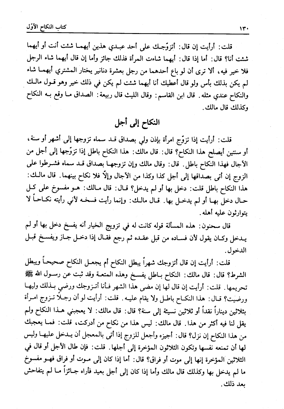 ٍ قُلْتُ: أَرَأَيْتَ إذَا تَزَوَّجَ امْرَأَةً بِإِذْنِ وَلِيٍّ بِصَدَاقٍ قَدْ سَمَّاهُ تَزَوَّجَهَا إلَى أَشْهُرٍ أَوْ سَنَةٍ، أَوْ سَنَتَيْنِ أَيَصْلُحُ هَذَا النِّكَاحُ؟ قَالَ: قَالَ مَالِكٌ: هَذَا النِّكَاحُ بَاطِلٌ إذَا تَزَوَّجَهَا إلَى أَجَلٍ مِنْ الْآجَالِ فَهَذَا النِّكَاحُ بَاطِلٌ قَالَ: وَقَالَ مَالِكٌ وَإِنْ تَزَوَّجَهَا بِصَدَاقٍ قَدْ سَمَّاهُ فَشَرَطُوا عَلَى الزَّوْجِ إنْ أَتَى بِصَدَاقِهَا إلَى أَجَلِ كَذَا وَكَذَا مِنْ الْآجَالِ وَإِلَّا فَلَا نِكَاحَ بَيْنَهُمَا قَالَ مَالِكٌ: هَذَا النِّكَاحُ بَاطِلٌ قُلْتُ: دَخَلَ بِهَا أَوْ لَمْ يَدْخُلْ؟