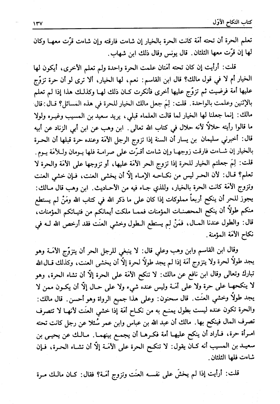 وَقَالَ ابْنُ الْقَاسِمِ وَابْنُ وَهْبٍ وَعَلِيٌّ قَالَ: لَا يَنْبَغِي لِلرَّجُلِ الْحُرِّ أَنْ يَتَزَوَّجَ الْأَمَةَ وَهُوَ يَجِدُ طَوْلًا لِحُرَّةٍ وَلَا يَتَزَوَّجُ أَمَةً إذَا لَمْ يَجِدْ طَوْلًا لِحُرَّةٍ إلَّا أَنْ يَخْشَى الْعَنَتَ، وَكَذَلِكَ قَالَ اللَّهُ تَبَارَكَ وَتَعَالَى وَقَالَ ابْنُ نَافِعٍ عَنْ مَالِكٍ: لَا تُنْكَحُ الْأَمَةُ عَلَى الْحُرَّةِ إلَّا أَنْ تَشَاءَ الْحُرَّةُ، وَهُوَ لَا يَنْكِحُهَا عَلَى حُرَّةٍ وَلَا عَلَى أَمَةٍ وَلَيْسَ عِنْدَهُ شَيْءٌ وَلَا عَلَى حَالٍ إلَّا أَنْ يَكُونَ مِمَّنْ لَا يَجِدُ طَوْلًا وَخَشِيَ الْعَنَتَ قَالَ سَحْنُونٌ: وَعَلَى هَذَا جَمِيعُ الرُّوَاةِ وَهُوَ أَحْسَنُ، قَالَ مَالِكٌ: وَالْحُرَّةُ تَكُونُ عِنْدَهُ لَيْسَتْ بِطَوْلٍ يُمْنَعُ بِهِ مِنْ نِكَاحِ أَمَةٍ إذَا خَشِيَ الْعَنَتَ؛ لِأَنَّهَا لَا تَتَصَرَّفُ تَصَرُّفَ الْمَالِ فَيَنْكِحُ بِهَا. مَالِكٌ أَنَّ عَبْدَ اللَّهِ بْنَ عَبَّاسٍ وَابْنَ عُمَرَ سُئِلَا عَنْ رَجُلٍ كَانَتْ تَحْتَهُ امْرَأَةٌ حُرَّةٌ، فَأَرَادَ أَنْ يَنْكِحَ عَلَيْهَا أَمَةً فَكَرِهَا أَنْ يَجْمَعَ بَيْنَهُمَا مَالِكٌ عَنْ يَحْيَى بْنِ سَعِيدِ بْنِ الْمُسَيِّبِ أَنَّهُ كَانَ يَقُولُ: لَا تُنْكَحُ الْحُرَّةُ عَلَى الْأَمَةِ إلَّا أَنْ تَشَاءَ الْحُرَّةُ، فَإِنْ شَاءَتْ فَلَهَا الثُّلُثَانِ.