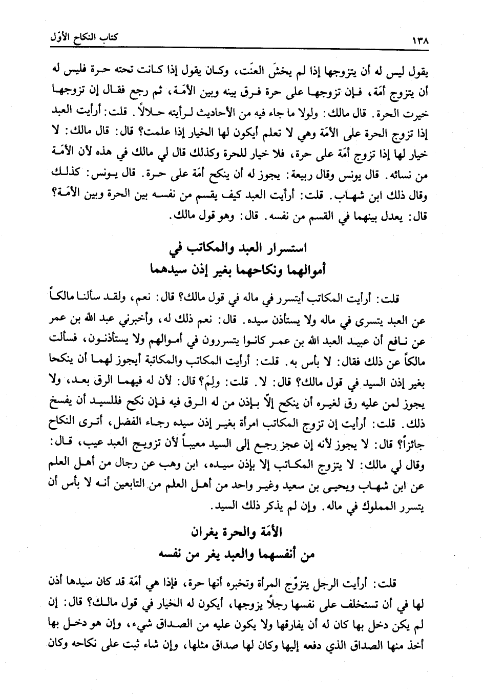 قُلْتُ: أَرَأَيْتَ إنْ تَزَوَّجَ الْمُكَاتَبُ امْرَأَةً بِغَيْرِ إذْنِ سَيِّدِهِ رَجَاءَ الْفَضْلِ، أَتَرَى النِّكَاحَ جَائِزًا؟ قَالَ: لَا يَجُوزُ؛ لِأَنَّهُ إنْ عَجَزَ رَجَعَ إلَى السَّيِّدِ مَعِيبًا؛ لِأَنَّ تَزْوِيجَ الْعَبْدِ عَيْبٌ، قَالَ: وَقَالَ لِي مَالِكٌ: لَا يَتَزَوَّجُ الْمُكَاتَبُ إلَّا بِإِذْنِ سَيِّدِهِ ابْنُ وَهْبٍ عَنْ رِجَالٍ مِنْ أَهْلِ الْعِلْمِ عَنْ ابْنِ شِهَابٍ وَيَحْيَى بْنِ سَعِيدٍ وَغَيْرِ وَاحِدٍ مِنْ أَهْلِ الْعِلْمِ مِنْ التَّابِعِينَ أَنَّهُ لَا بَأْسَ أَنْ يَتَسَرَّرَ الْمَمْلُوكُ فِي مَالِهِ وَإِنْ لَمْ يَذْكُرْ ذَلِكَ السَّيِّدُ.