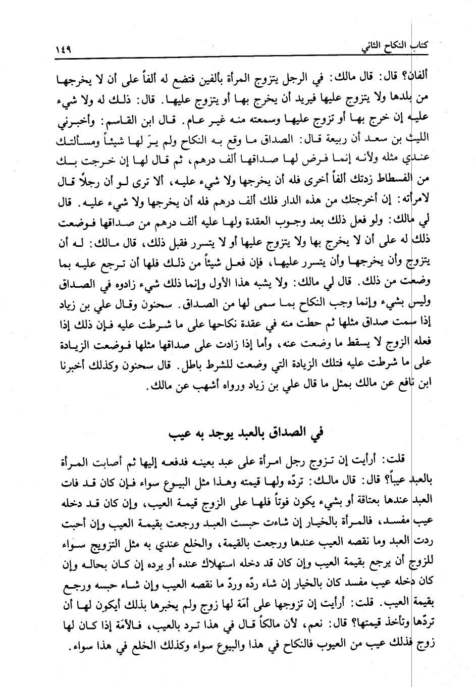 فِي الصَّدَاقِ بِالْعَبْدِ يُوجَدُ بِهِ عَيْبٌ قُلْتُ: أَرَأَيْتَ إنْ تَزَوَّجَ رَجُلٌ امْرَأَةً عَلَى عَبْدٍ بِعَيْنِهِ فَدَفَعَهُ إلَيْهَا ثُمَّ أَصَابَتْ الْمَرْأَةُ بِالْعَبْدِ عَيْبًا؟ قَالَ: قَالَ مَالِكٌ: تَرُدُّ وَلَهَا قِيمَتُهُ وَهَذَا مِثْلُ الْبُيُوعِ سَوَاءٌ، فَإِنْ كَانَ قَدْ فَاتَ الْعَبْدُ عِنْدَهَا بِعَتَاقَةٍ أَوْ بِشَيْءٍ يَكُونُ فَوْتًا فَلَهَا عَلَى الزَّوْجِ قِيمَةُ الْعَيْبِ، وَإِنْ كَانَ قَدْ دَخَلَهُ عَيْبٌ مُفْسِدٌ، فَالْمَرْأَةُ بِالْخِيَارِ إنْ شَاءَتْ حَبَسَتْ الْعَبْدَ وَرَجَعَتْ بِقِيمَةِ الْعَيْبِ وَإِنْ أَحَبَّتْ رَدَّتْ الْعَبْدَ وَمَا نَقَصَهُ الْعَيْبُ عِنْدَهَا وَرَجَعَتْ بِالْقِيمَةِ، وَالْخُلْعُ عِنْدِي بِهِ مِثْلُ التَّزْوِيجِ سَوَاءٌ، لِلزَّوْجِ أَنْ يَرْجِعَ بِقِيمَةِ الْعَيْبِ وَإِنْ كَانَ قَدْ دَخَلَهُ اسْتِهْلَاكٌ عِنْدَهُ أَوْ يَرُدَّهُ إنْ كَانَ بِحَالِهِ وَإِنْ كَانَ دَخَلَهُ عَيْبٌ مُفْسِدٌ كَانَ بِالْخِيَارِ إنْ شَاءَ رَدَّهُ وَرَدَّ مَا نَقَصَهُ الْعَيْبُ وَإِنْ شَاءَ حَبَسَهُ وَرَجَعَ بِقِيمَةِ الْعَيْبِ