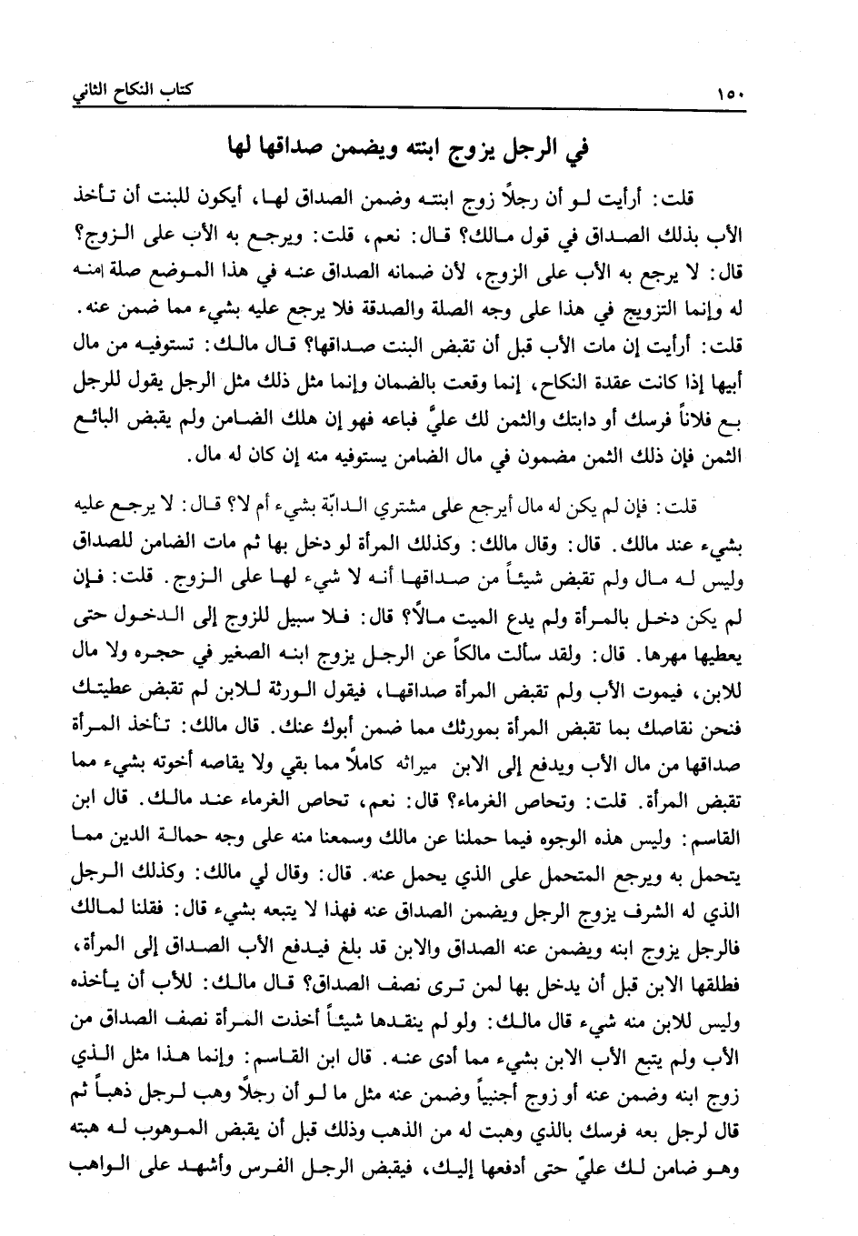 فِي الرَّجُلِ يُزَوِّجُ ابْنَتَهُ وَيَضْمَنُ صَدَاقَهَا لَهَا قُلْتُ: أَرَأَيْتَ لَوْ أَنَّ رَجُلًا زَوَّجَ ابْنَتَهُ وَضَمِنَ الصَّدَاقَ لَهَا، أَيَكُونُ لِلْبِنْتِ أَنْ تَأْخُذَ الْأَبَ بِذَلِكَ الصَّدَاقِ فِي قَوْلِ مَالِكٍ؟